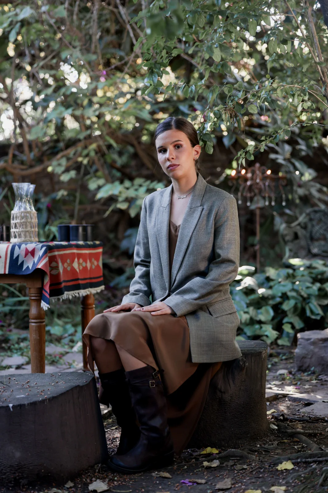 Saco London escoces, 100% lana, tonos marrón, talle recto con un botón, solapa angosta. Caida altuna cadera.