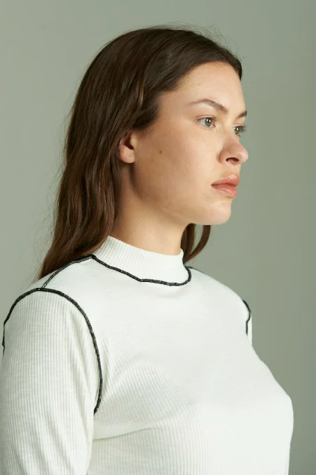 La camiseta Sina es perfecta para la atemporalidad. Camiseta de manga larga suave, fina y de algodón, en color blanco con acabados en negro. El cuello cisne es perfecto para una camiseta de manga larga básica como fondo de armario.