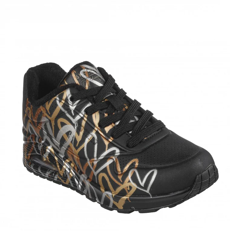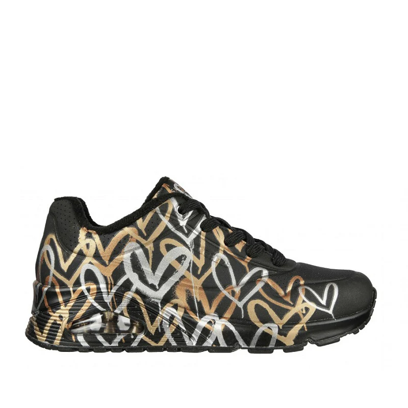 Sneakers de mujer de la marca Skechers modelo Uno-Metallic Lover en color negro. Esta moderna zapatilla con cordones luce el característico estampado de grafiti de corazones del artista en tonos metálicos que se extiende a la suela y cuenta con una parte superior de durabuck sintético con ribete perforado, una plantilla Skechers Air-Cooled Memory Foam® y una media suela de cuña de plataforma.