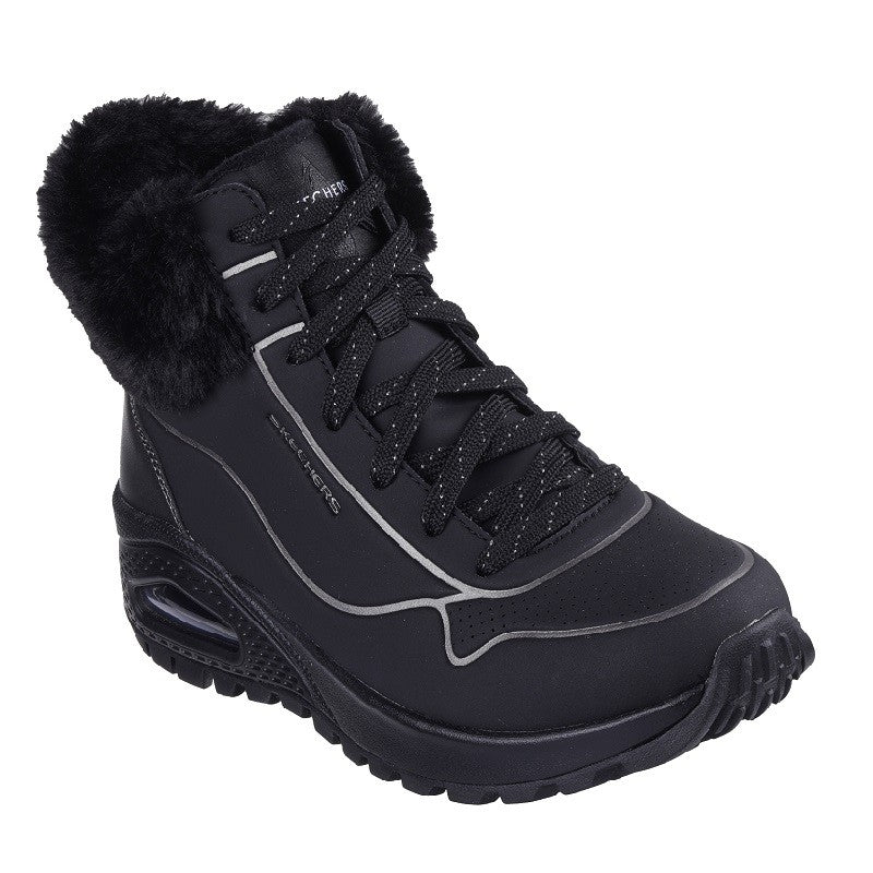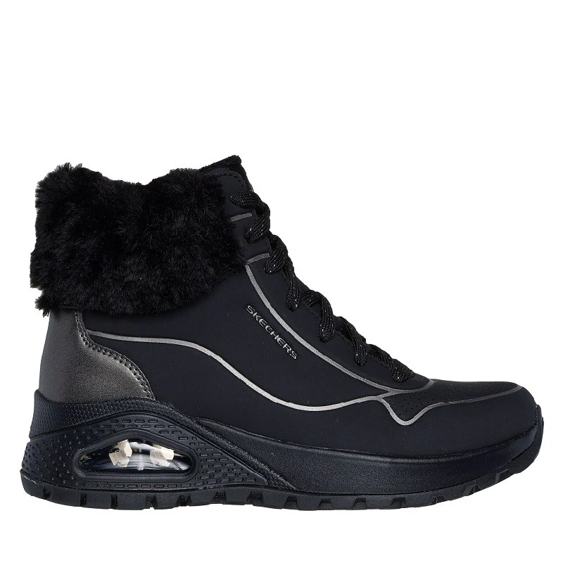 Las Skechers Uno Rugged- Fall Shimmer combinan el estilo del clima frío y la comodidad deportiva. Esta bota sneaker con cordones y cremallera en el lateral cuenta con una parte superior de durabuck con ribete metálico en el talón y detalles en bajorrelieve, cuello y forro de pelo sintético, media suela con cámara de aire visible Skech-Air® y plantilla Skechers Air-Cooled Memory Foam® con amortiguación.