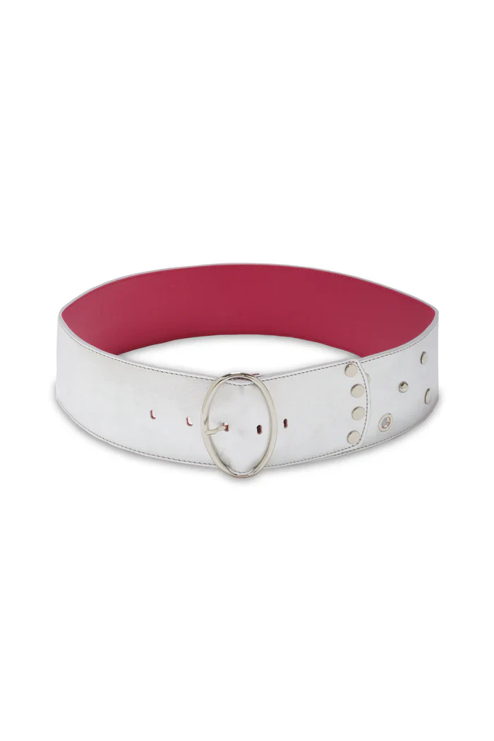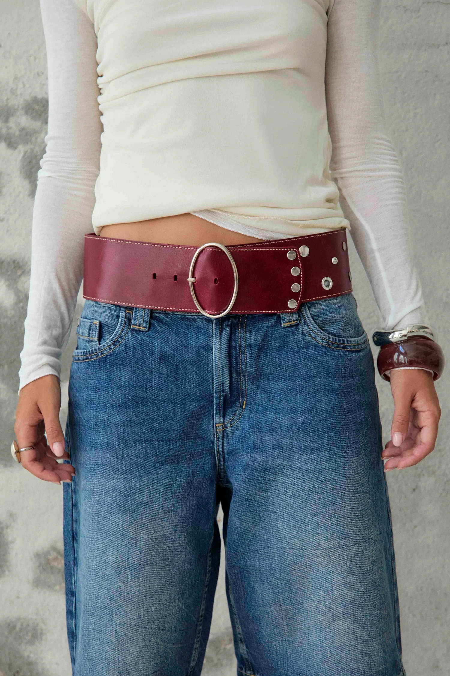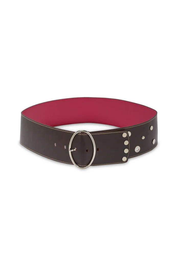 Cinturón granate de piel y tachuelas plateadas. Contiene un forro interior fucsia de piel.