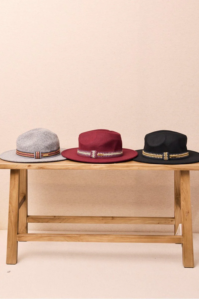 Sombrero de fieltro de ala ancha con cinta bordada de aire artesanal. Su silueta estructurada y el detalle étnico lo convierten en el aliado perfecto para dar personalidad a los días fríos.