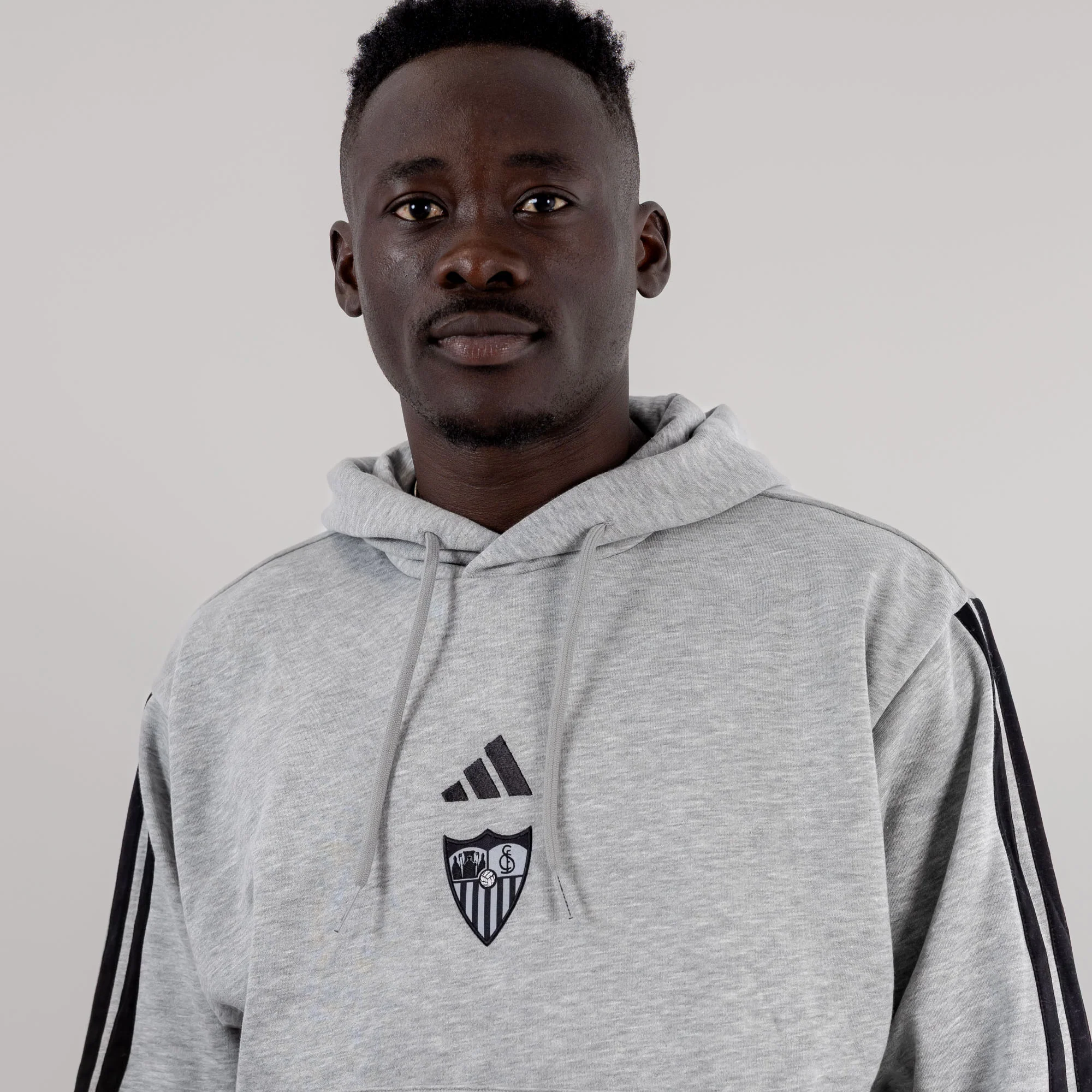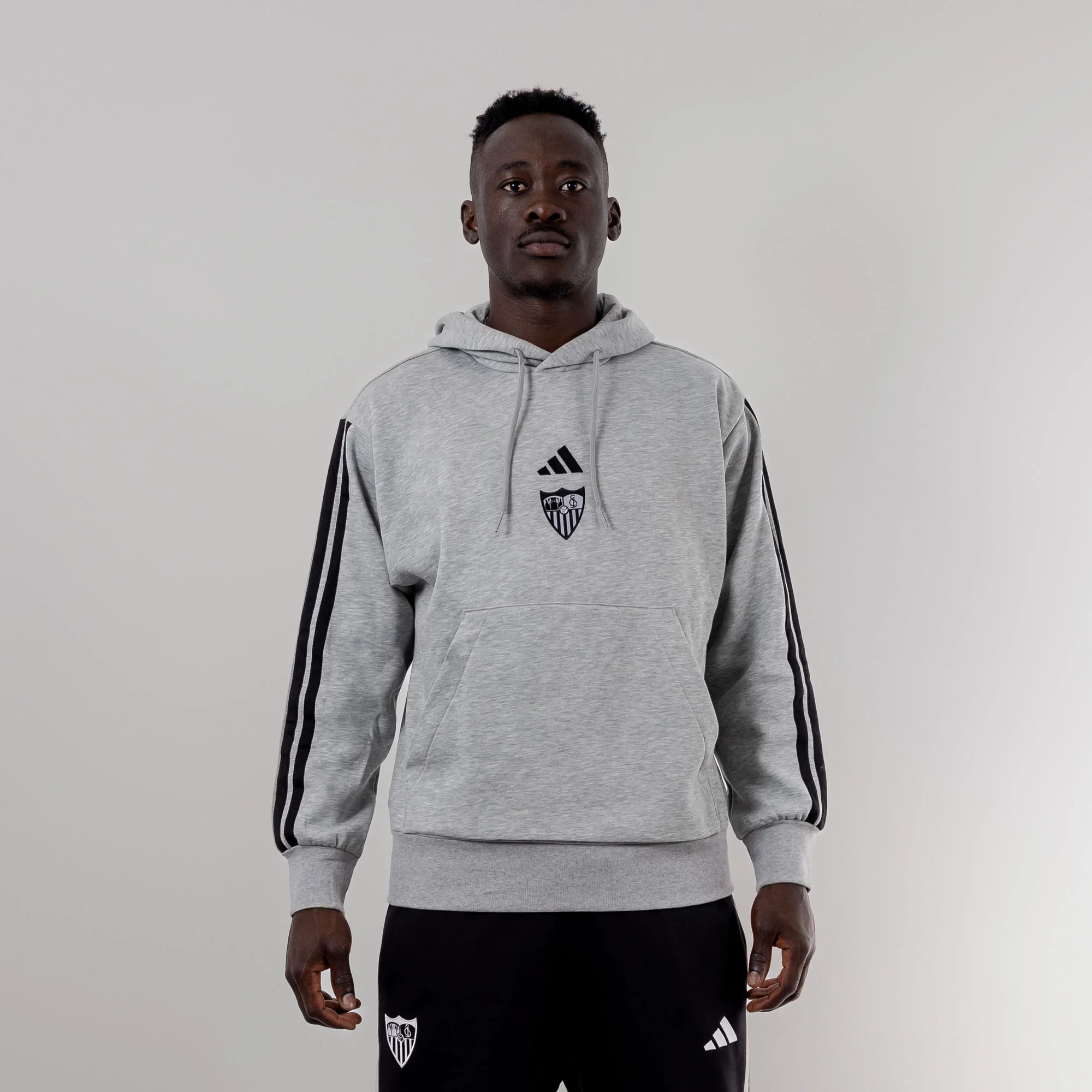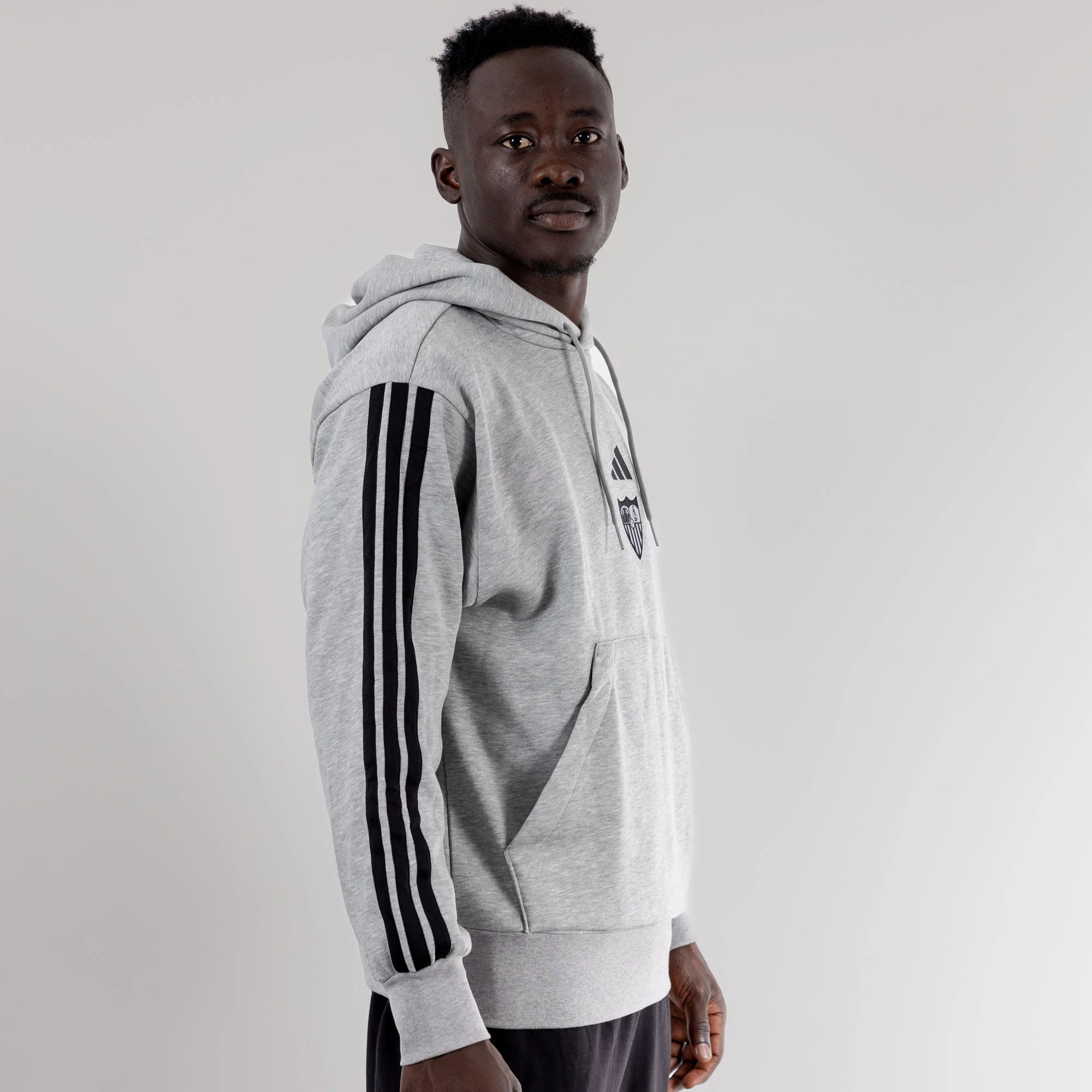 La sudadera gris para adultos, con capucha, bolsillos de canguro y cordón ajustable en la capucha. Colección Oficial del Sevilla Fútbol Club para la temporada 25/26. Lúcela en ocasiones casual con su elegante diseño con detalles laterales, sponsor técnico y escudo serigrafiados en negro en el pecho.