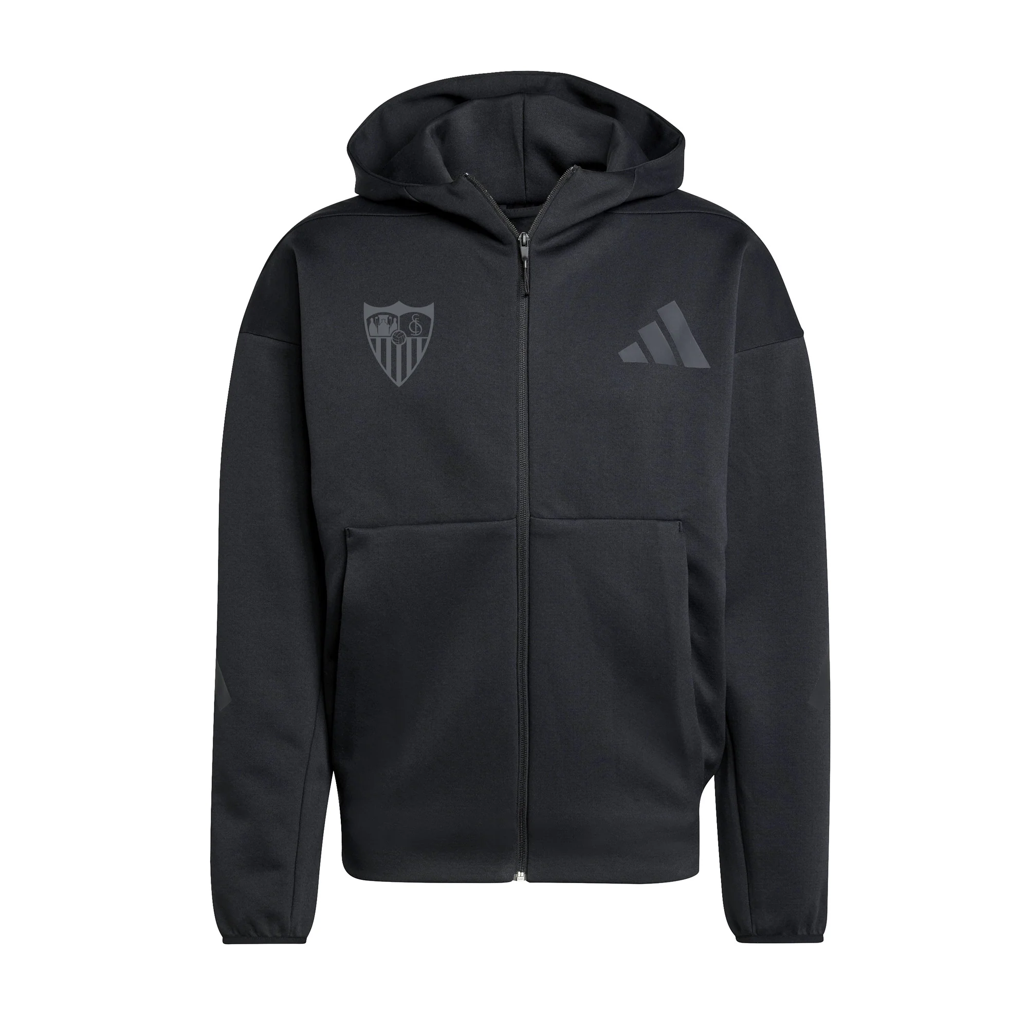 La sudadera negra para adultos, chaqueta con capucha y cremallera completa , de la Colección Oficial del Sevilla Fútbol Club para la temporada 25/26.