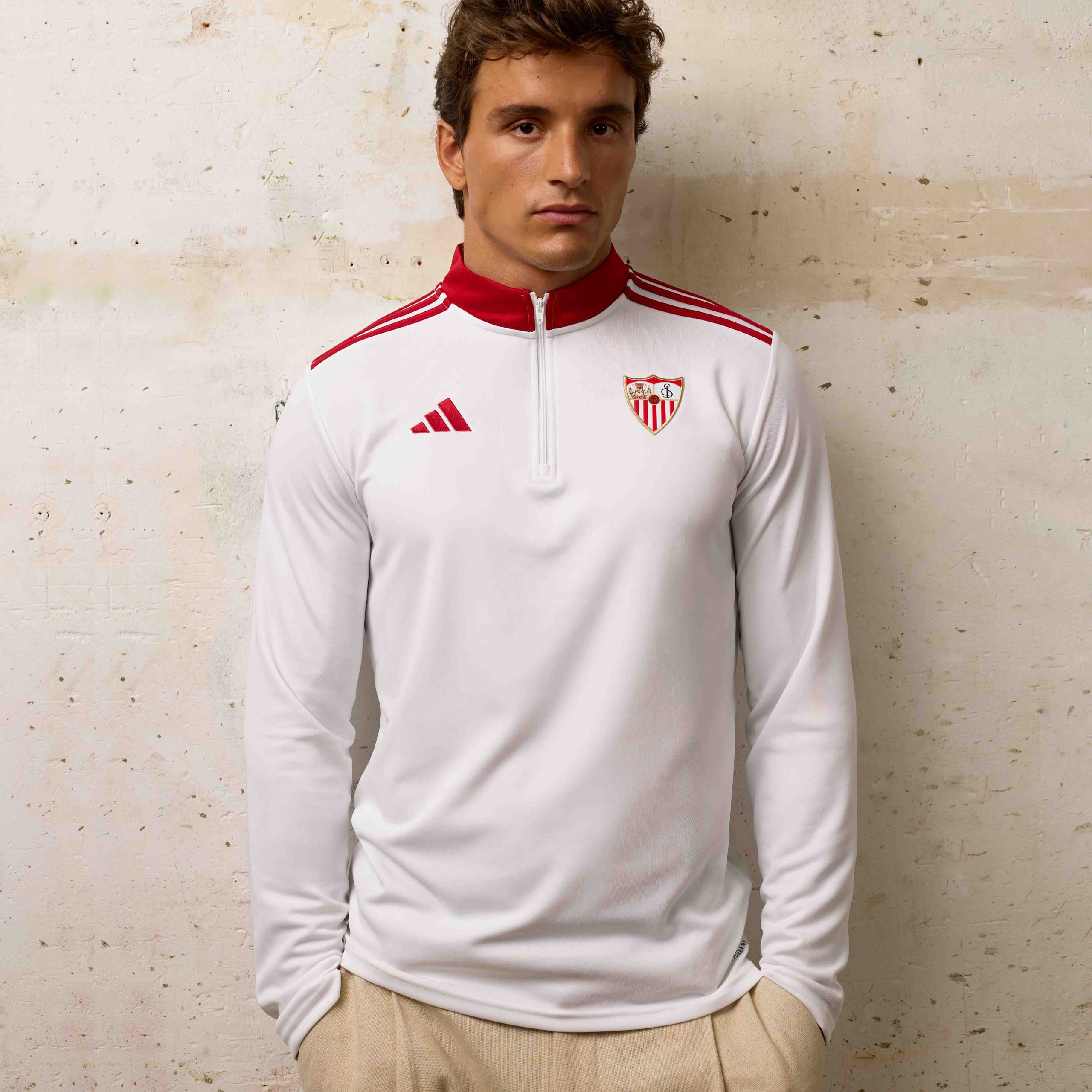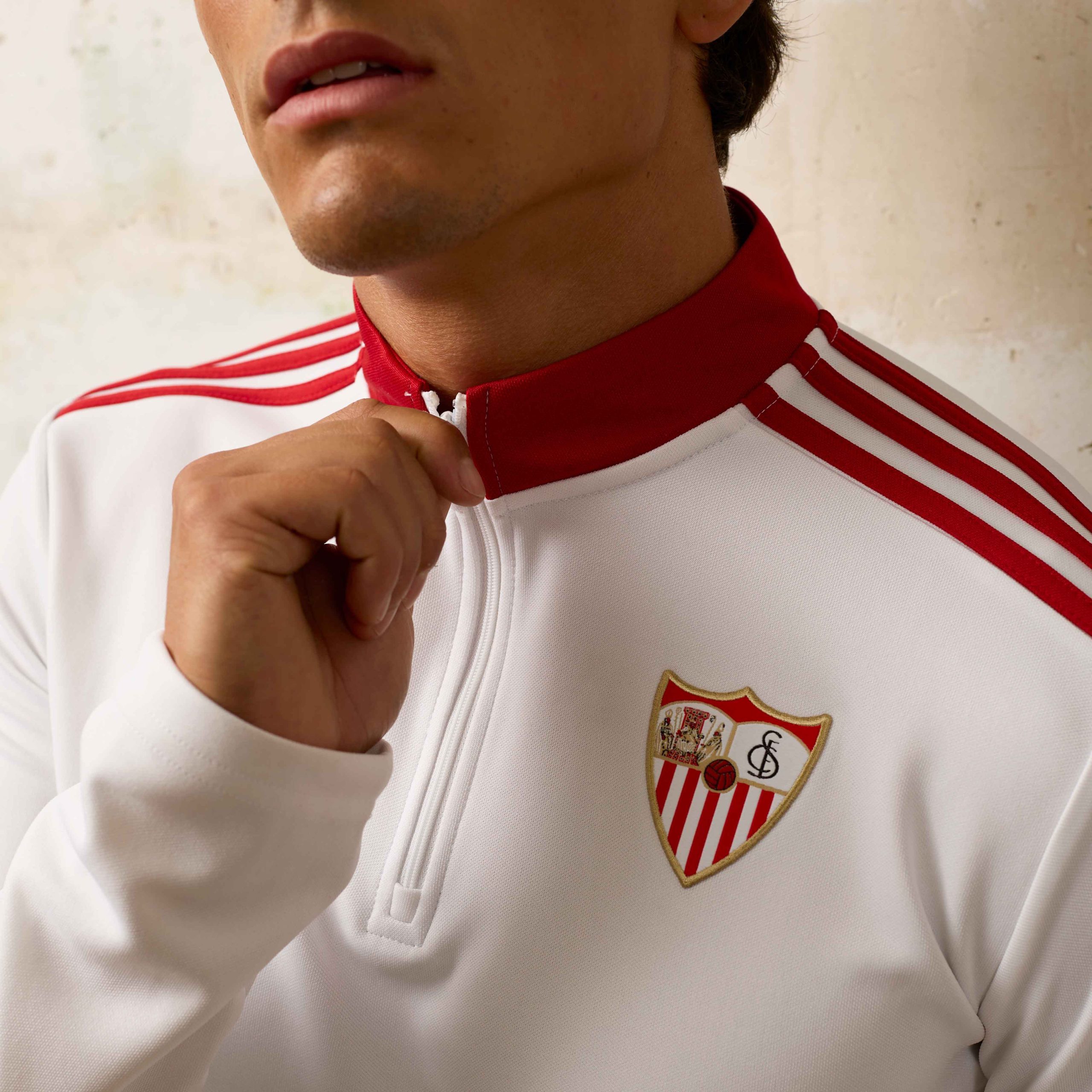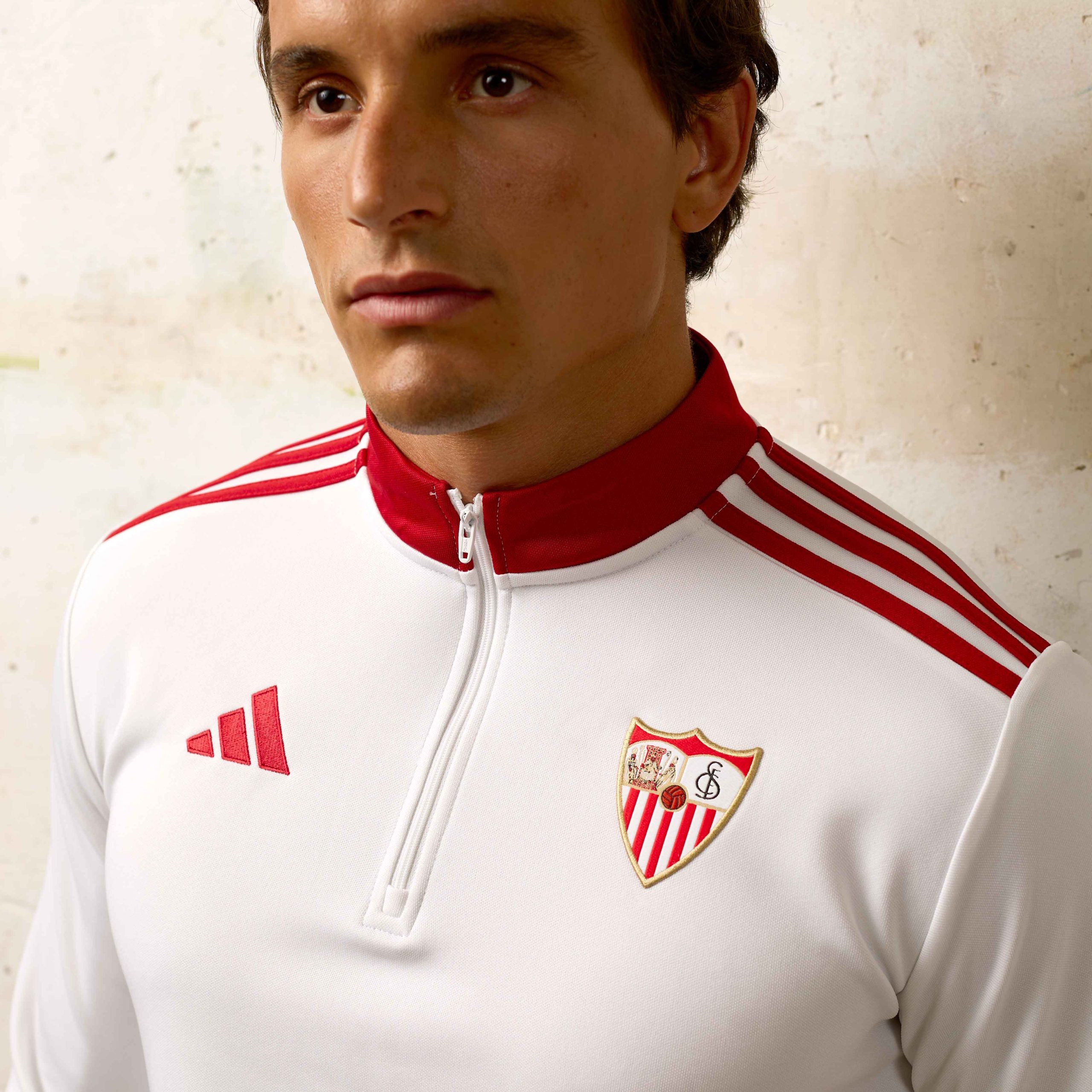 Sudadera prematch de entrenamiento para adultos, la misma que visten los jugadores del Sevilla Fútbol Club durante los prepartidos de la temporada 25/26, sudadera blanca con detalles rojos en los hombros y con el escudo del Sevilla FC en rojo y blanco sobre el pecho. ¡Imprescindible.