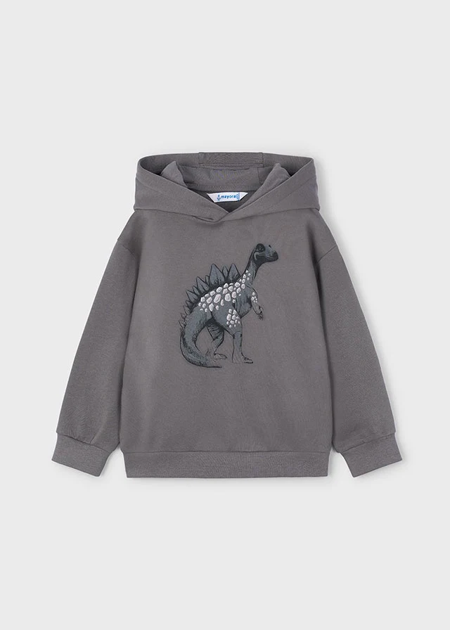Sudadera de cuello redondo con capucha, manga larga con elastico en puños, bolsillo frontal y con dibujo de dinosaurio engomado.