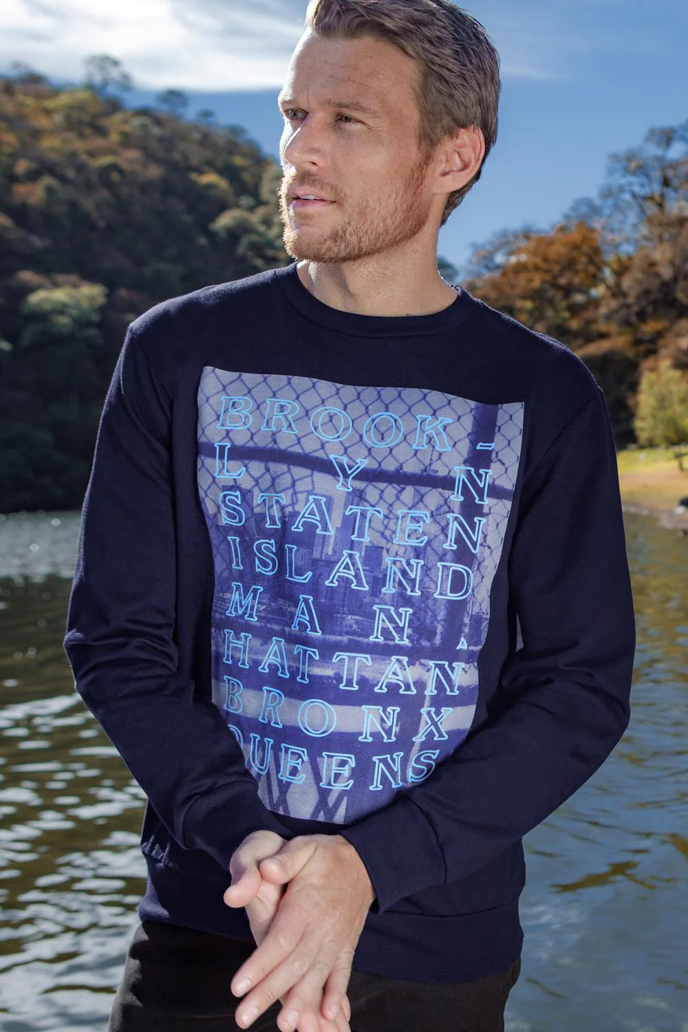 • Sudadera con cuello redondo, serigrafía en delantero y mangas largas.