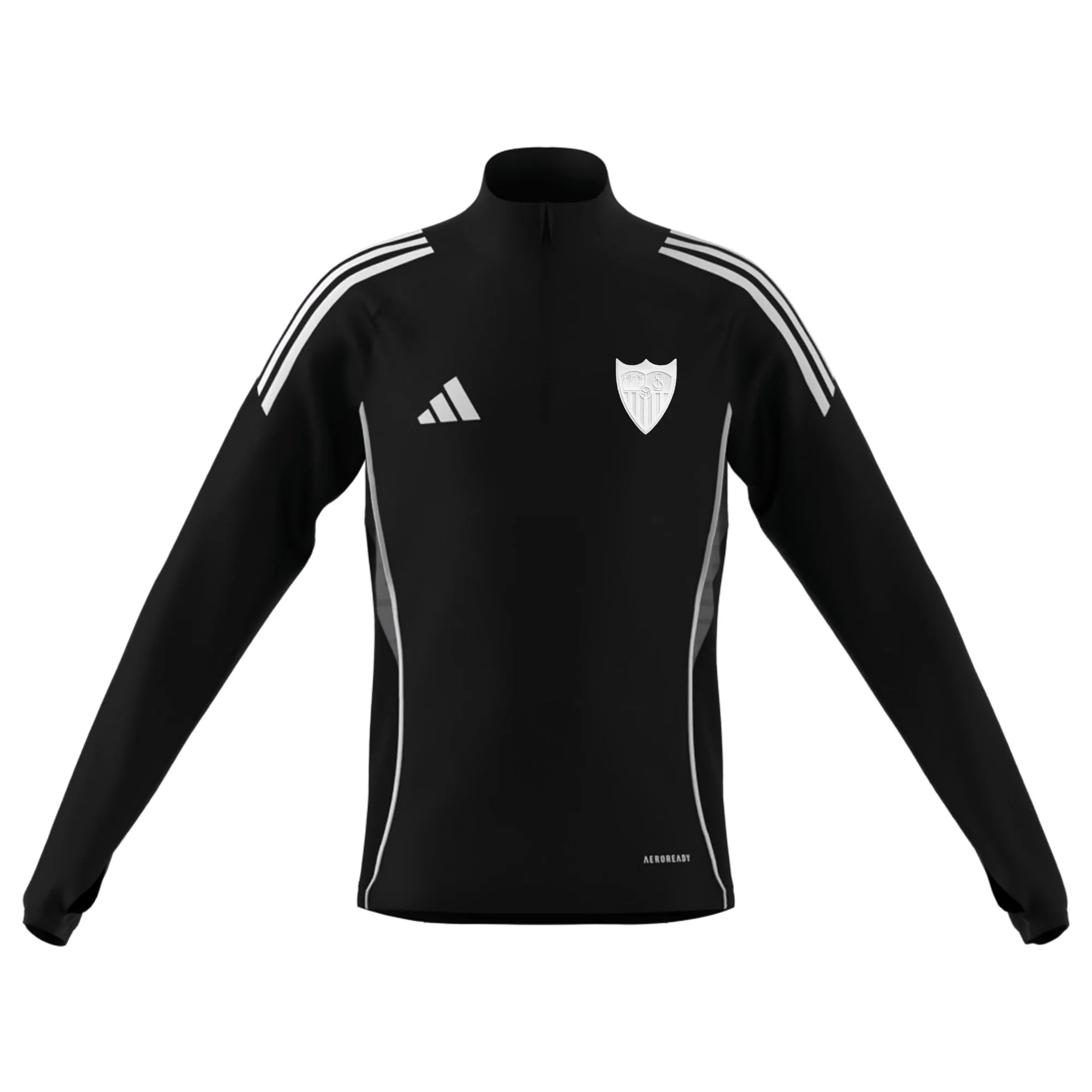 Perteneciente a la Colección Oficial de Entrenamiento del Sevilla Fútbol Club para la temporada 25/26, esta sudadera presenta un diseño especial y original, en color predominantemente negro, detalles laterales blancos y en mangas y logo de sponsor técnico y escudo del Club en blanco sobre el pecho.