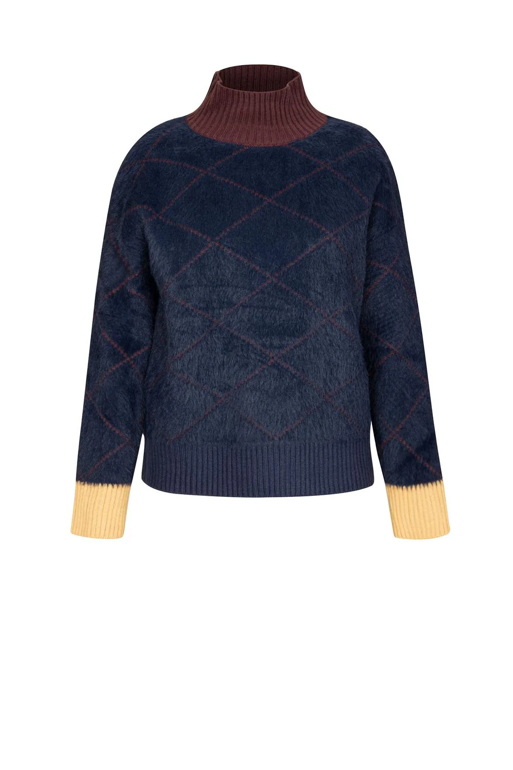 Suéter de pelo sintético con tacto suave, cuello alto, diseño de rombos, mangas largas y rib puños en contraste de color. 13-0600