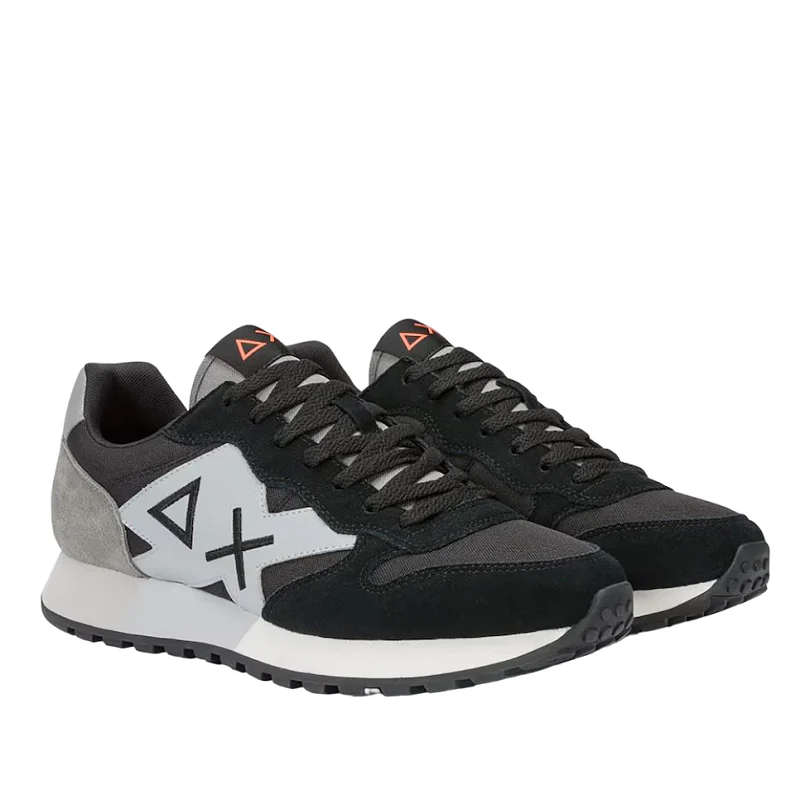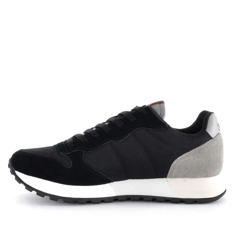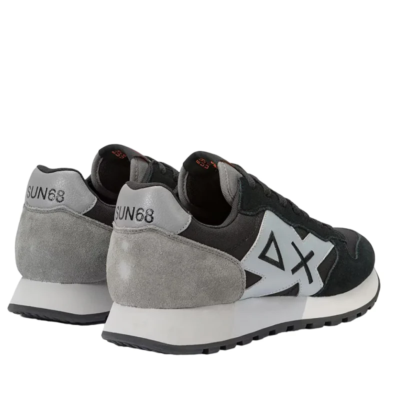 Zapatilla deportiva con cordones , color negro con doble logo lateral gris y negro , suela en gris y blanco.