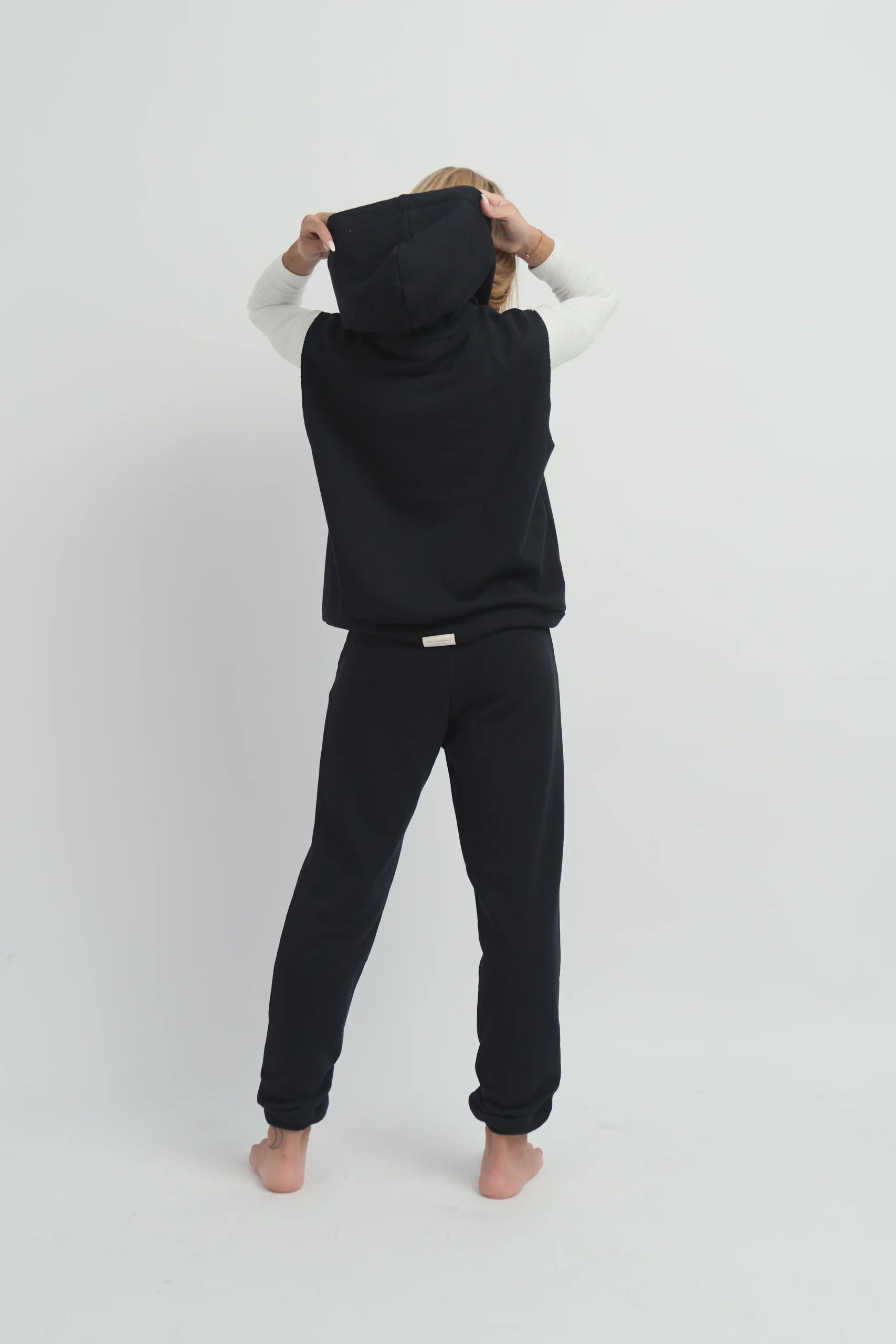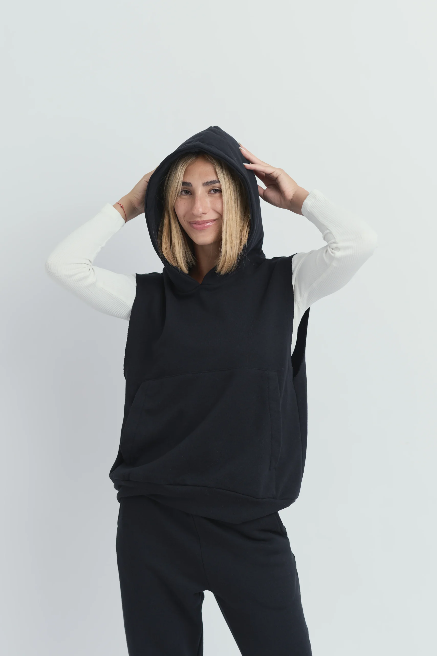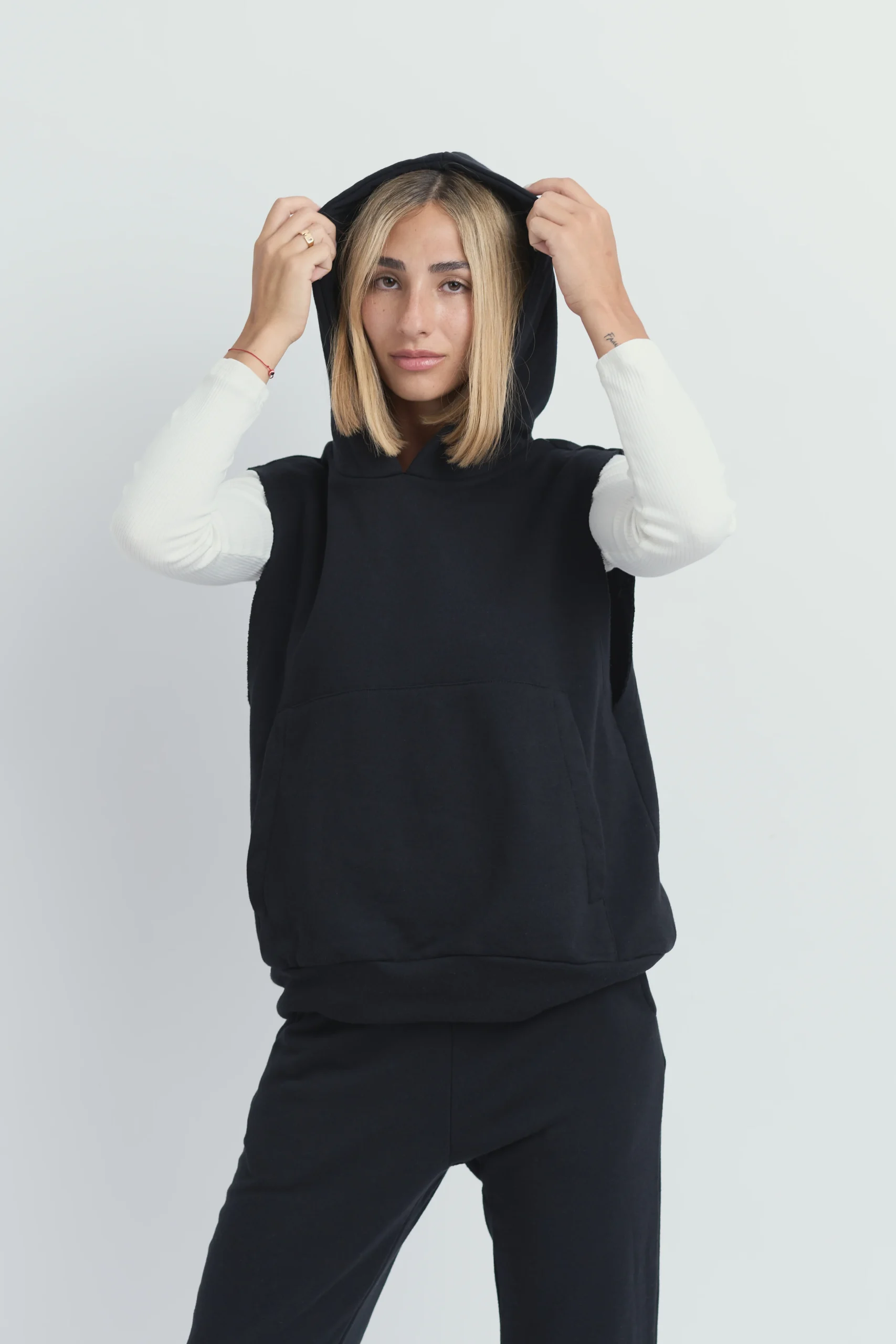 Chaleco color negro con capucha.
