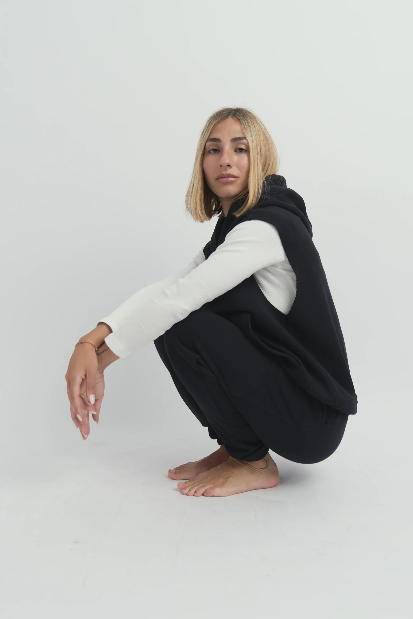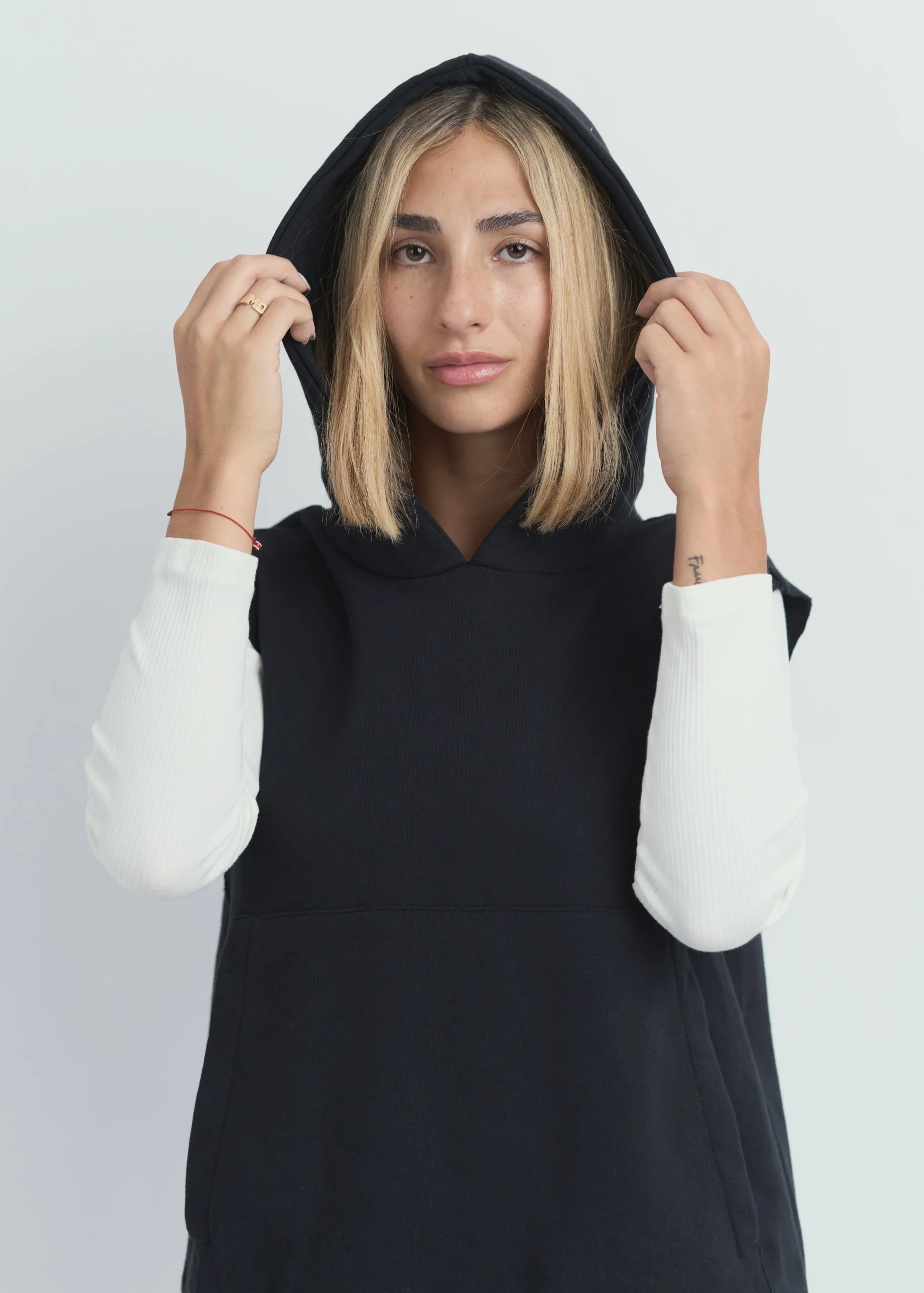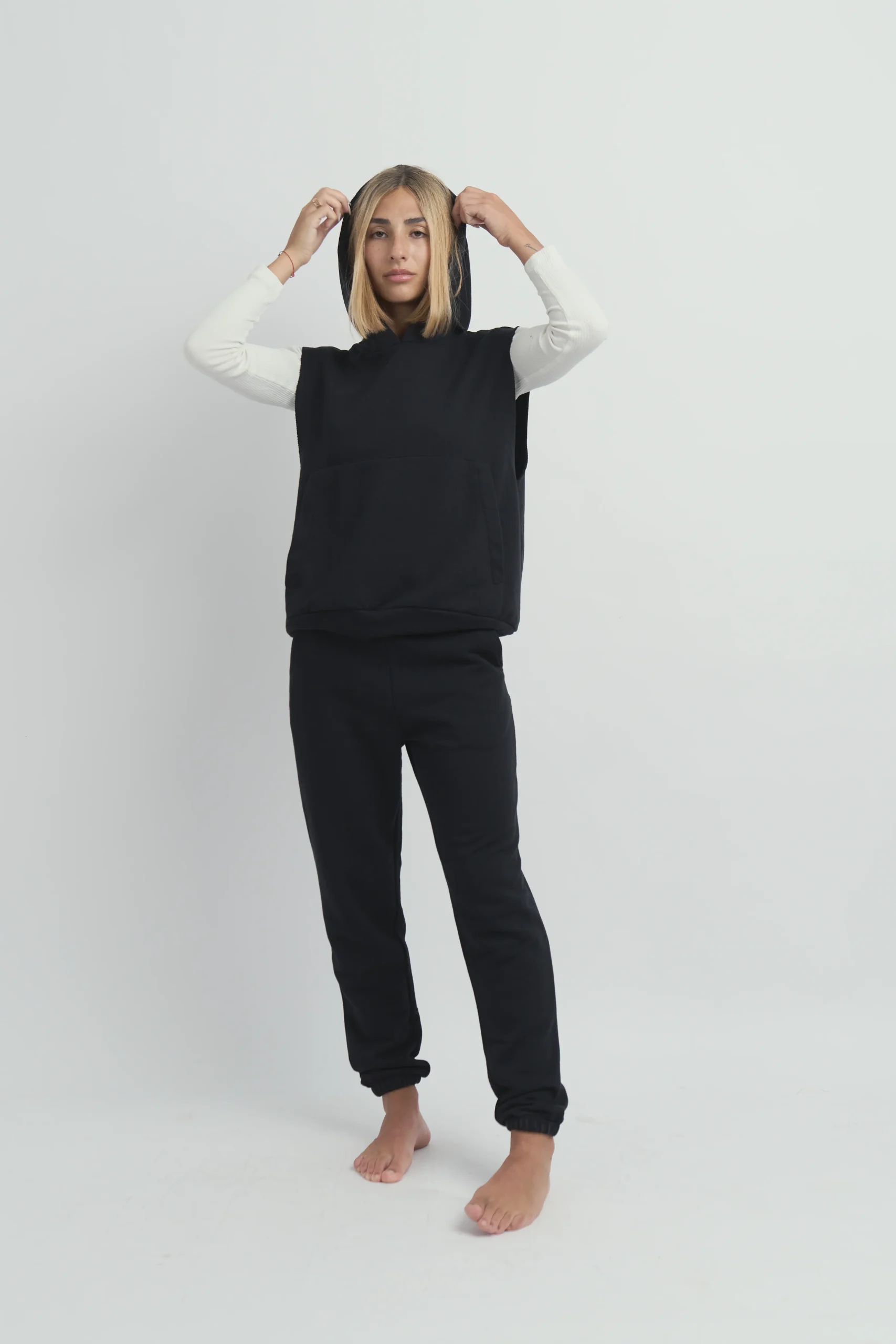 Chaleco color negro con capucha.