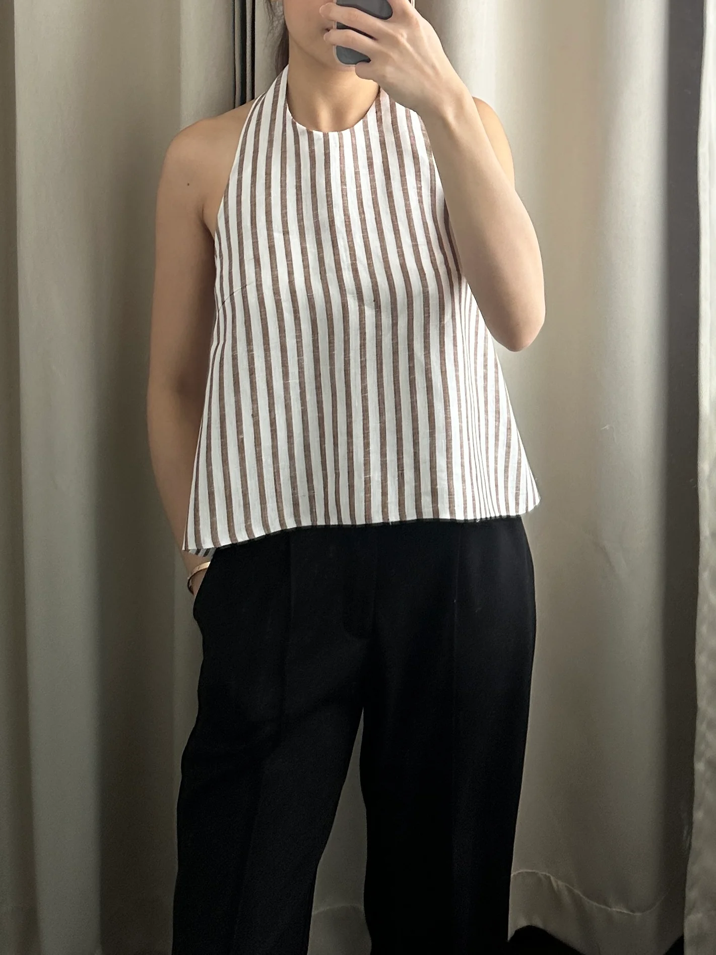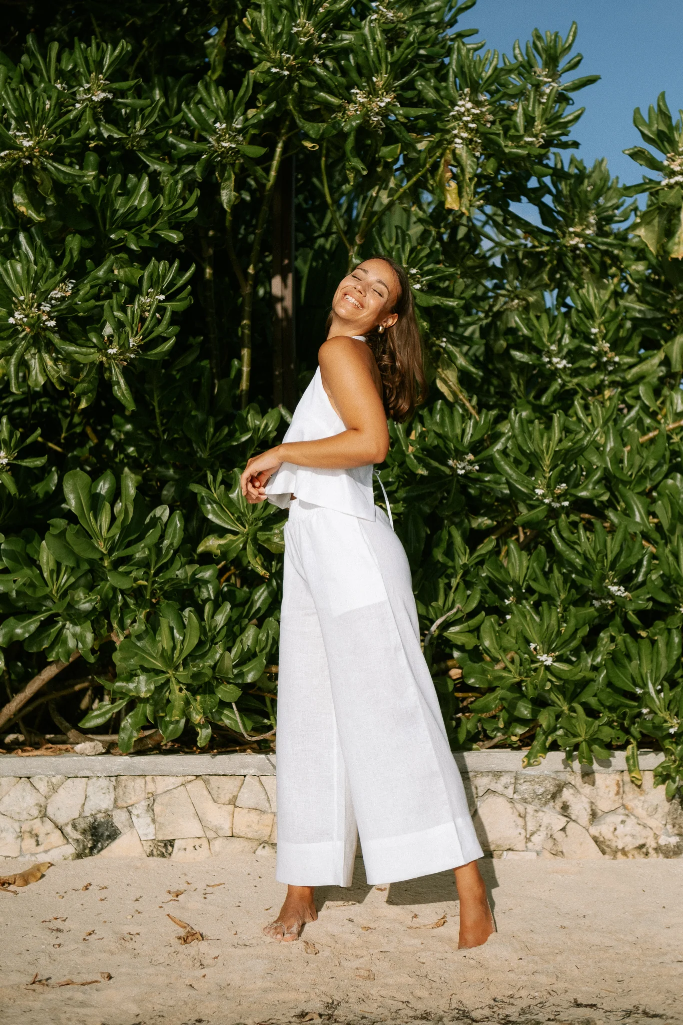 Este elegante top halter está confeccionado a mano con 100% lino sostenible y adornado con perlas Troca de la región de Visayan. Su diseño incluye un cierre con botón de perla y los caracterÃsticos lazos en la espalda, aportando un toque sofisticado y artesanal.