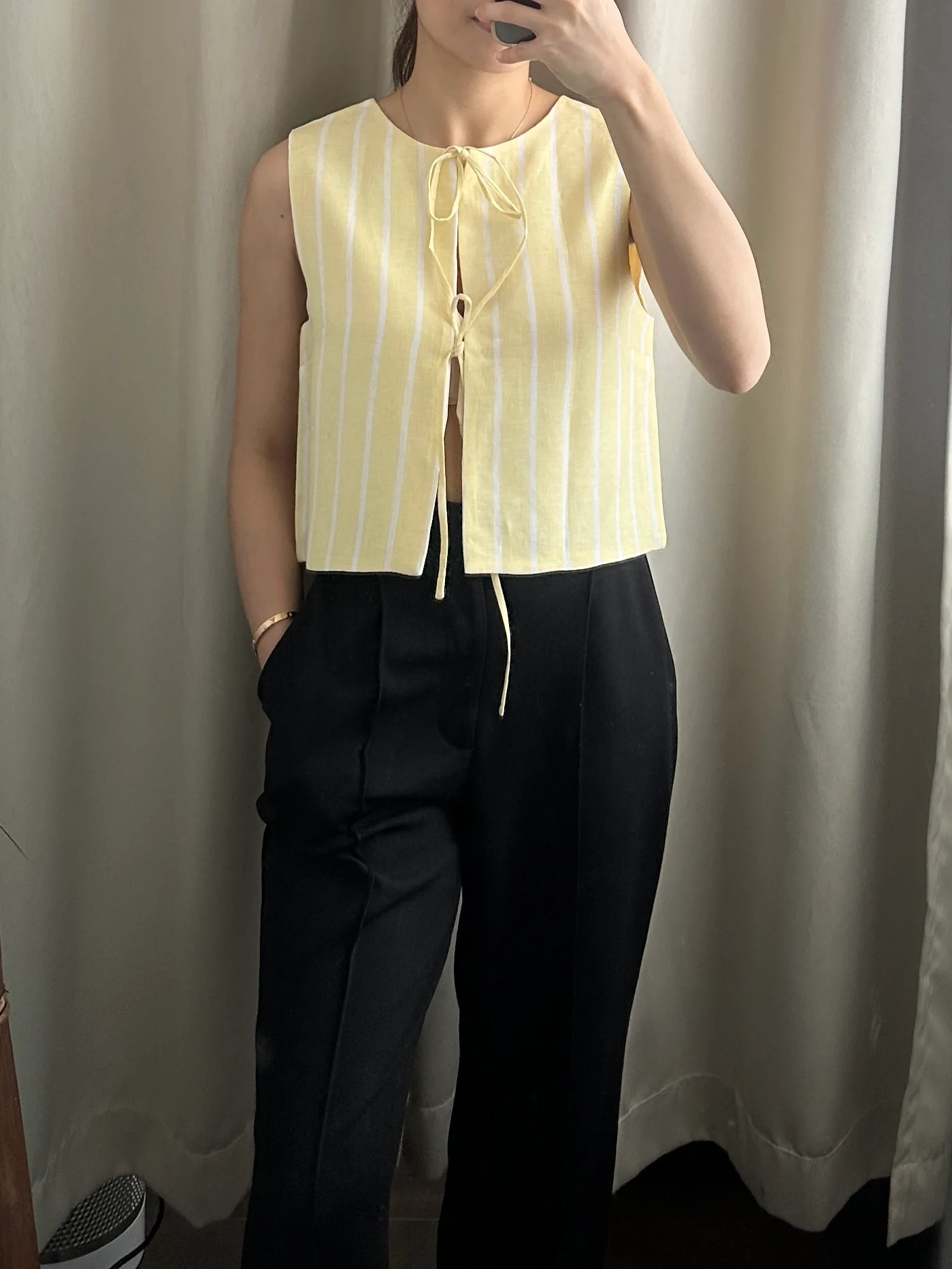 Hecho a mano con lino 100 % sostenible, este top presenta una silueta relajada y lazos frontales característicos, que aportan un toque distintivo y elegante.