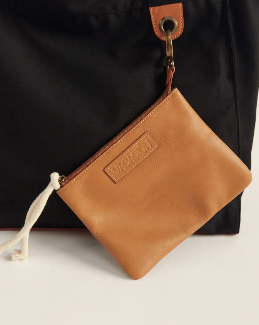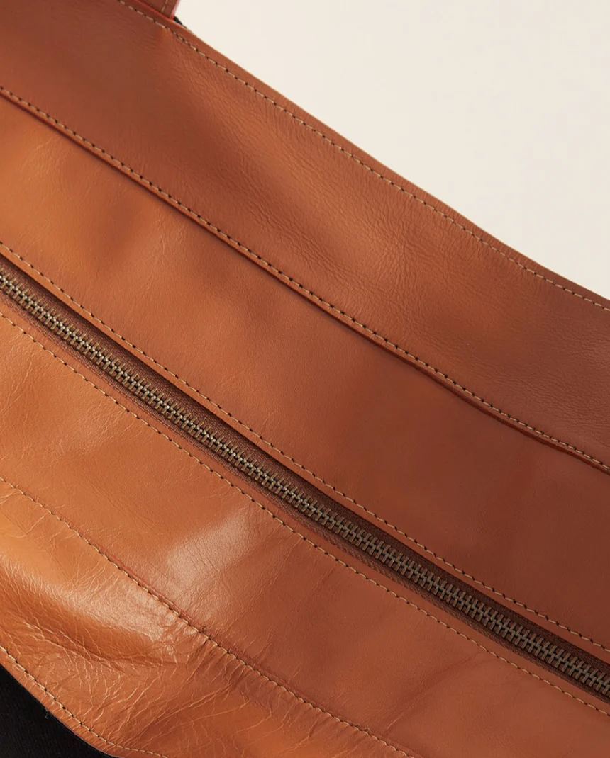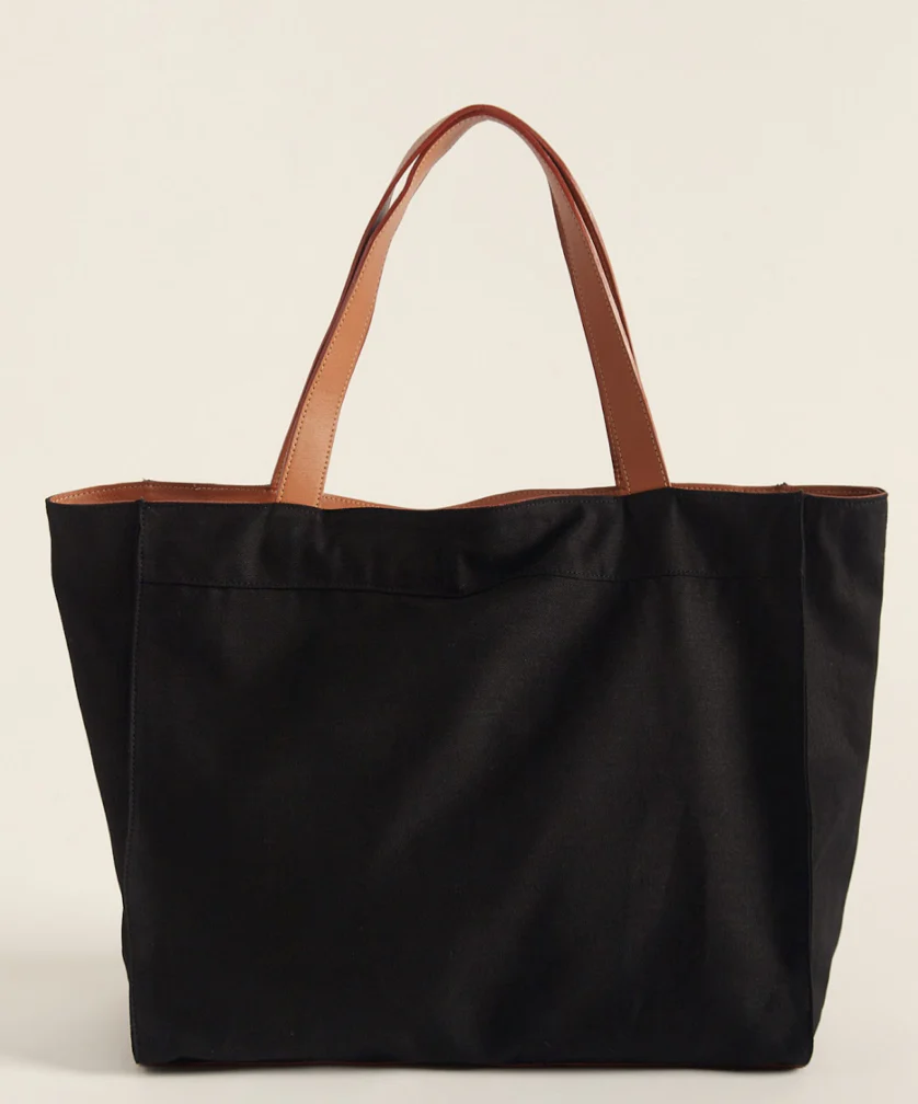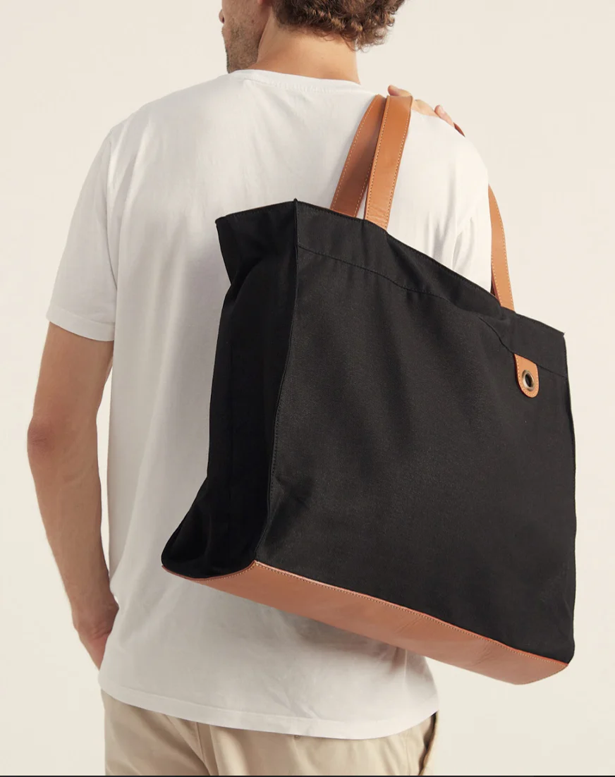 Tote bag confeccionada con fibras naturales y detalles en cuero.