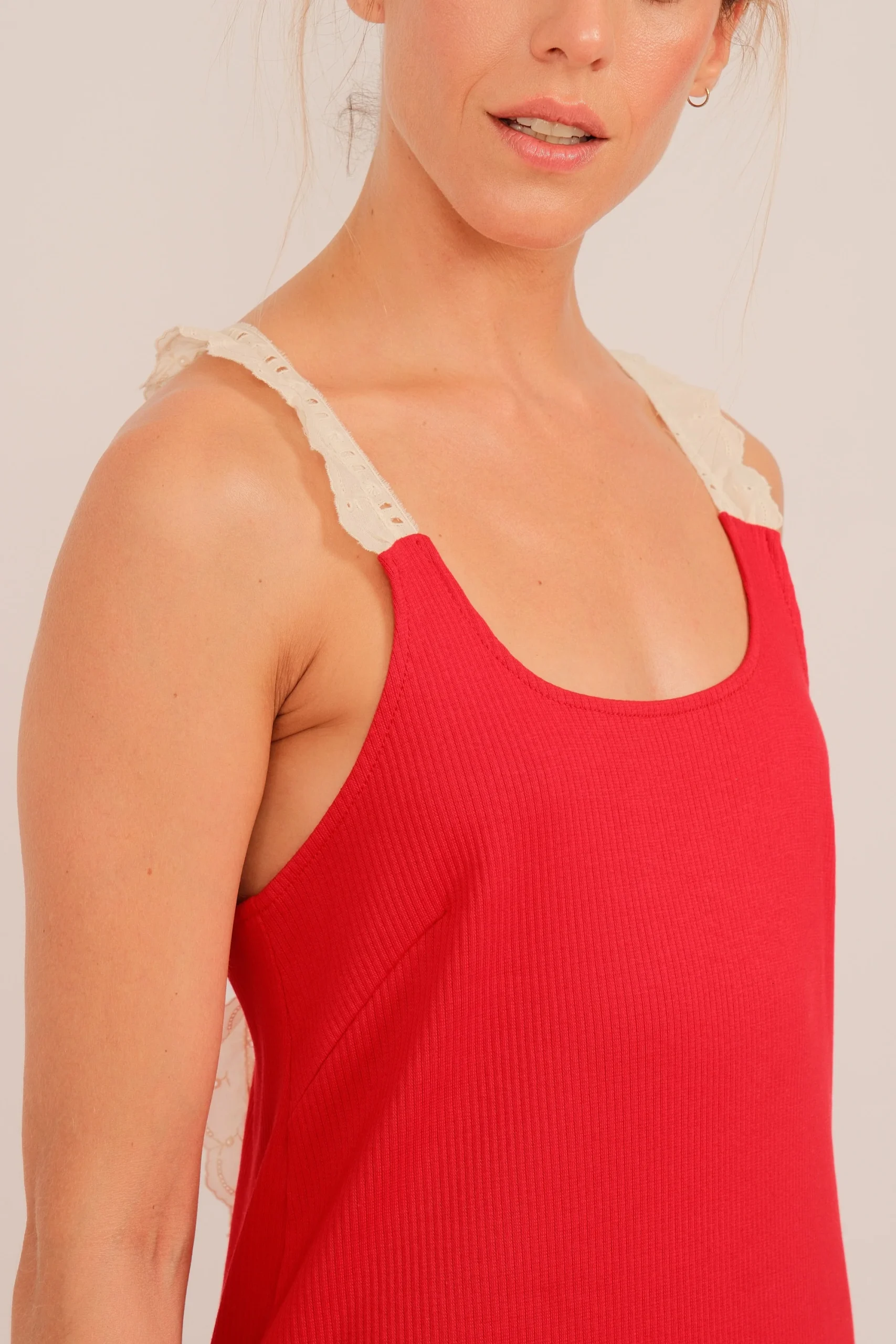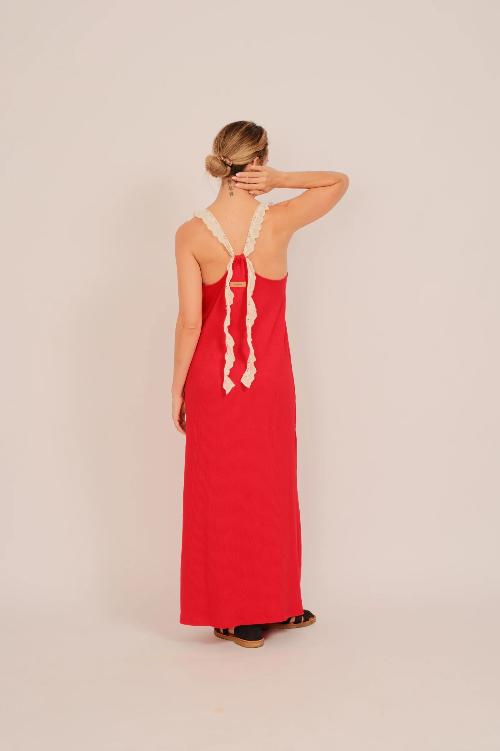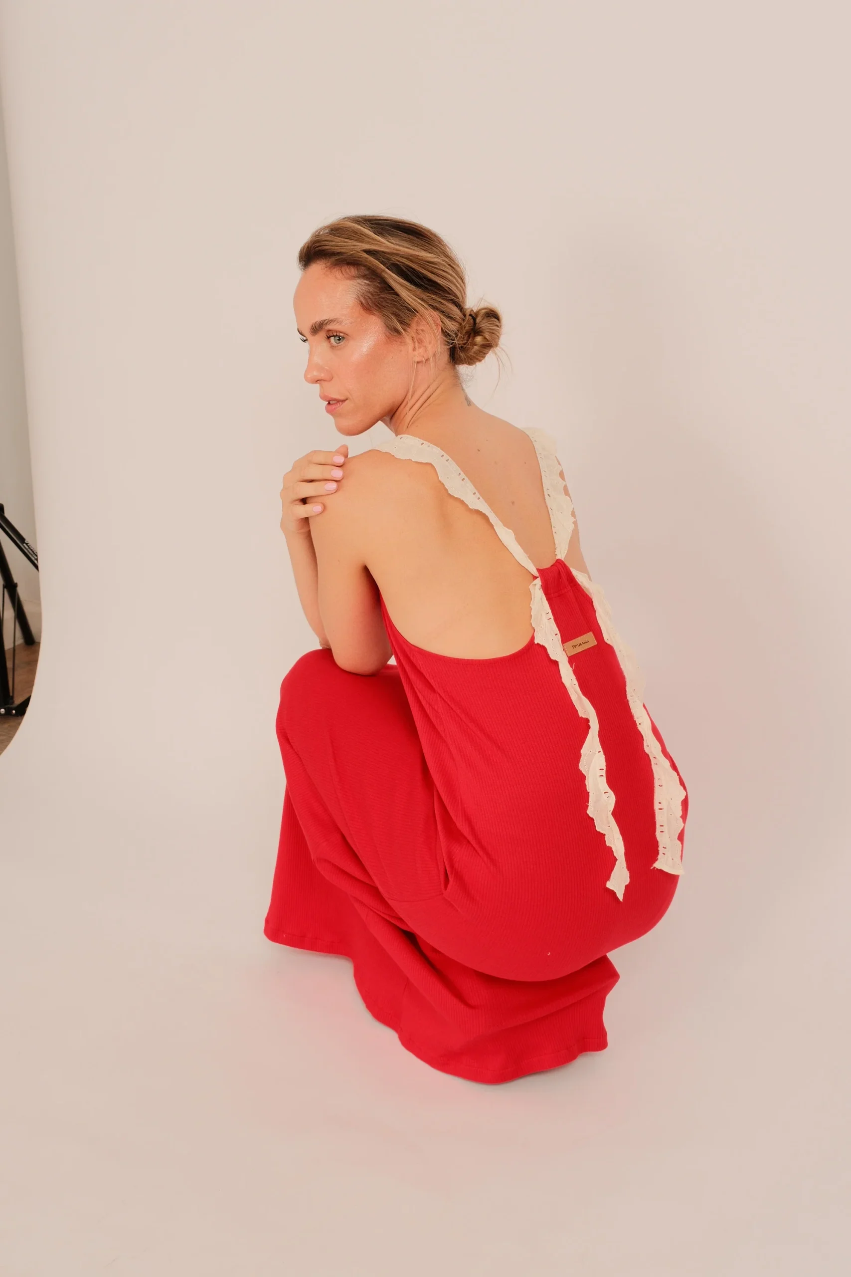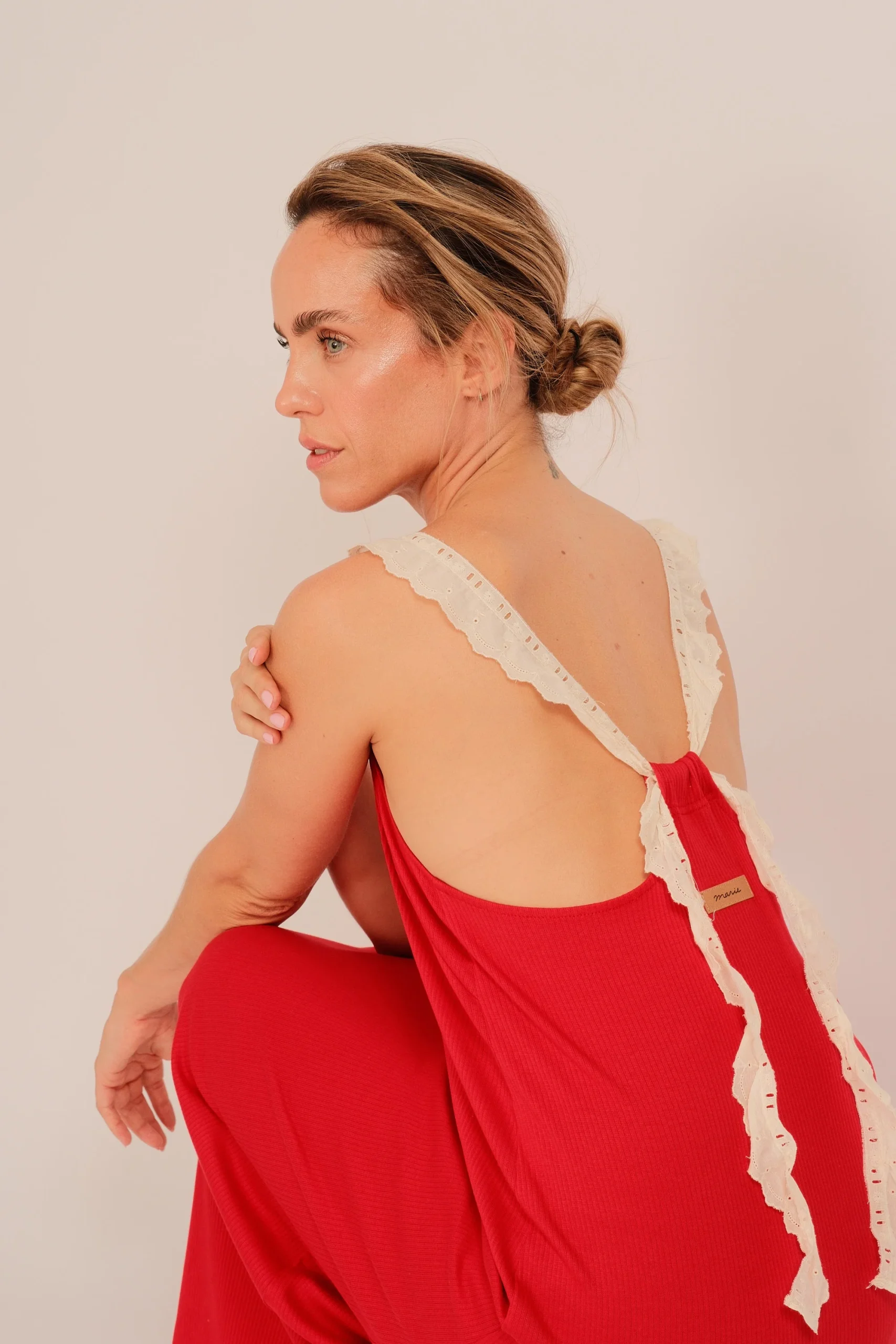 El rojo amapola es protagonista: vibrante, lleno de vida, pensado para mujeres que no tienen miedo de sentirse. Los tirantes en puntillas rematados en la espalda con un lazo, añaden un toque romántico y artesanal, fiel al espíritu de Marie.