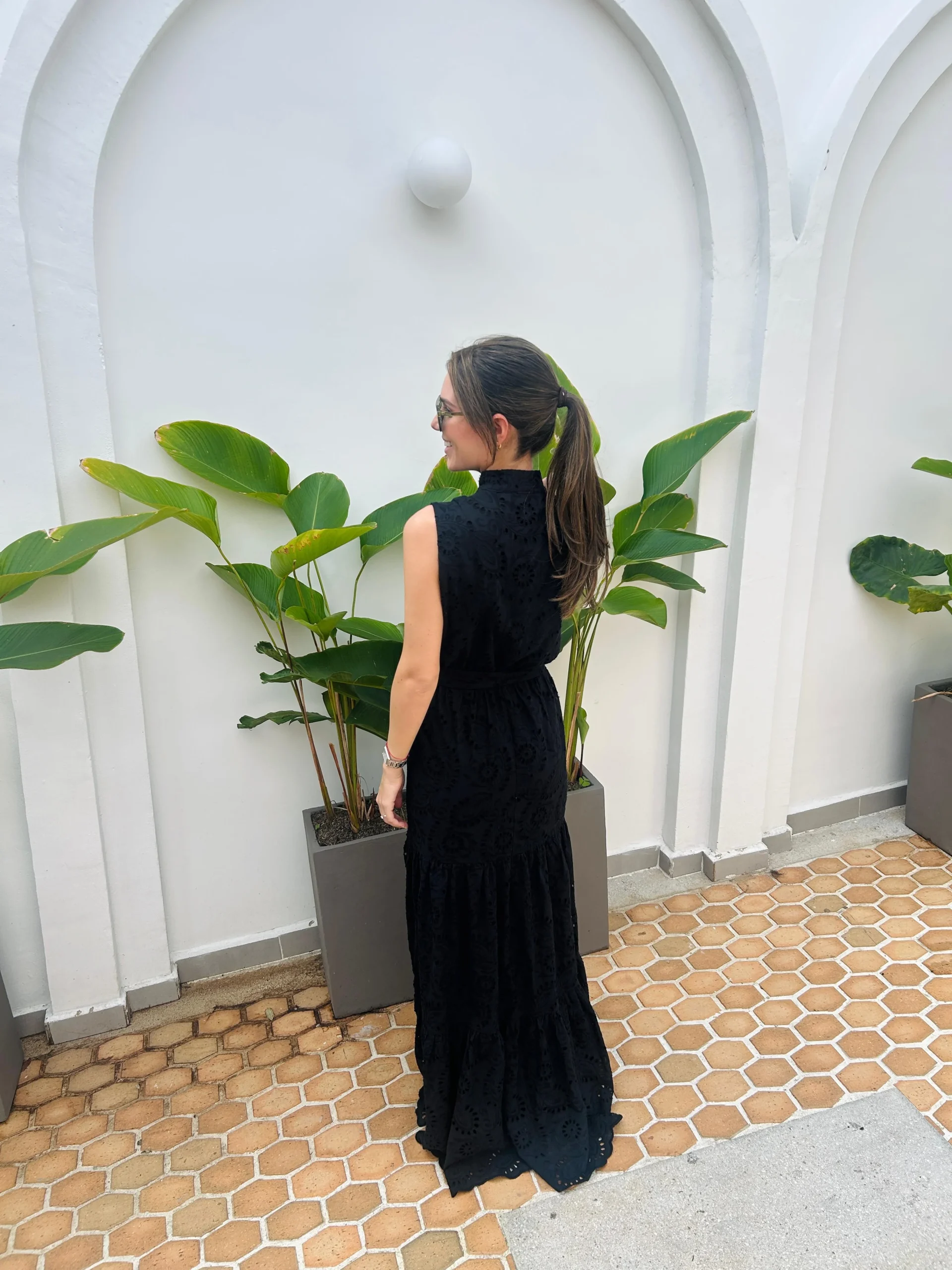 Vestido largo negro en ojalillo, sin mangas. Cuenta con botones en la parte frontal, cinturón del mismo tejido para ajustar la cintura. Ideal para un look fresco y elegante.