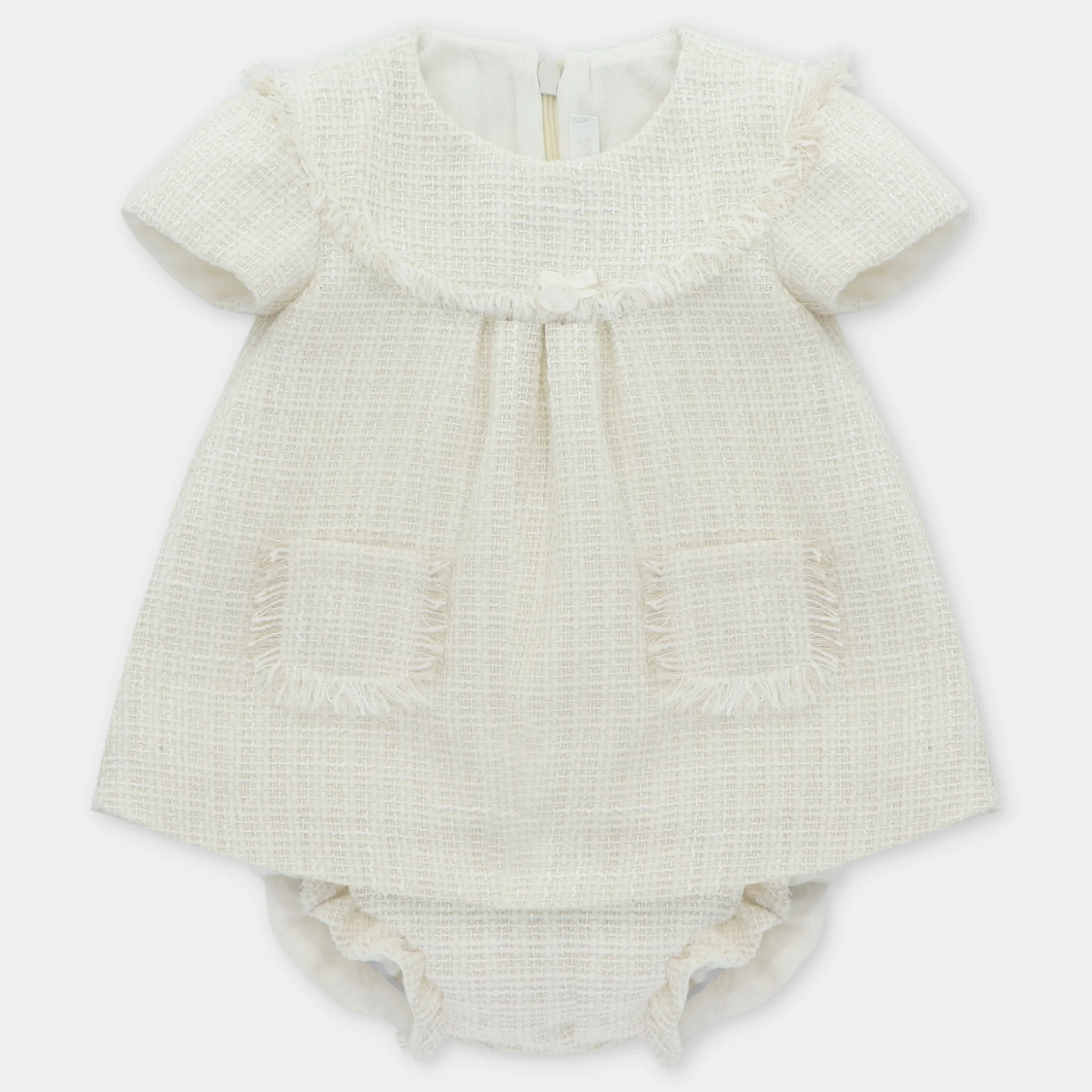 ¡Elegante y divino vestido corto de tela de tweed de lana! ¡Confeccionado grueso y resistente para un look muy versatil! De cuello redondo con olan en circulo, manga corta, bolsillos frontales, cierre de zíper por atrás para una puesta fácil y rápida. Con su calzoncito a juego de la misma tela con elastico en cintura y piernas para mejor ajuste.