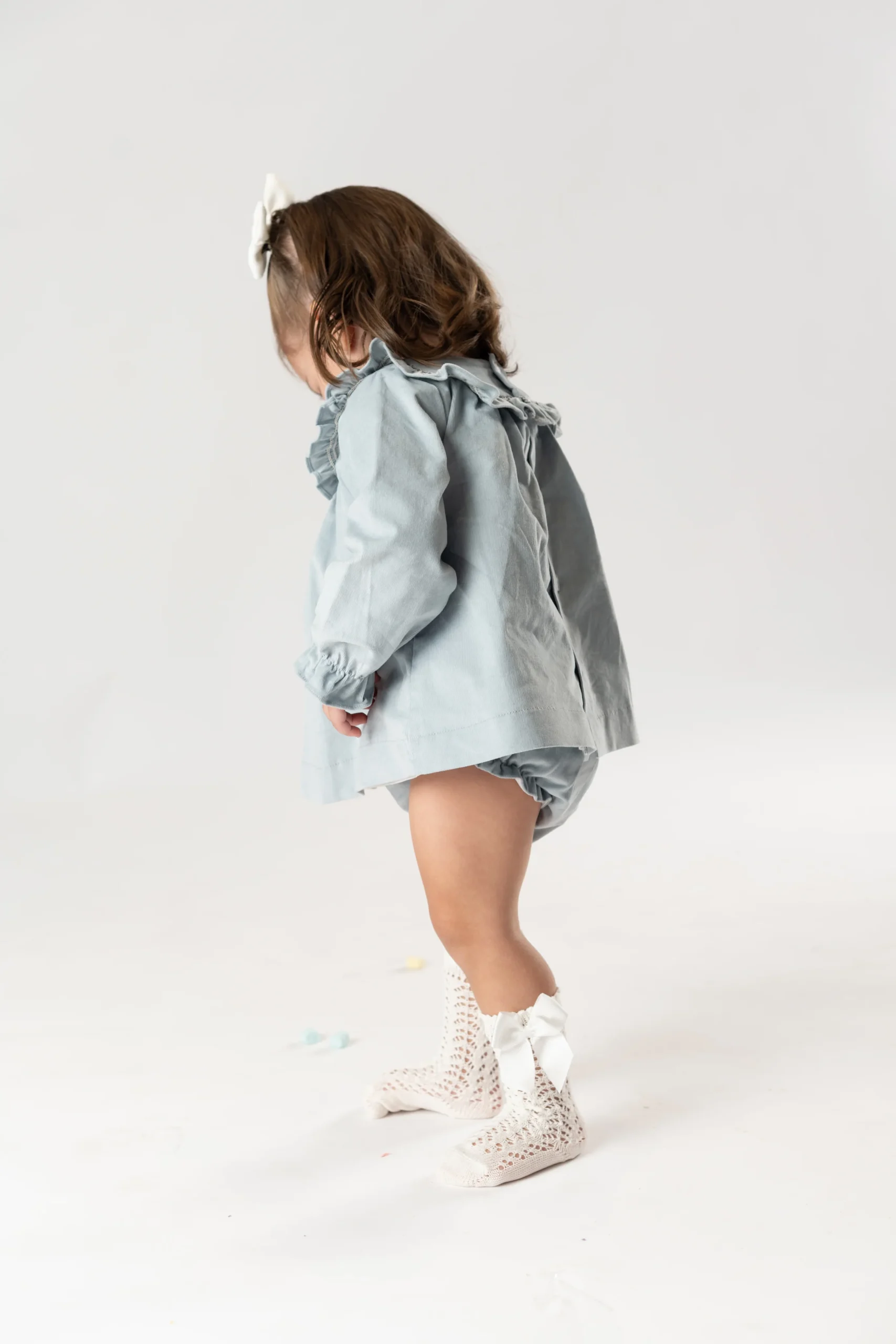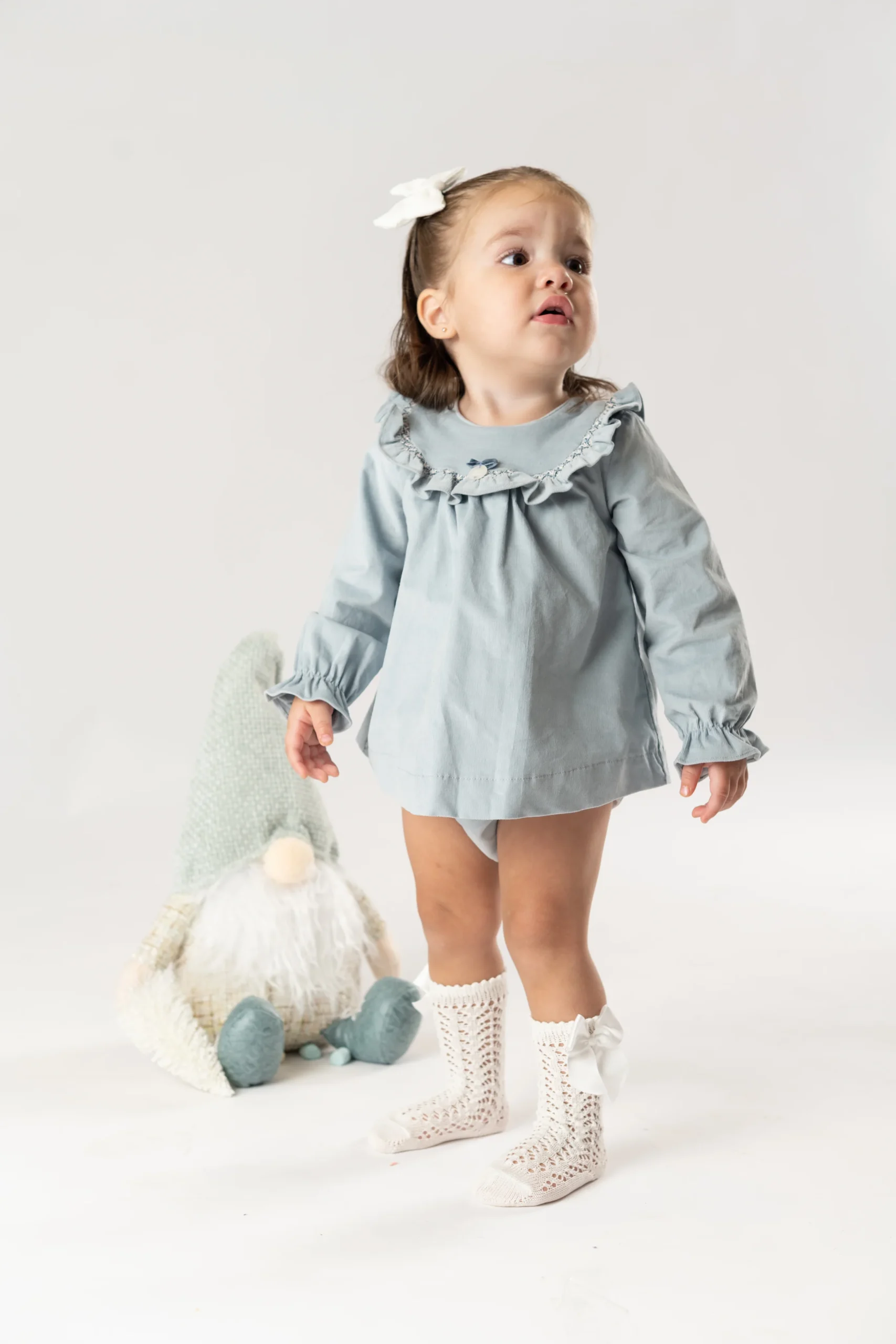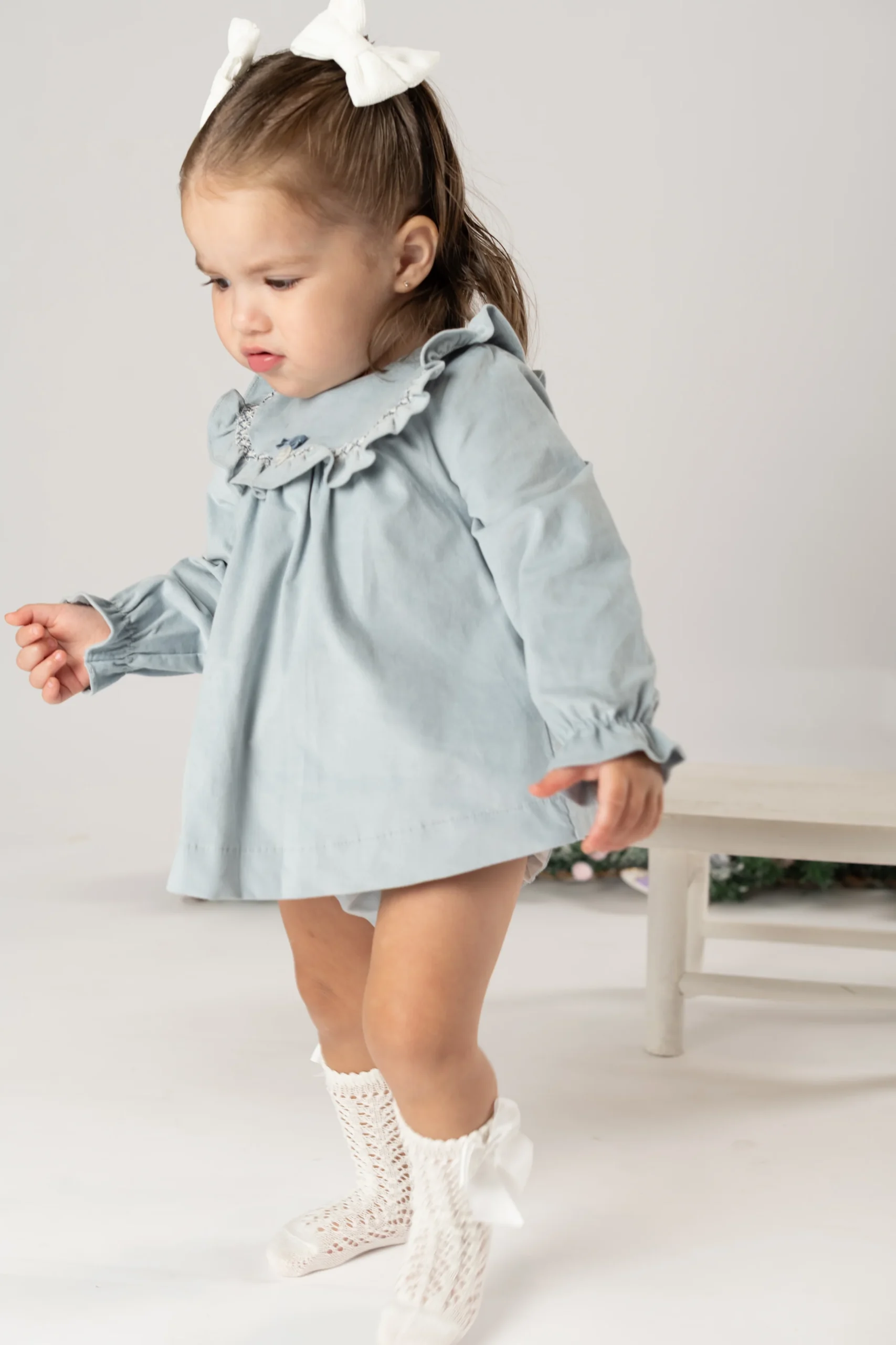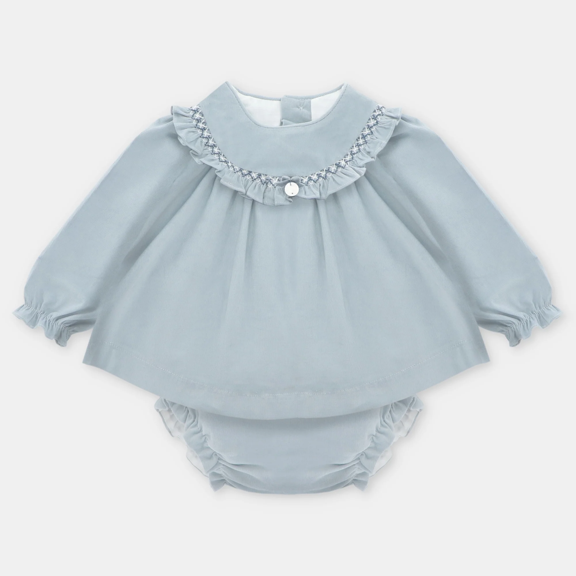 ¡Hermoso vestido de tela de pana en tono azul! ¡Un vestido basico para el guardarropa de las niñas, ya que es una prenda muy versatil pensada para cualquier ocasion! Vestido de cuello redondo, manga larga con elastico, detalle de olan redondo con bordado en el pecho, cierre de ziper por la parte de atras. Con su calzoncito a juego de la misma tela con elastico en cintura y piernas para mejor ajuste.