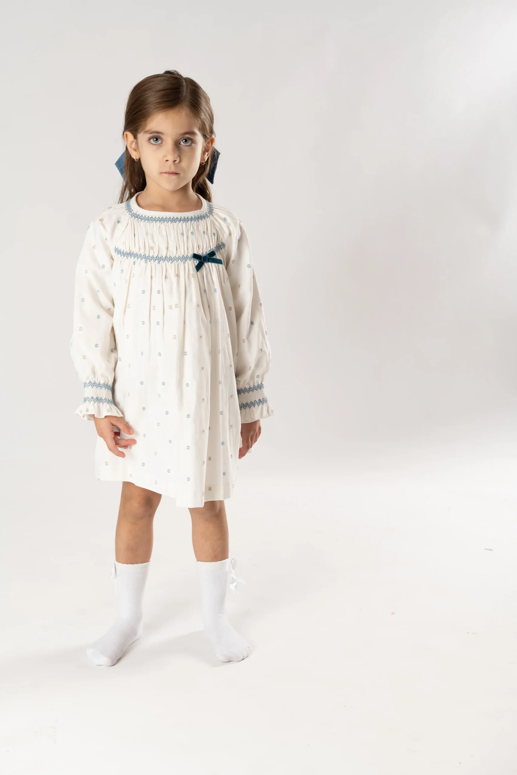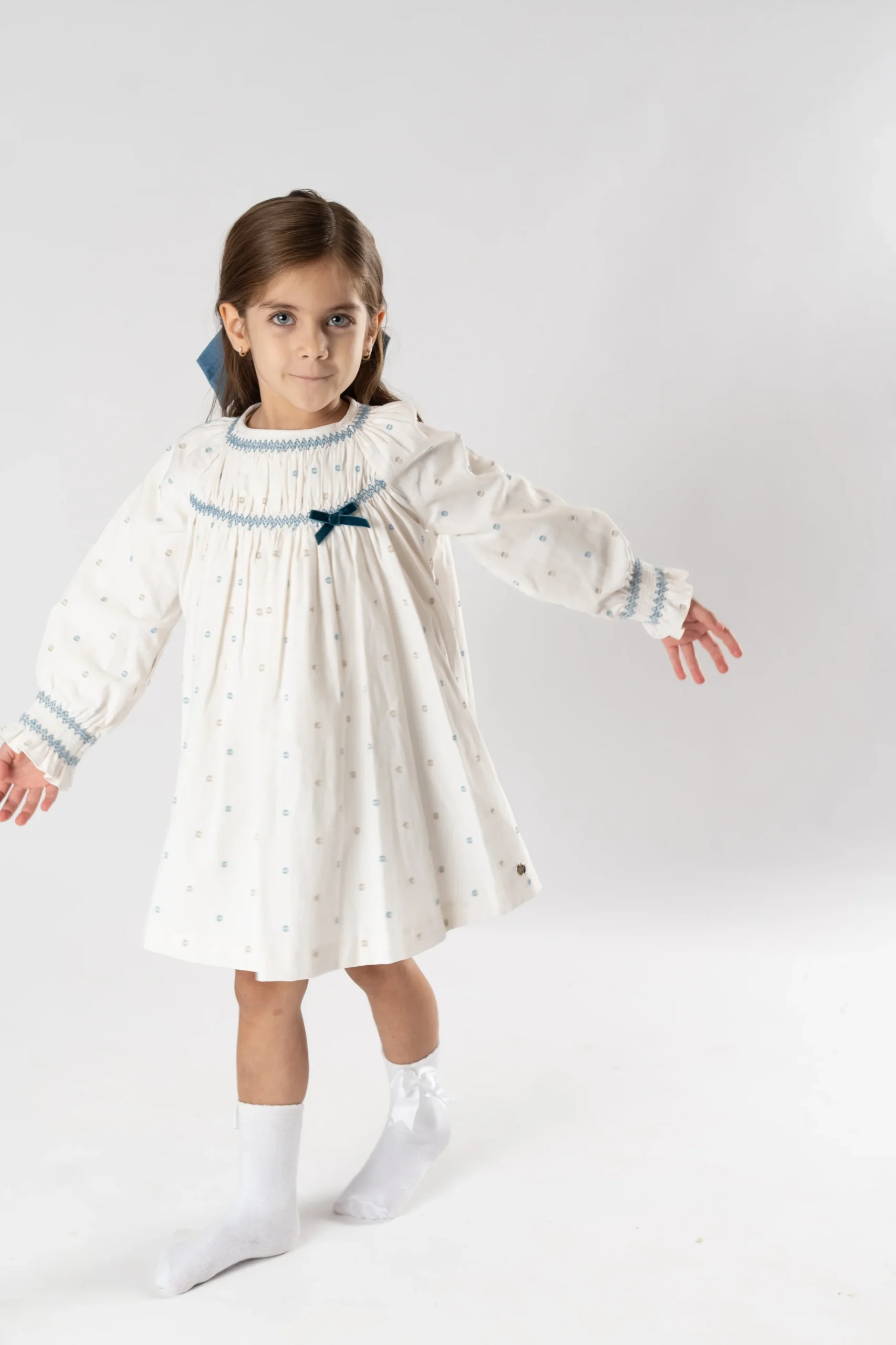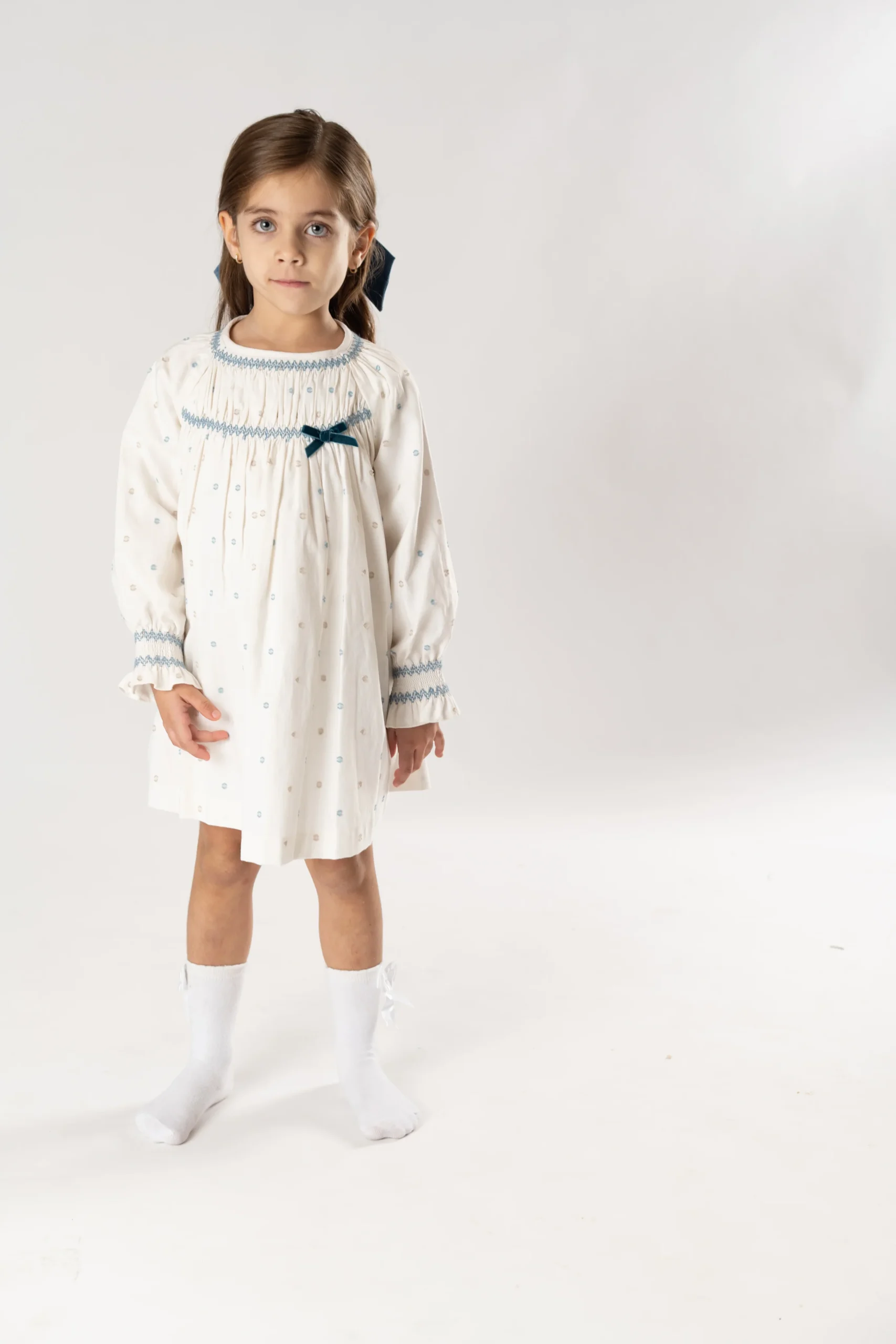 ¡Divino y delicado vestido con detalle de plumety!¡Pensado para tus eventos/ceremonias mas importantes! De cuello redondo, manga larga, detalle de smock en el pecho con lazo y en muñecas, falda con vuelo, cierre de botones por la parte de atras para facilitar su puesta.