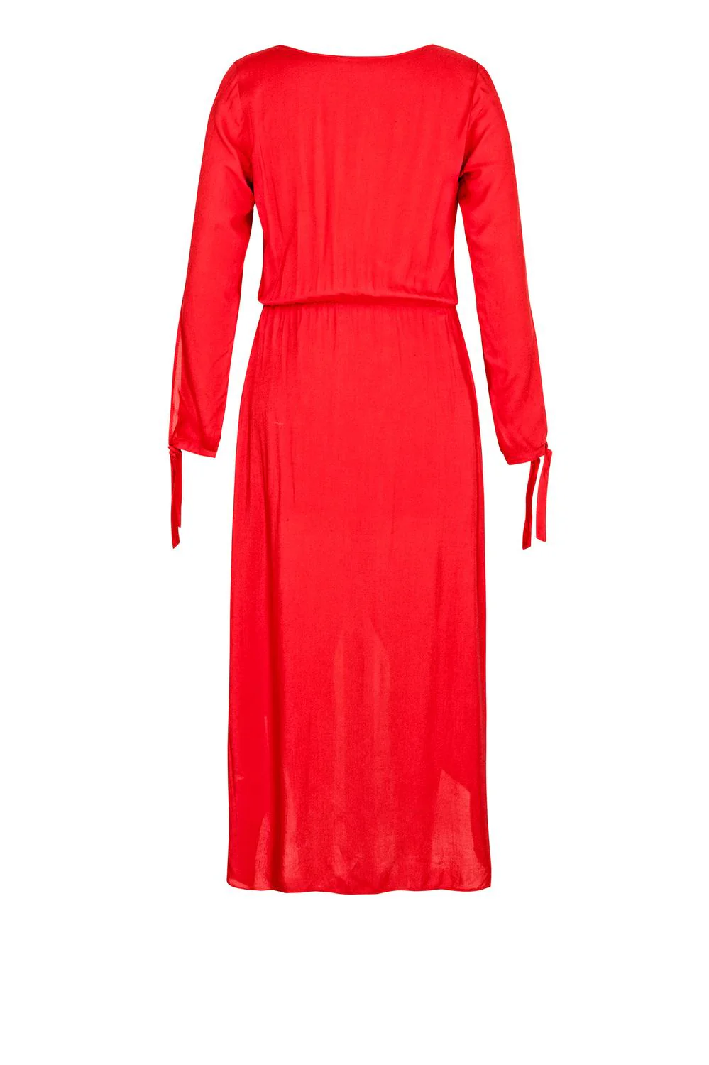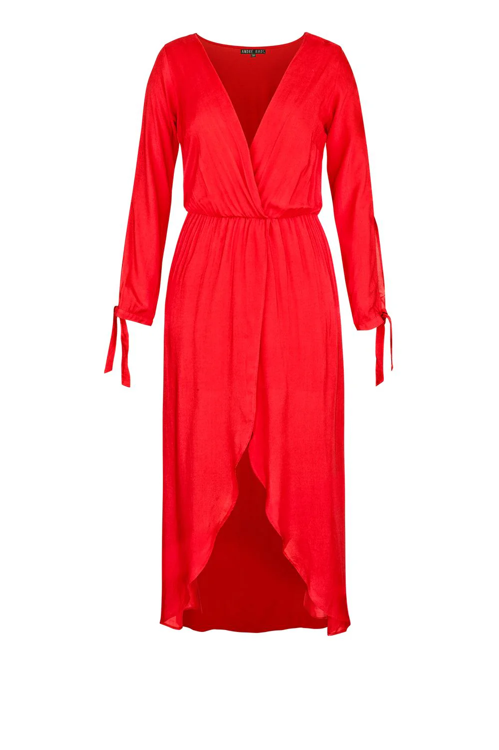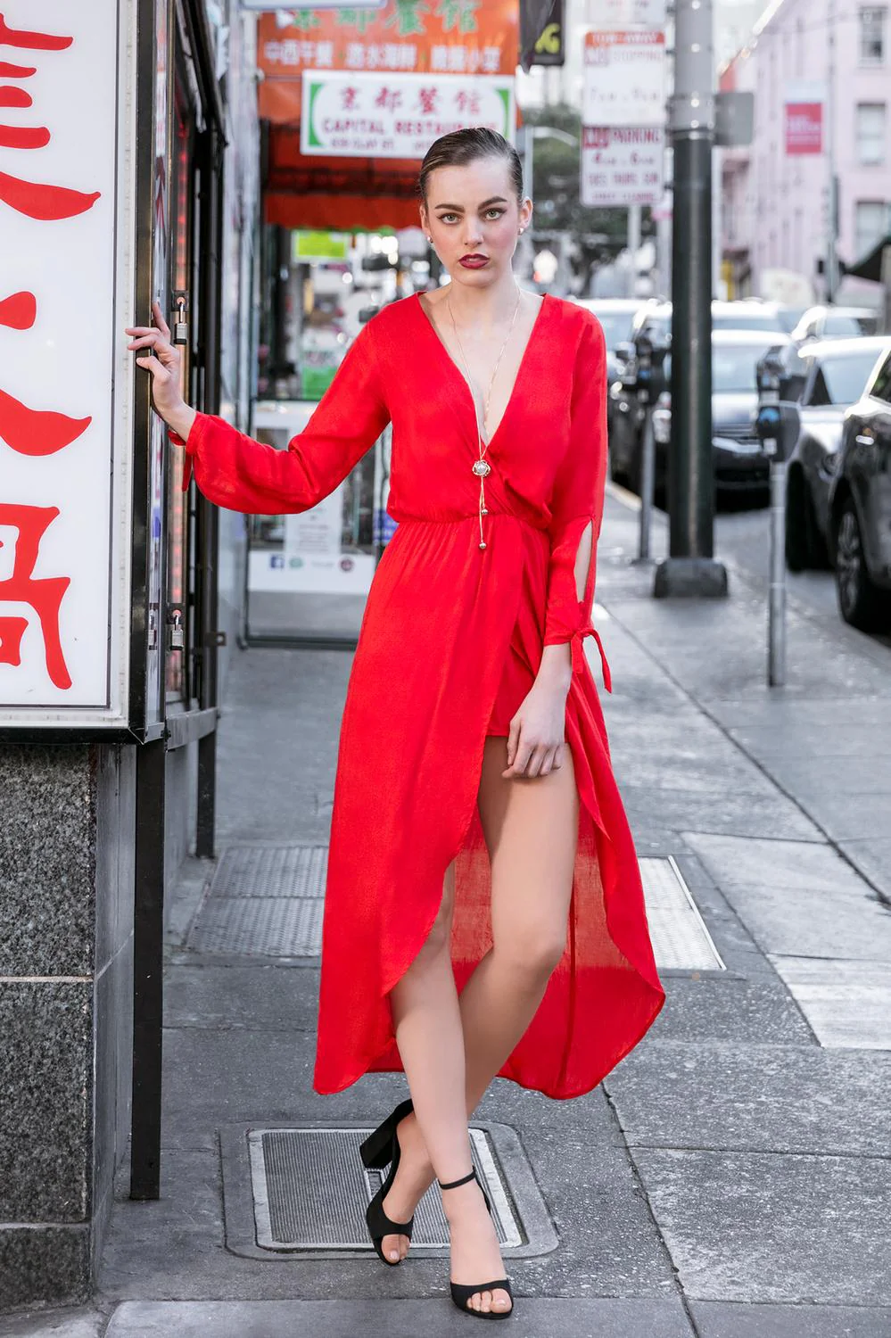 Vestido fluido asimétrico con cruce delantero y falda corta, escote en V y manga larga. 100% Viscosa prod. # 20-0531