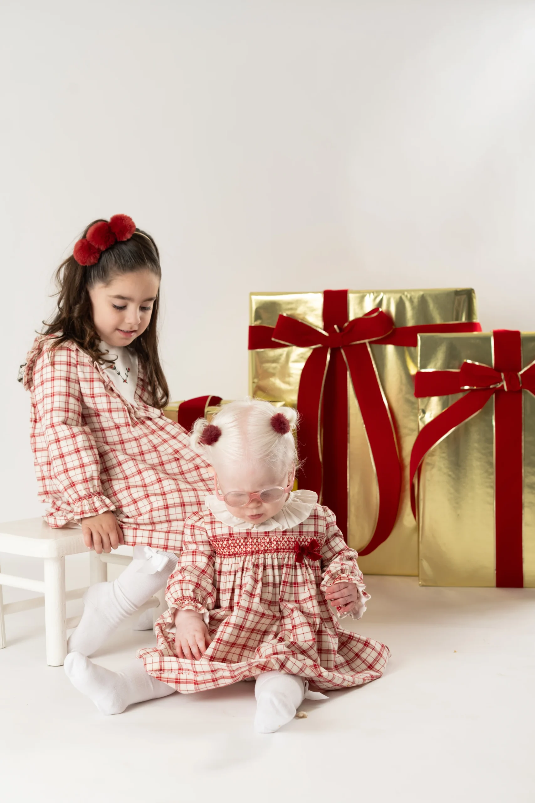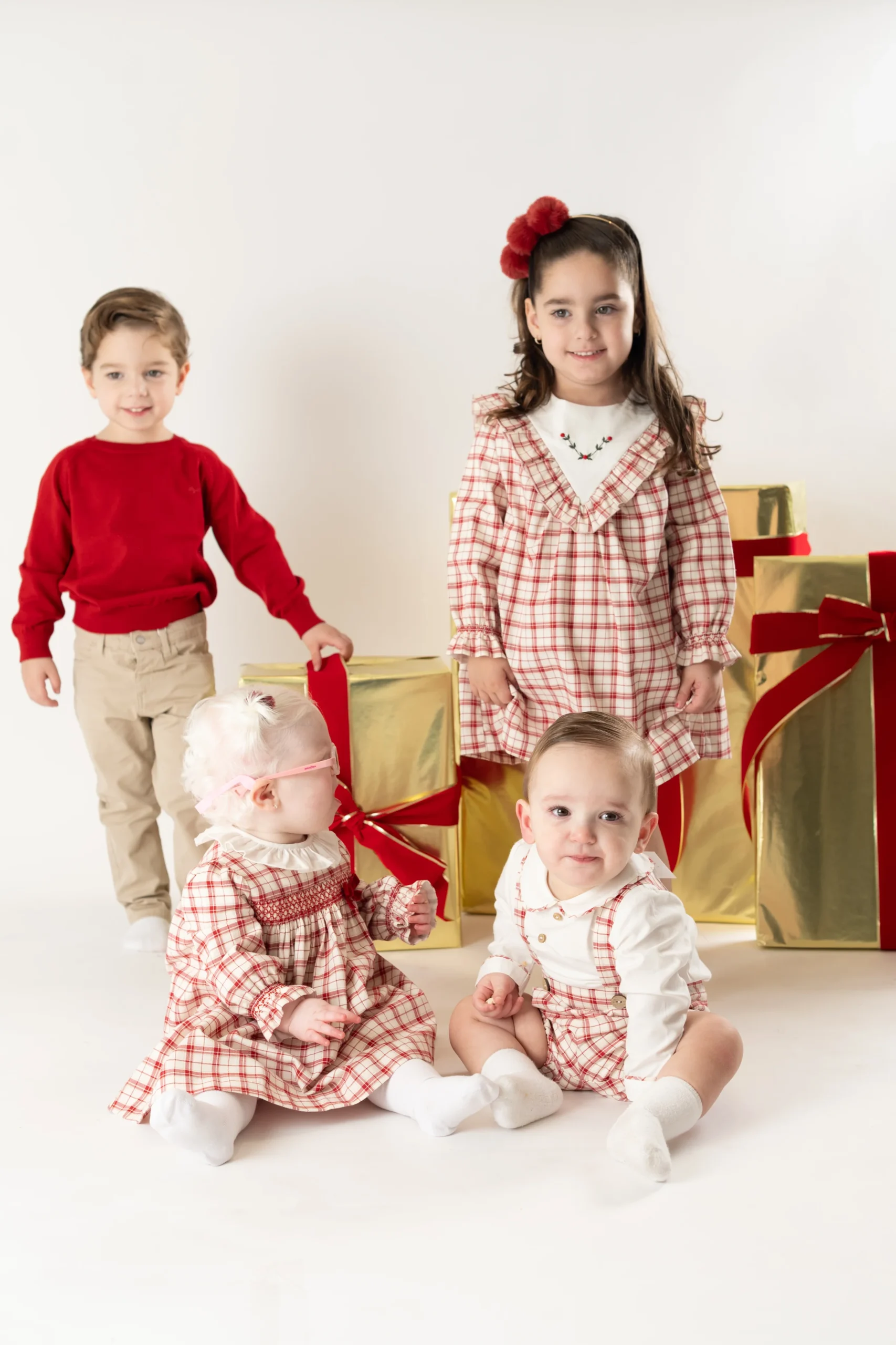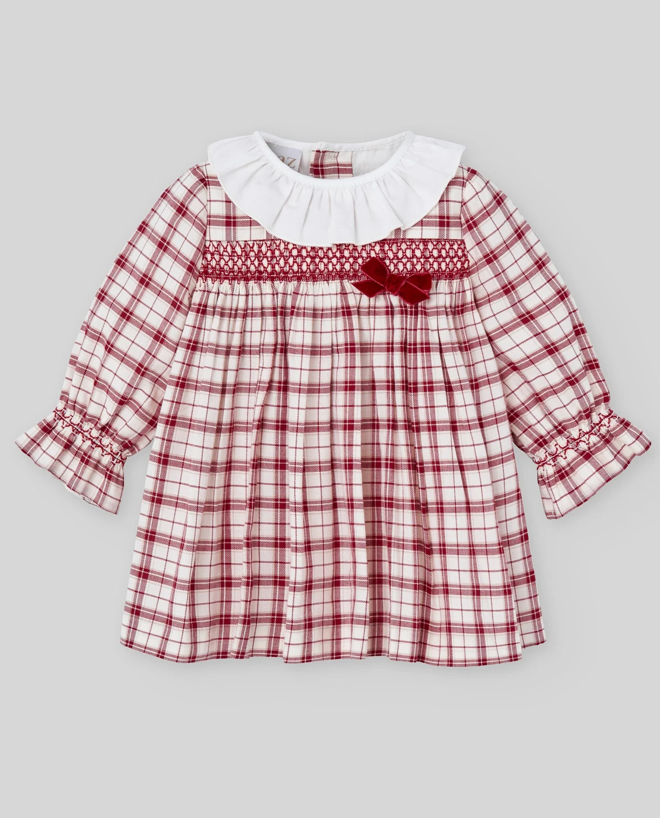¡Divino vestido de estampado de cuadros en tonos navideños! Cuello redondo con olan, manga larga con puños elasticos, corte en el pecho con smock y lazo aterciopelado. Cierre de ziper por atrás para facilitar su puesta.