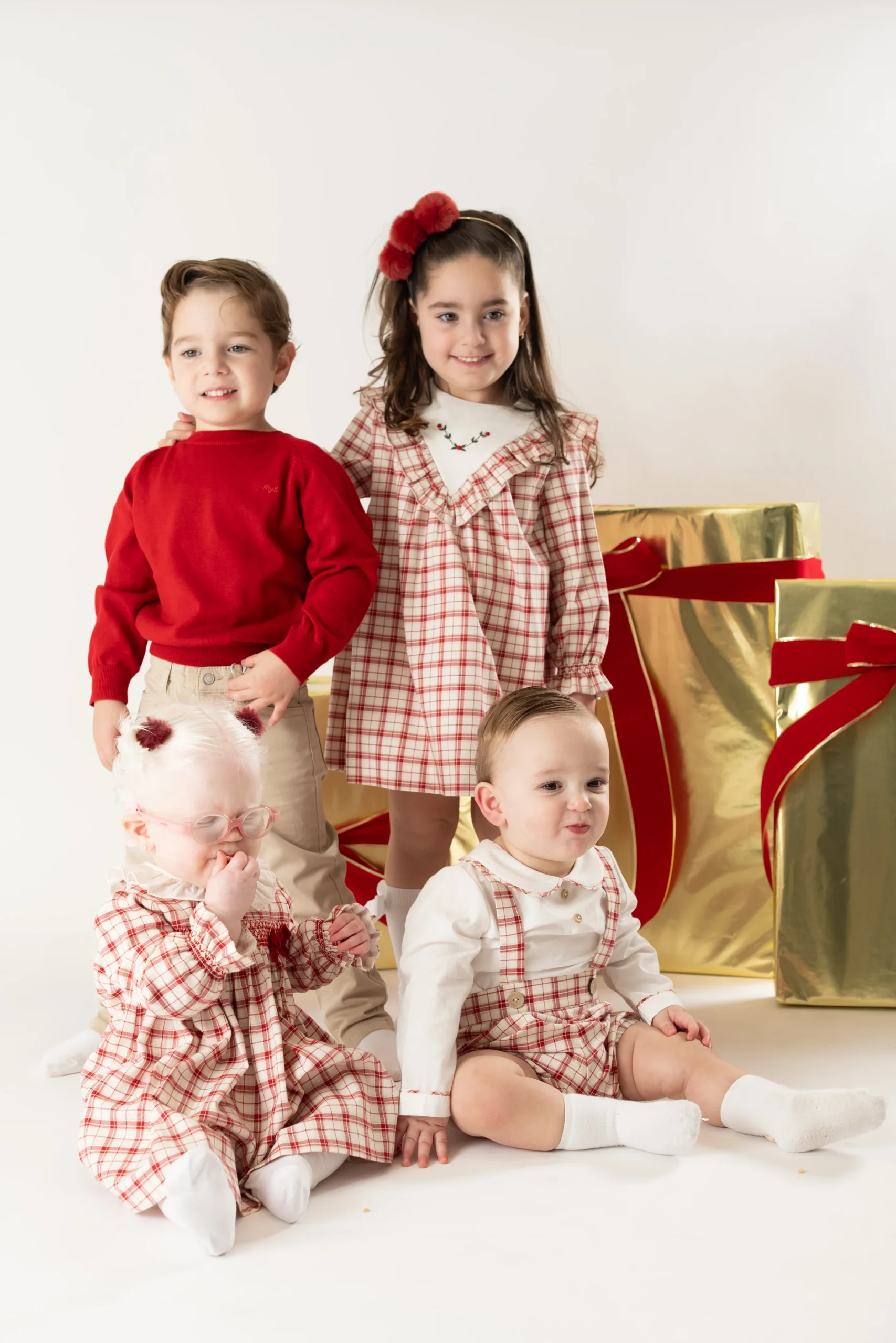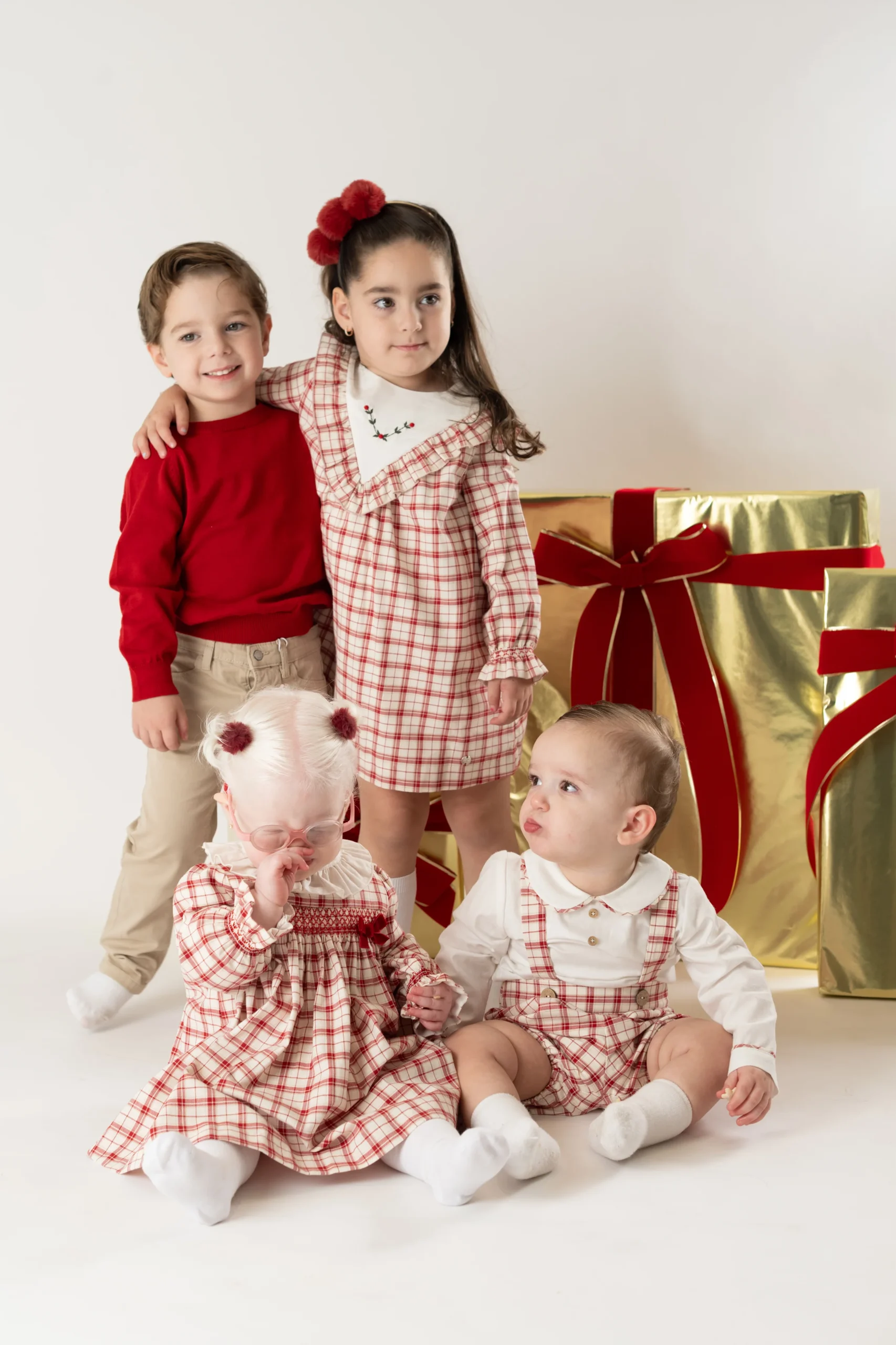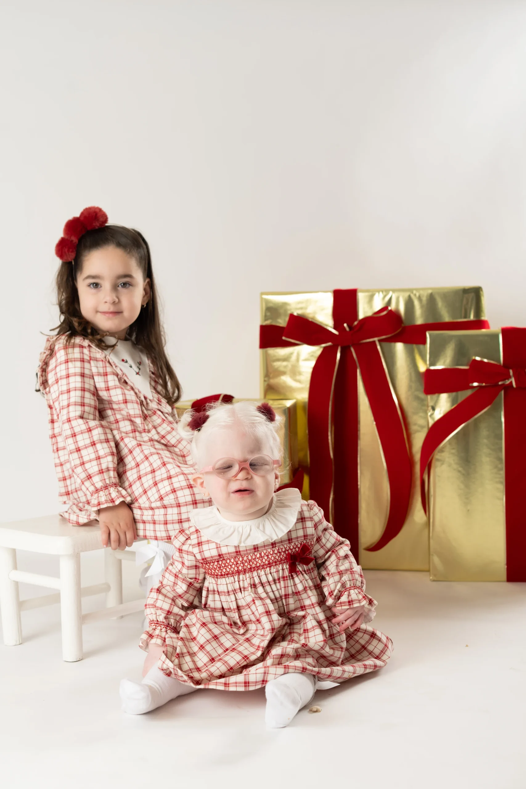 ¡Divino vestido de estampado de cuadros en tonos navideños! Cuello redondo con olan, manga larga con puños elasticos, corte en el pecho con smock y lazo aterciopelado. Cierre de ziper por atrás para facilitar su puesta.