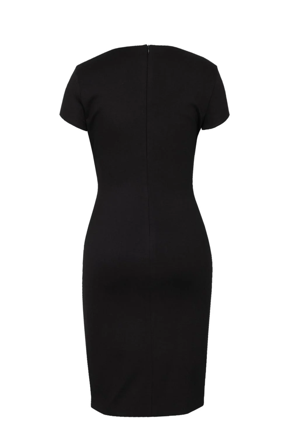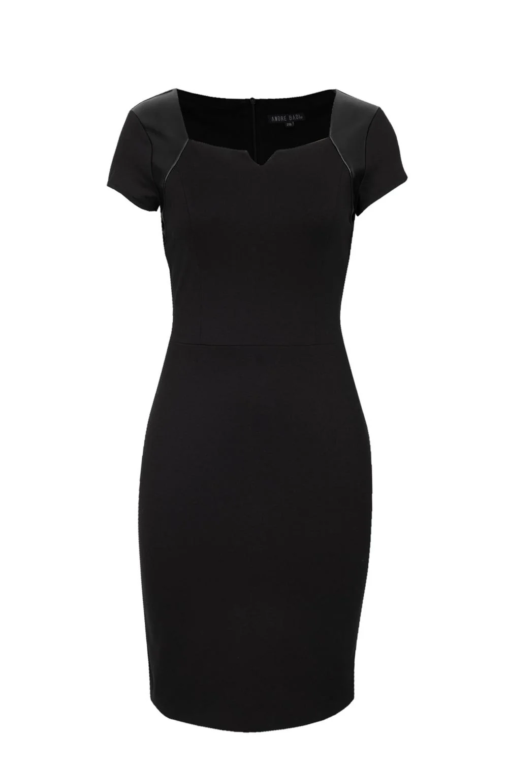 Vestido corto con escote geométrico, cortes frontales, contraste de materiales a tono y mangas cortas. 20-1469