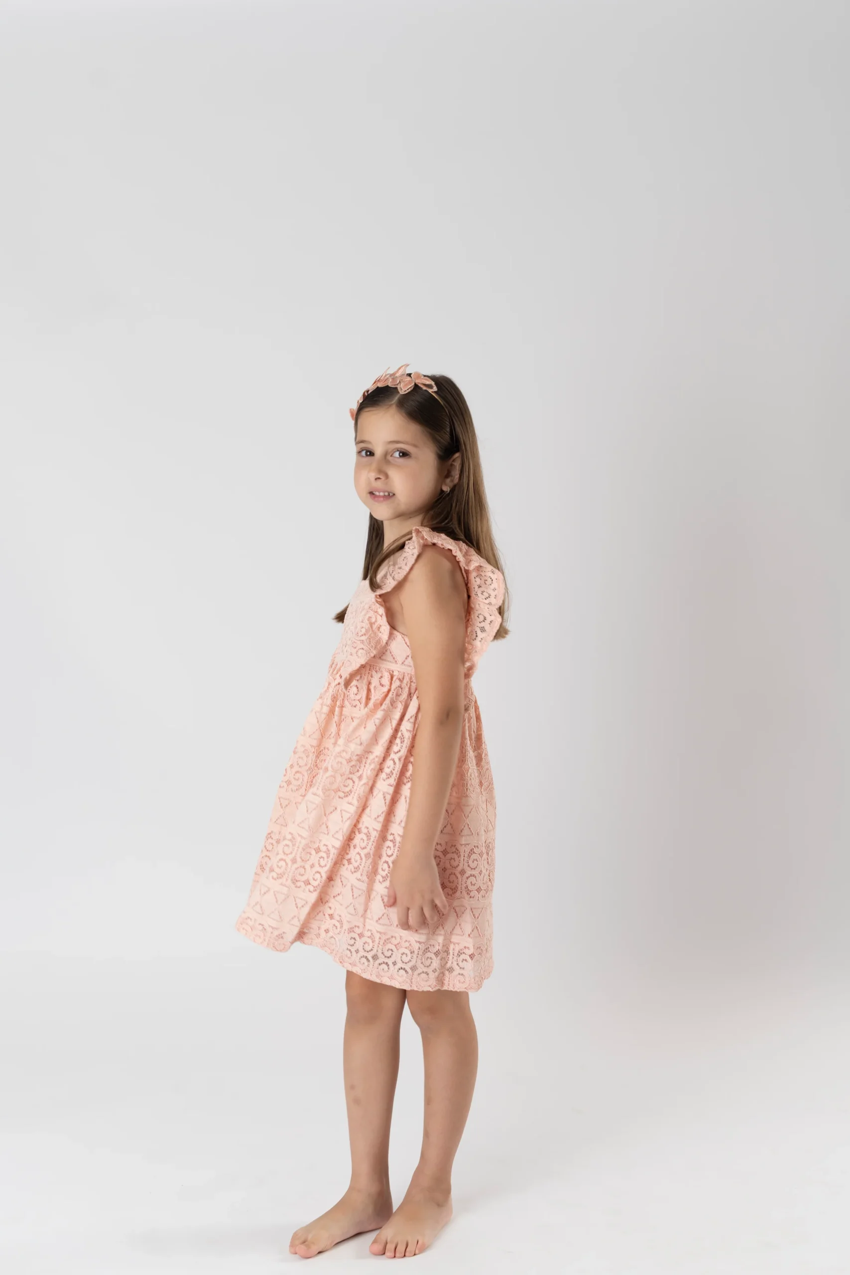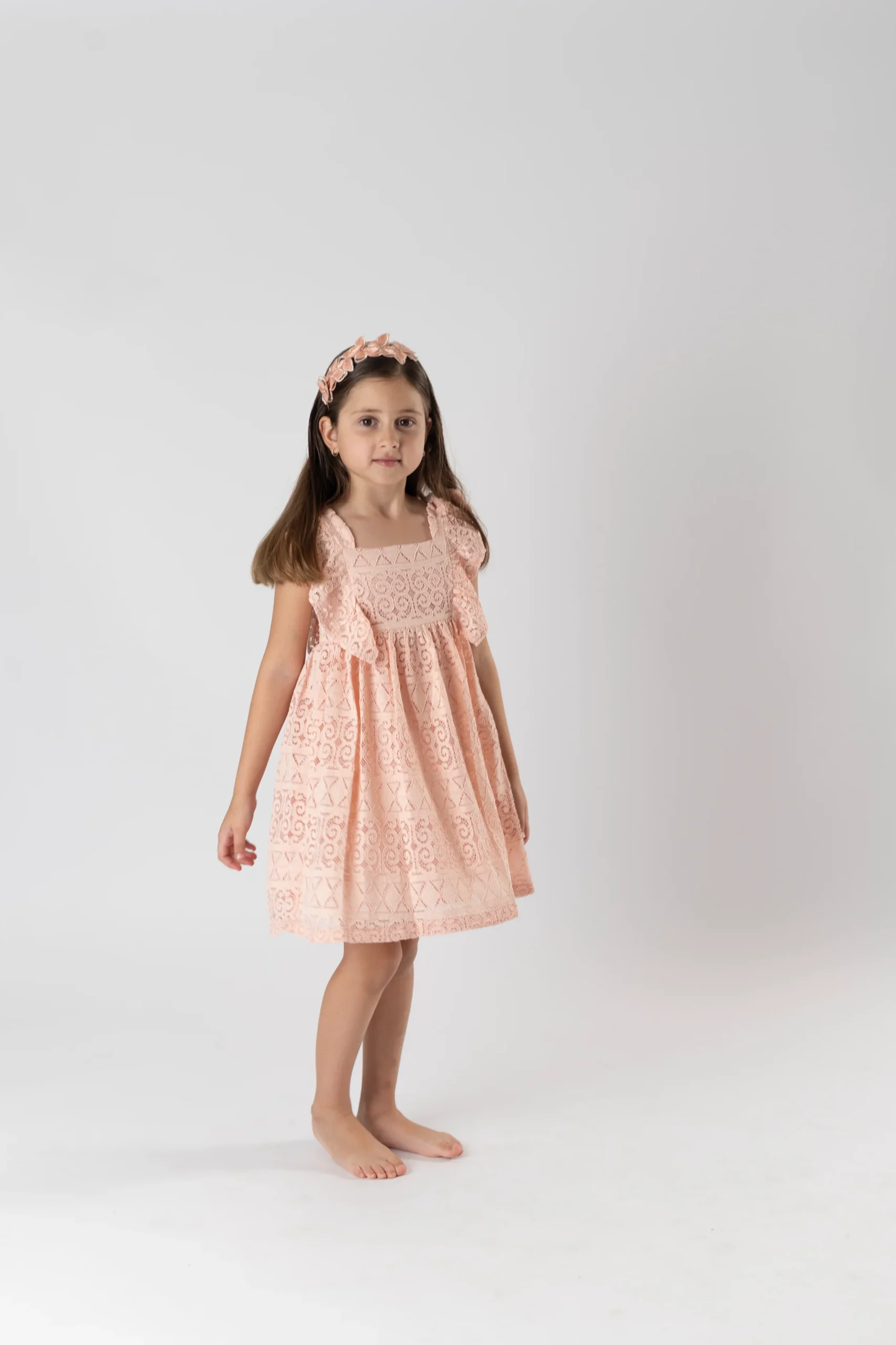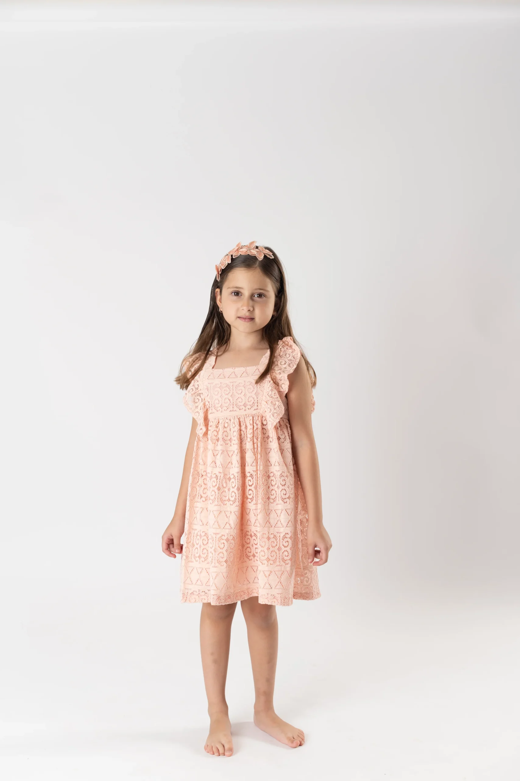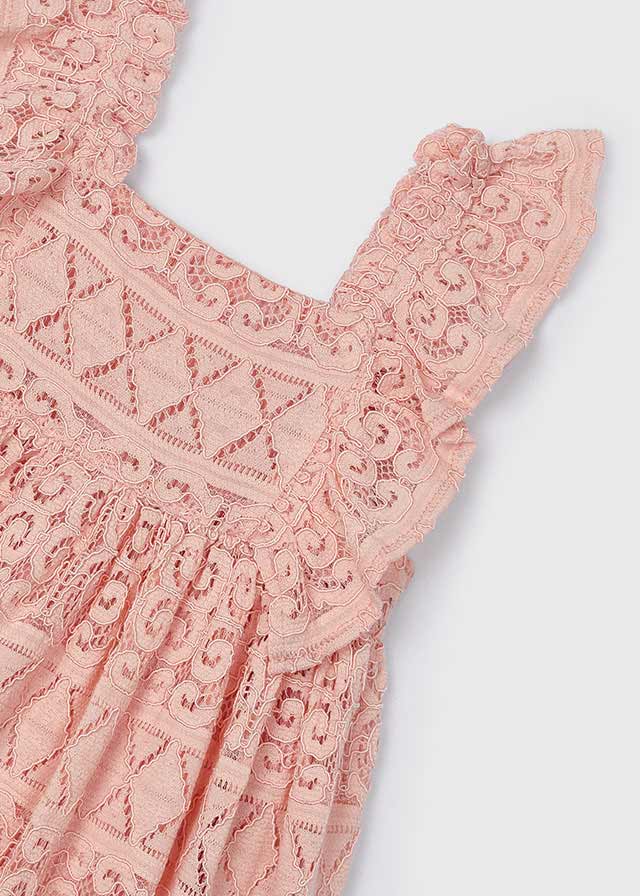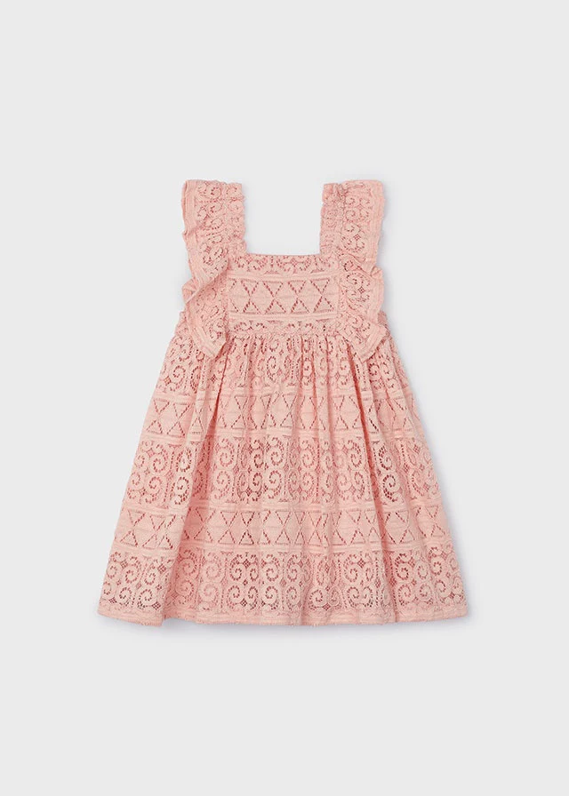 ¡Hermoso vestido de encaje de malla gruesa con detalle de olanes! ¡Un vestido basico para el guardarropa de las niñas, ya que es una prenda muy versatil pensada para cualquier ocasion! Vestido de cuello cuadrado, sin manga, corte en A y cierre de botones traseros.