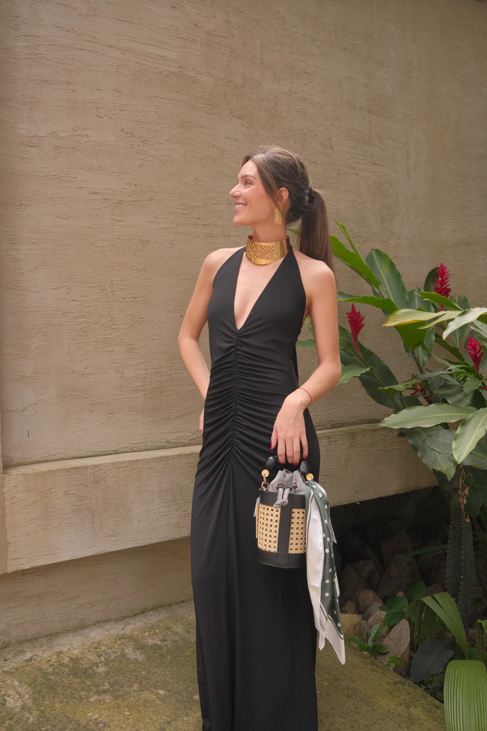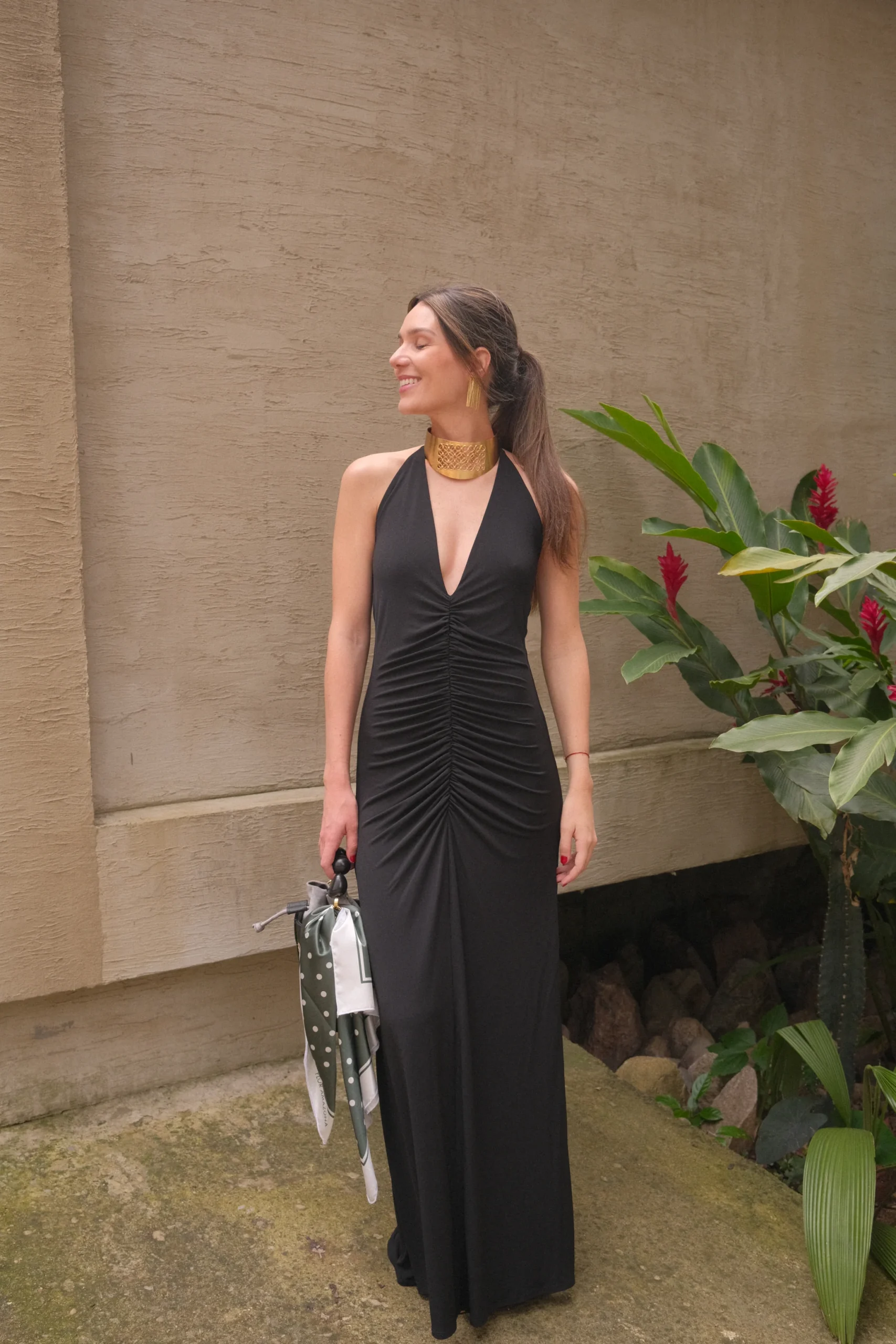 Vestido con escote profundo en V, arruchado en el centro y amarre ajustable en el cuello.