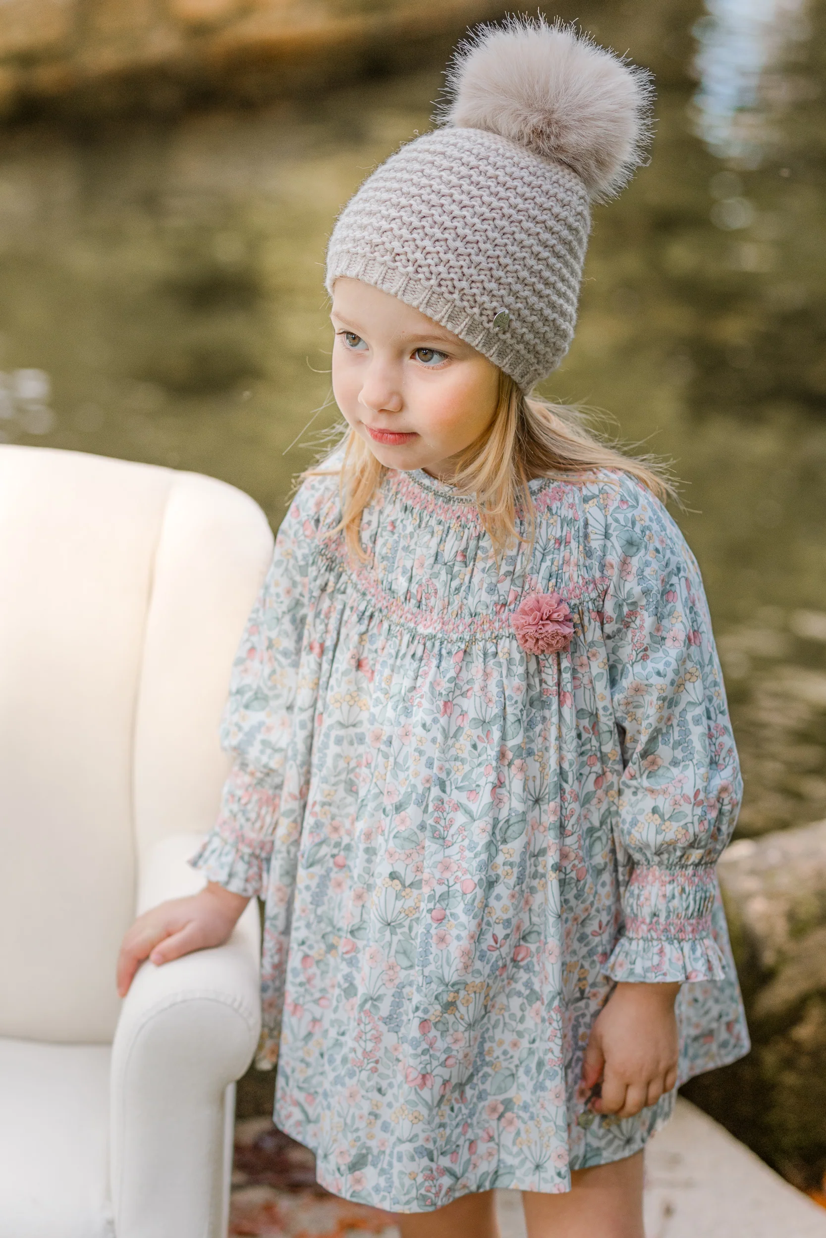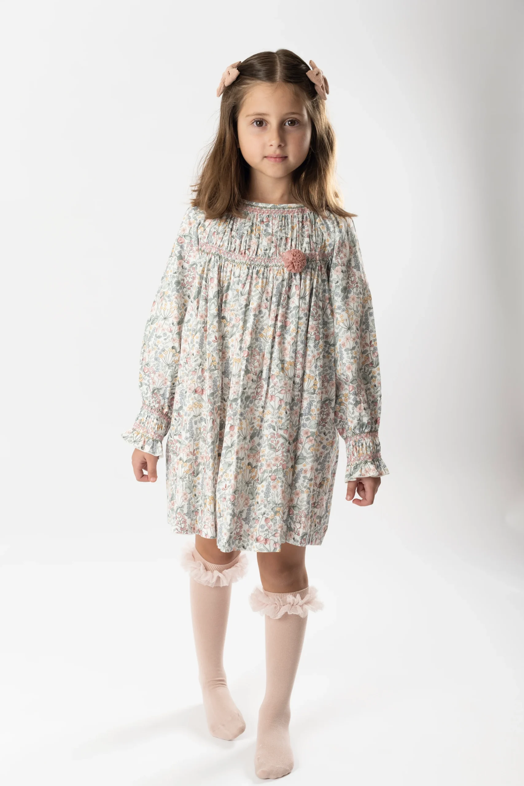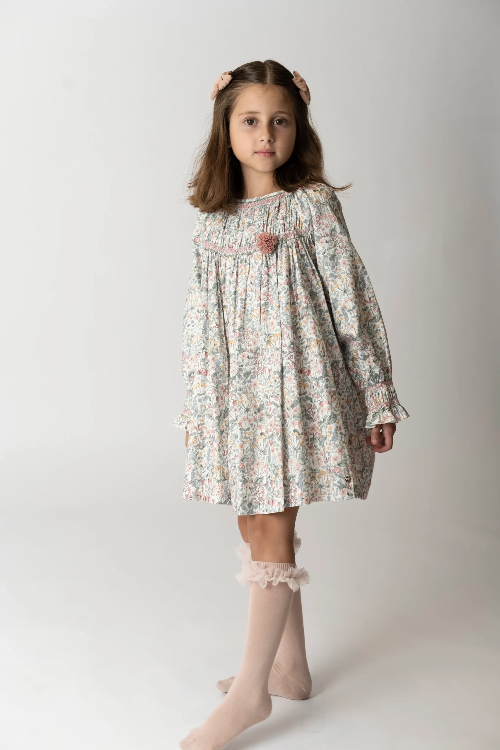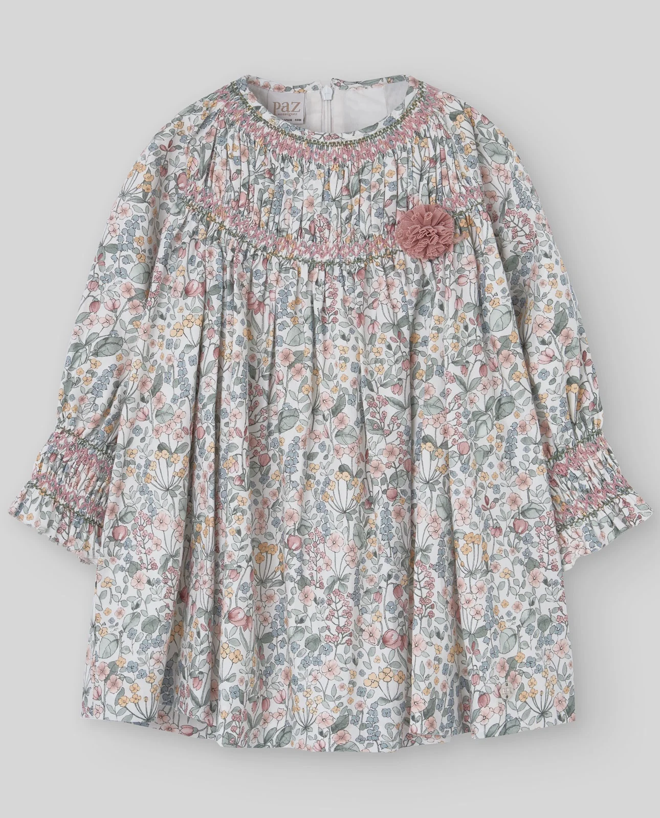 ¡Divino y encantador vestido de estampado de flores! Cuello redondo, manga larga, detalle de doble linea de smock tanto en el pecho como en las mangas, elastico en puños. Corte en A. Cierre de botones por atrás para una puesta fácil y rápida.