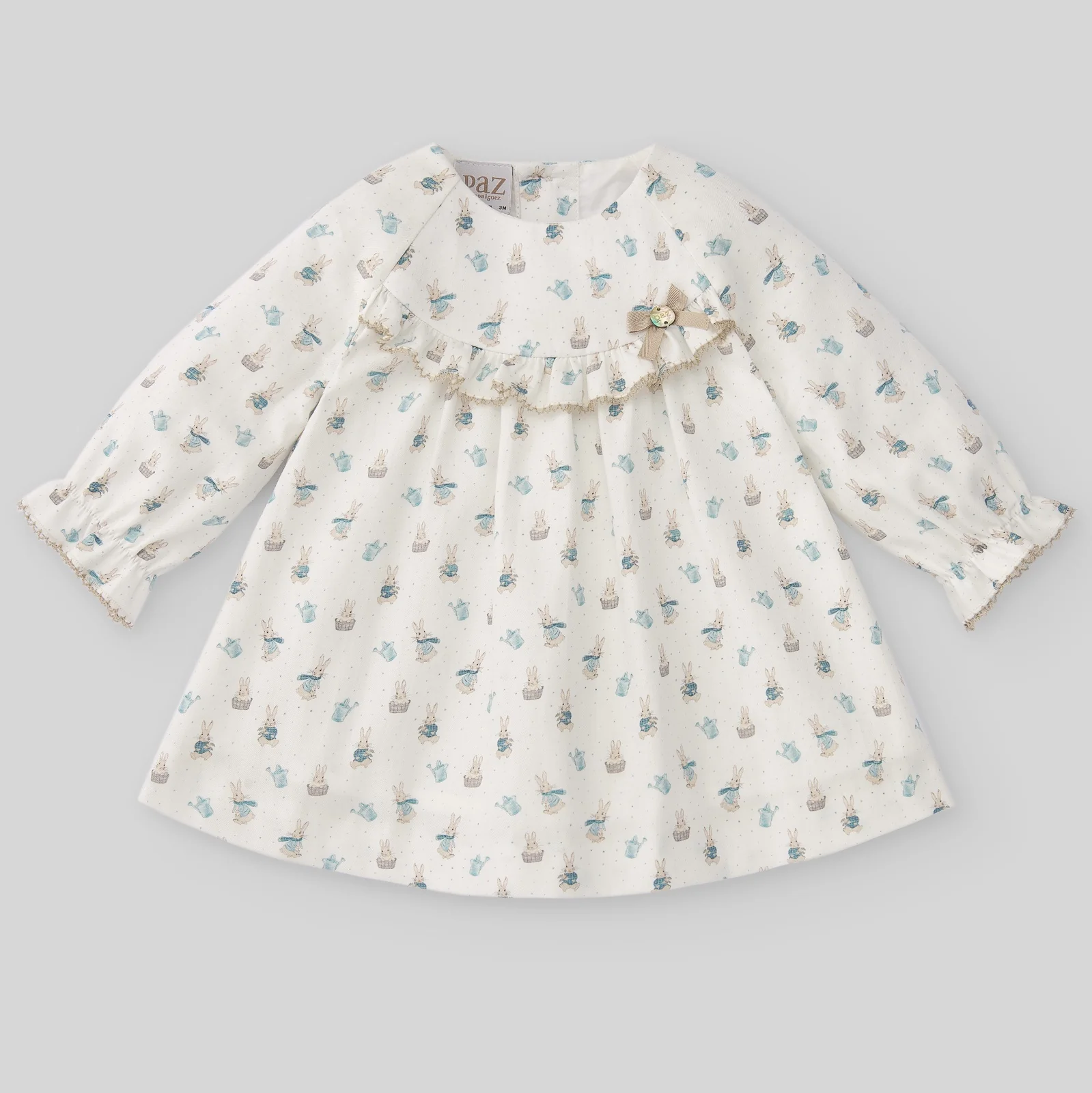 ¡Divino vestido con detalles unicos que lo hacen lucir elegante! Cuello redondo, corte en el pecho con detalle de encaje y lazo, manga larga con elastico en puños y corte en A. Cierre de botones por atrás para una puesta fácil y rápida.