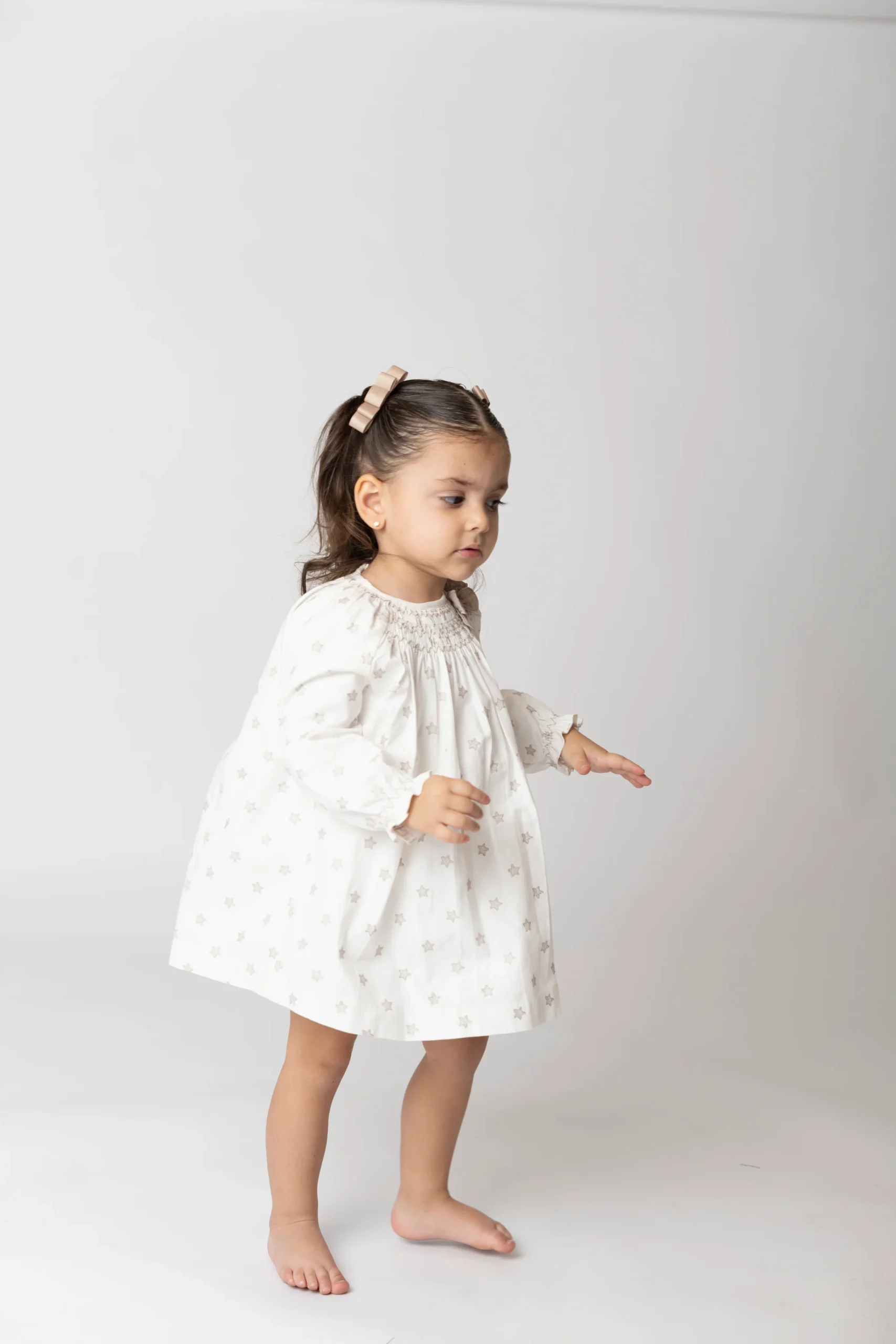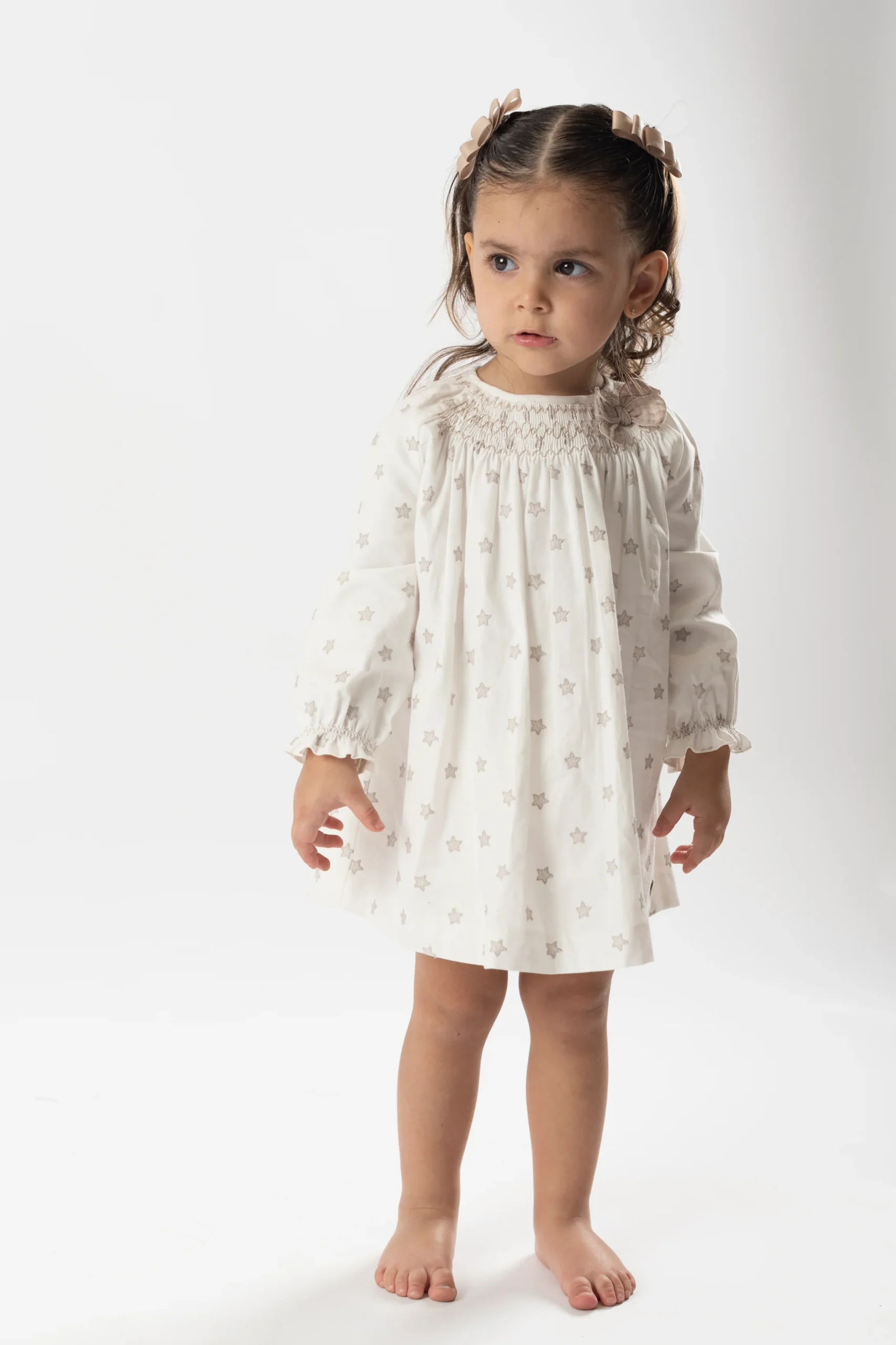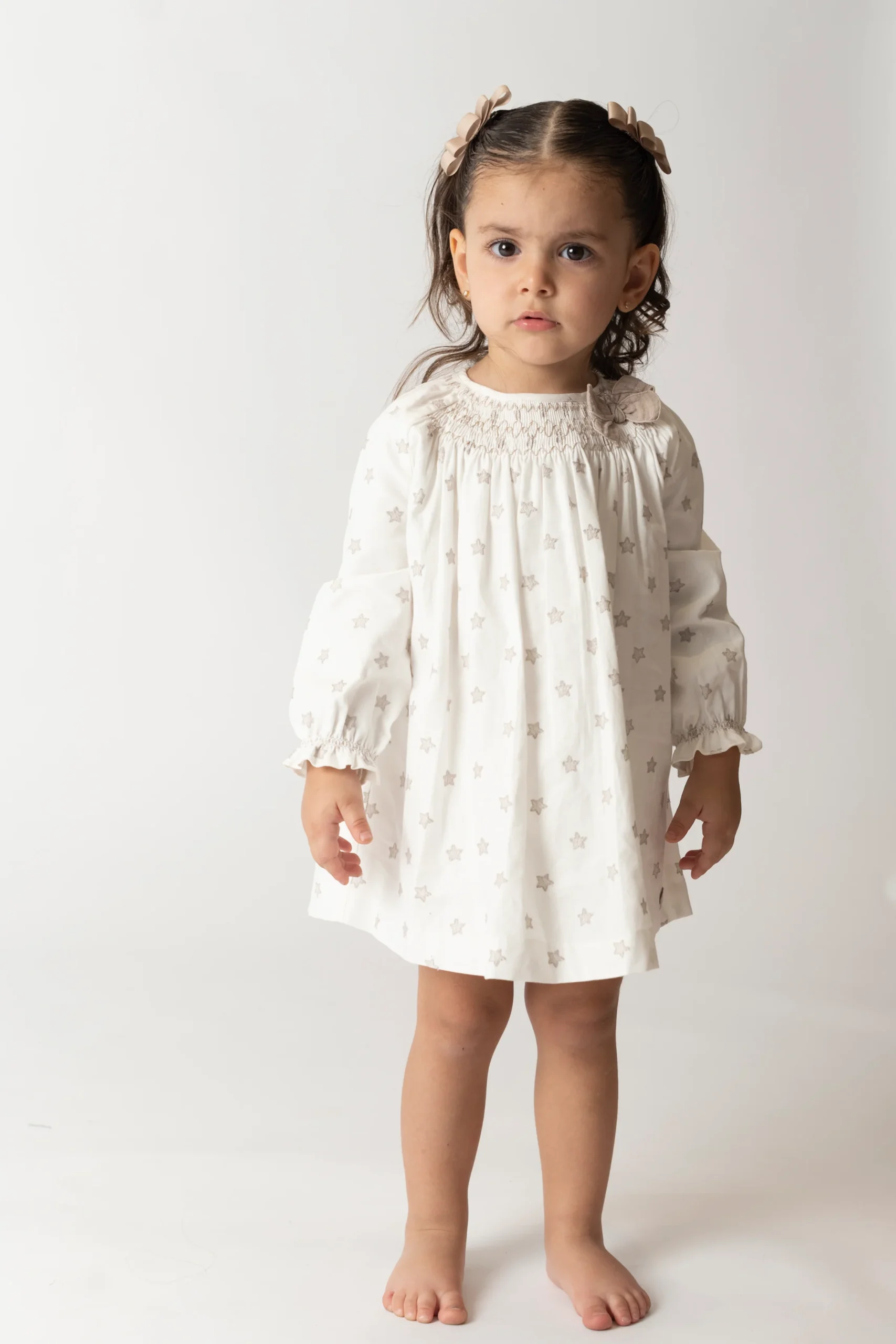 ¡Hermoso vestido de estampado de estrellas con smock! De cuello redondo con smock y lazo, manga larga con elastico en puños, fruncido con detalle de pompon en el pecho y cierre de botones por detras para facilitar su puesta.