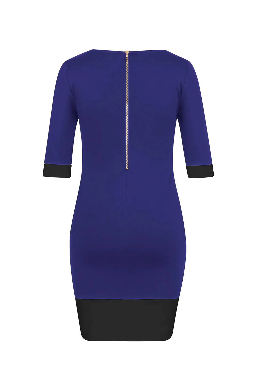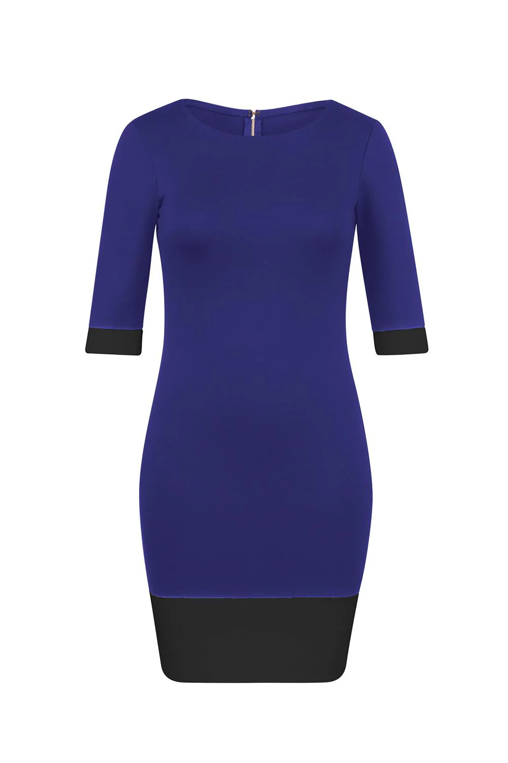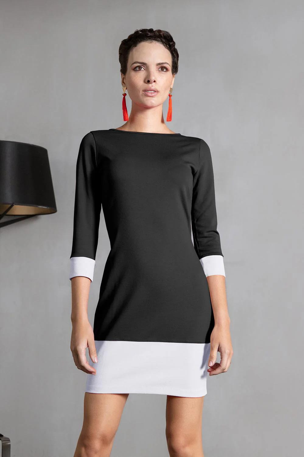 Vestido corto con cuello redondo amplio, fit ajustado, mangas 3/4, detalles a contrastes en ruedo y puños. prod. # 20-0405.