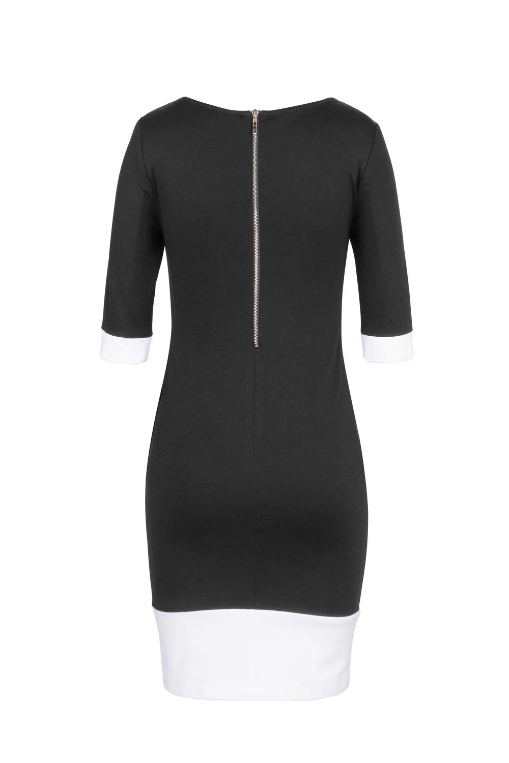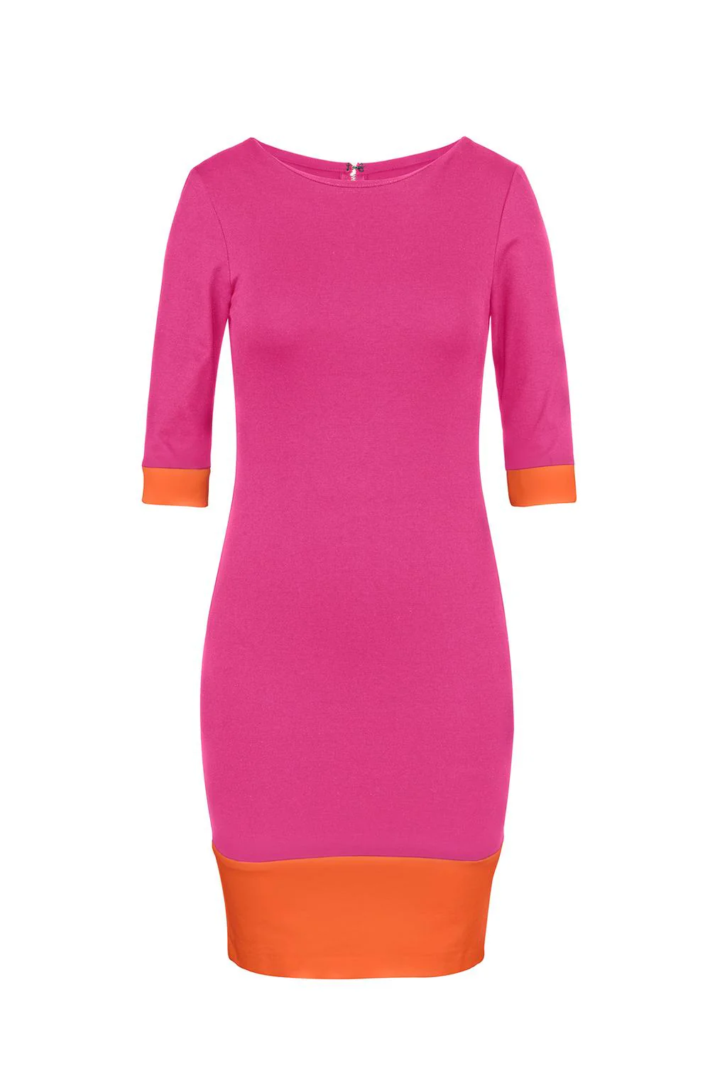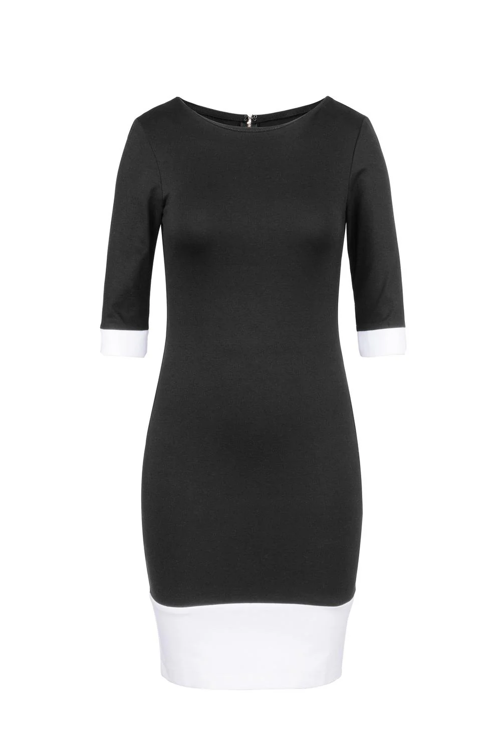 Vestido corto con cuello redondo amplio, fit ajustado, mangas 3/4, detalles a contrastes en ruedo y puños. prod. # 20-0405.