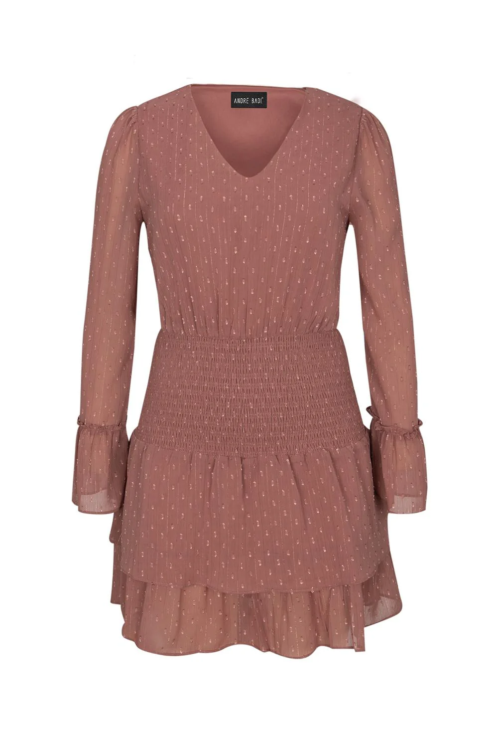 Vestido corto, tela con textura, detalles de lurex, escote en “V“, plisado en hombros, mangas largas, smock en cadera, olanes en ruedo y puños. 20-1480