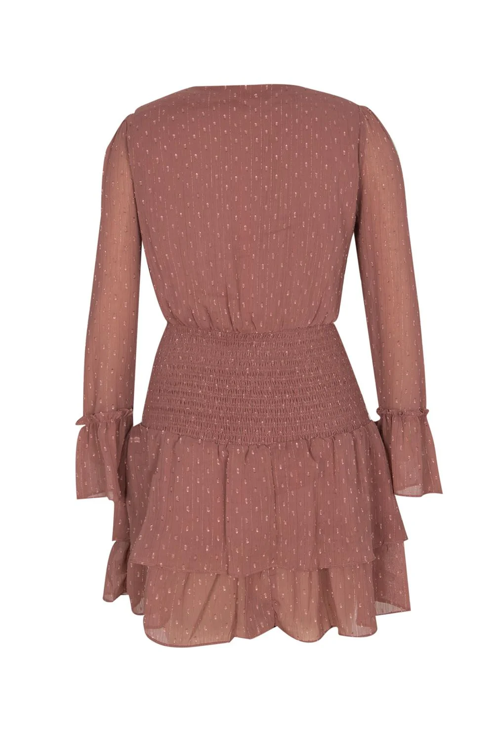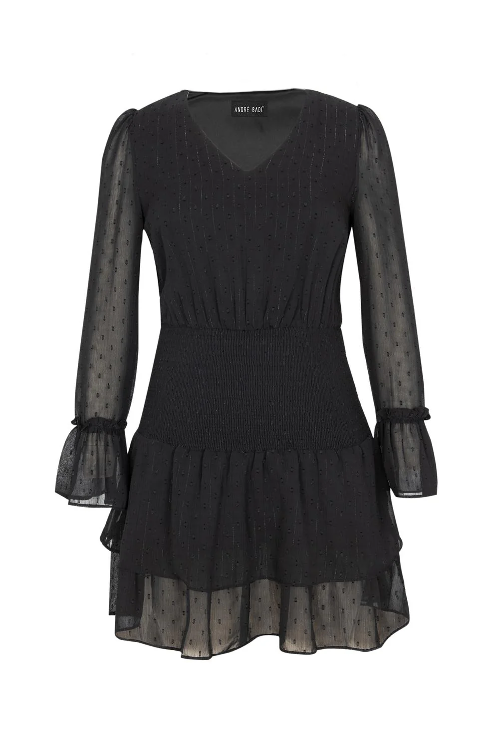 - Vestido corto, tela con textura, detalles de lurex, escote en “V“, plisado en hombros, mangas largas, smock en cadera, olanes en ruedo y puños.