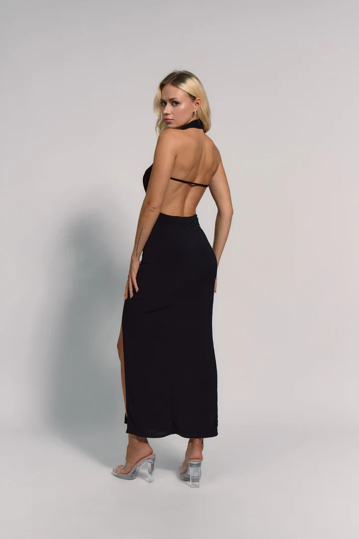 El Vestido Glam, es un vestido largo con cuello drapeado y tirantes halter. Es ajustado al cuerpo. La parte trasera del vestido es descubierta, sujeta por un tirante. Cuenta con abertura lateral en la falda.