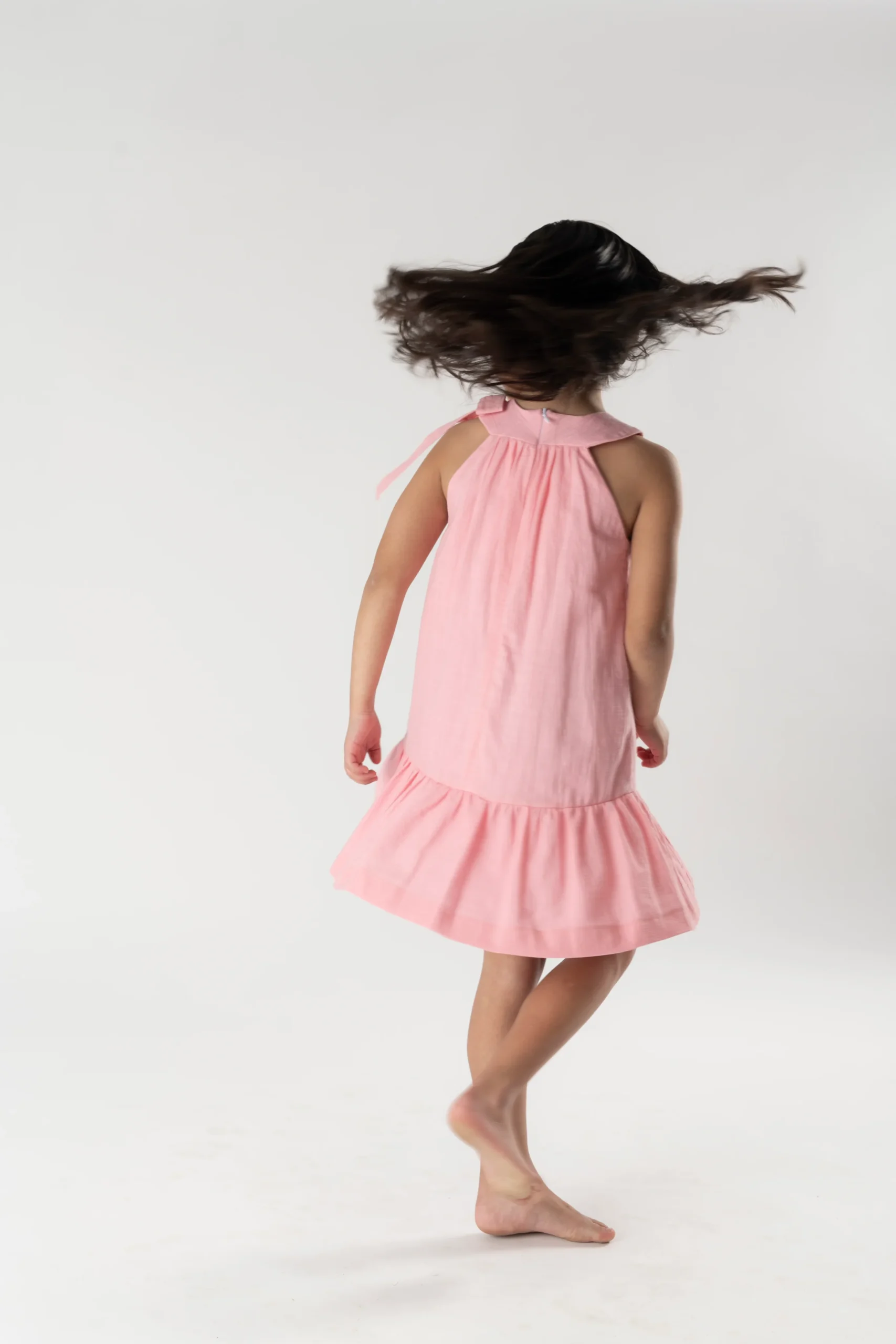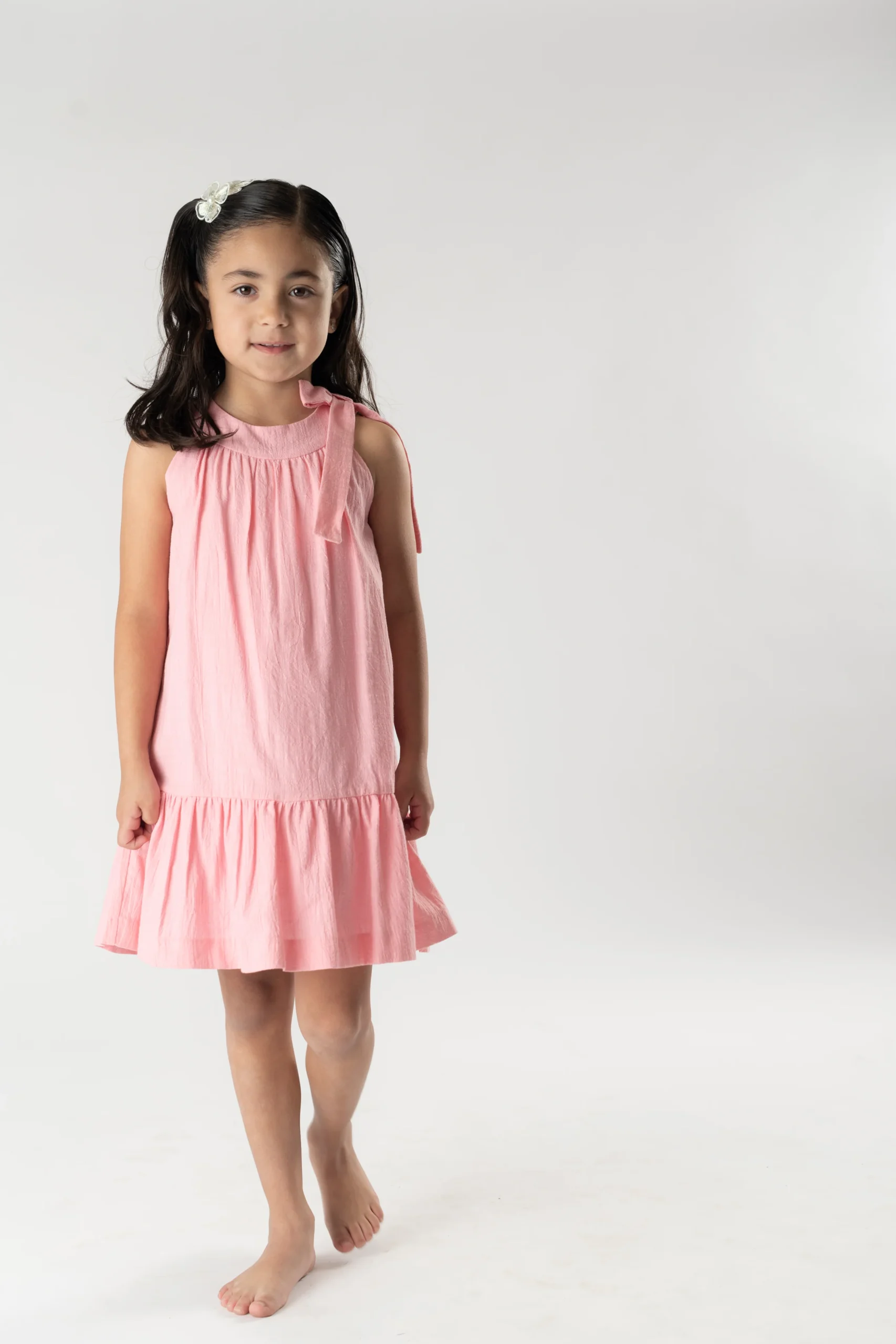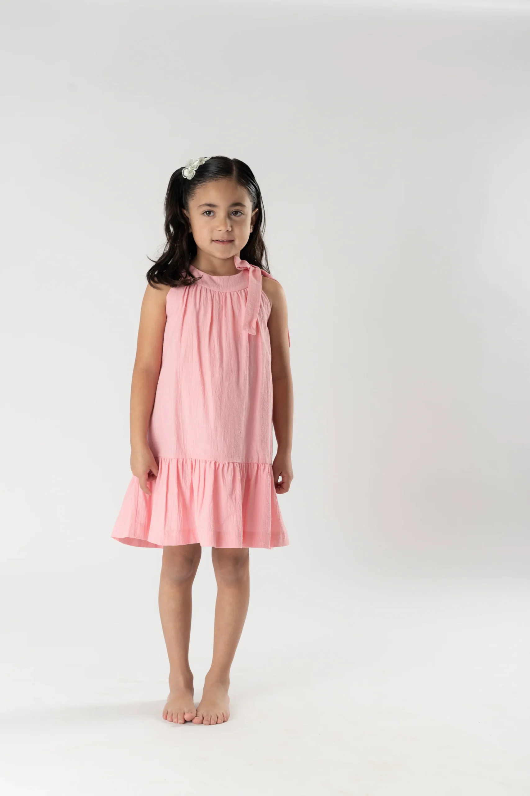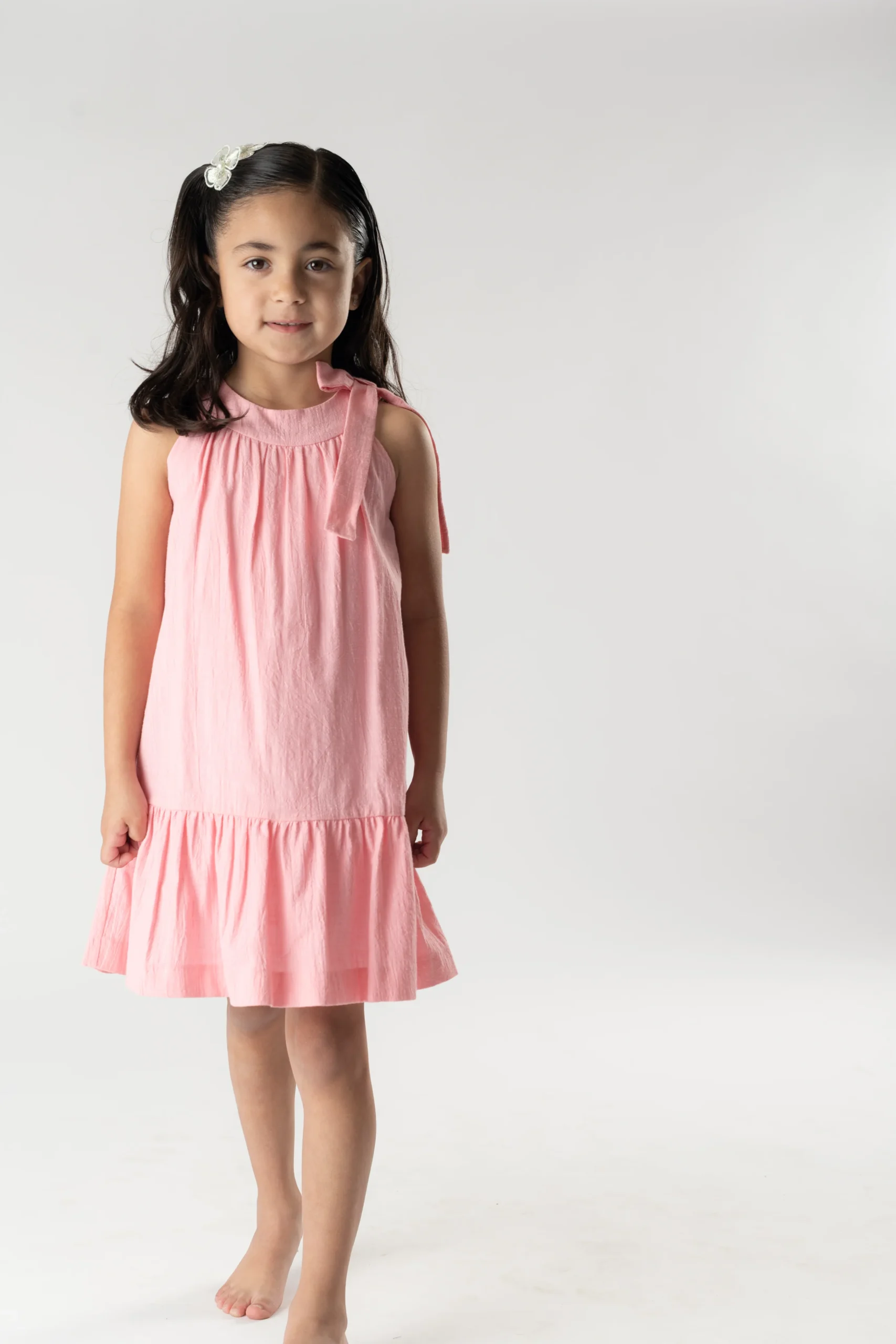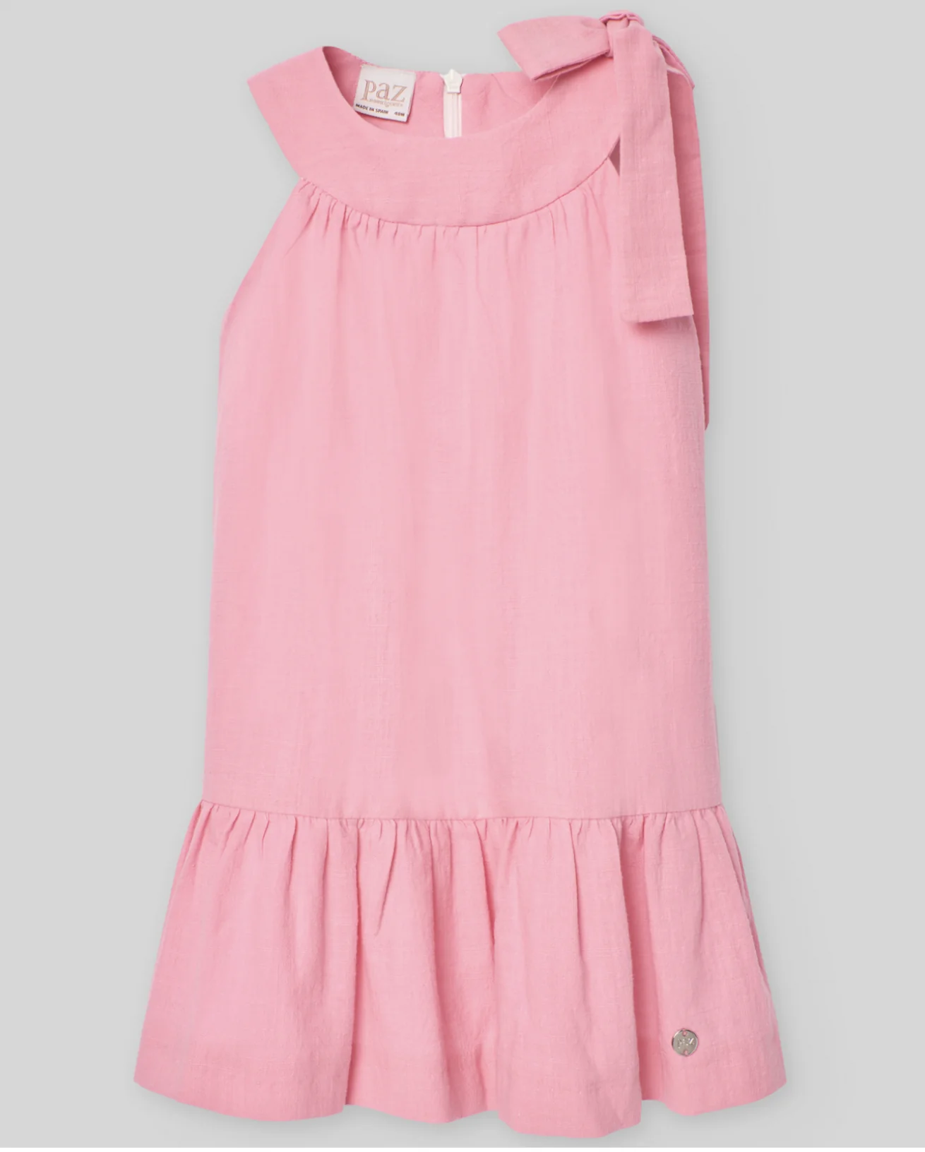 ¡Elegante y fresco Vestido ideal para ceremonias y eventos especiales! Confeccionado en una delicada bambula, presenta volante en la parte inferior. Sin mangas y con escote redondo, con detalle de gran lazada en un hombro. Cierre trasero de ziper.