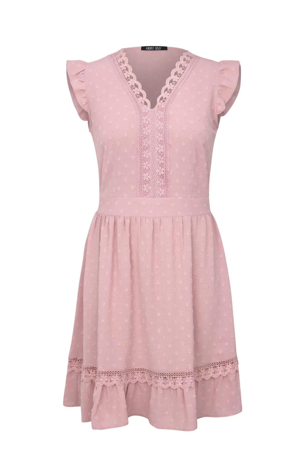 - Vestido con escote »V», pretina con elástico en espalda, aplicación decorativa, olanes, falda amplia y tela texturizada.