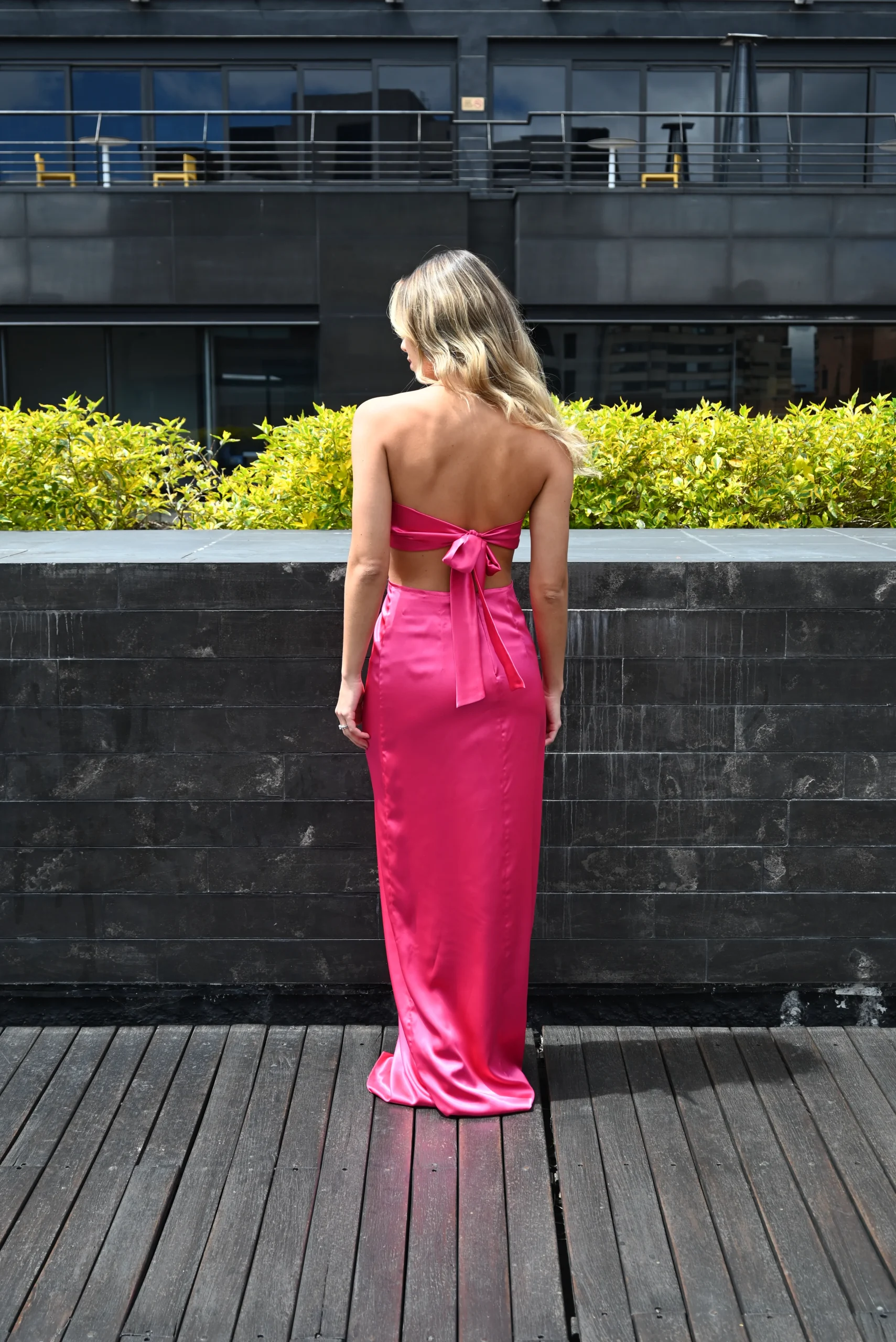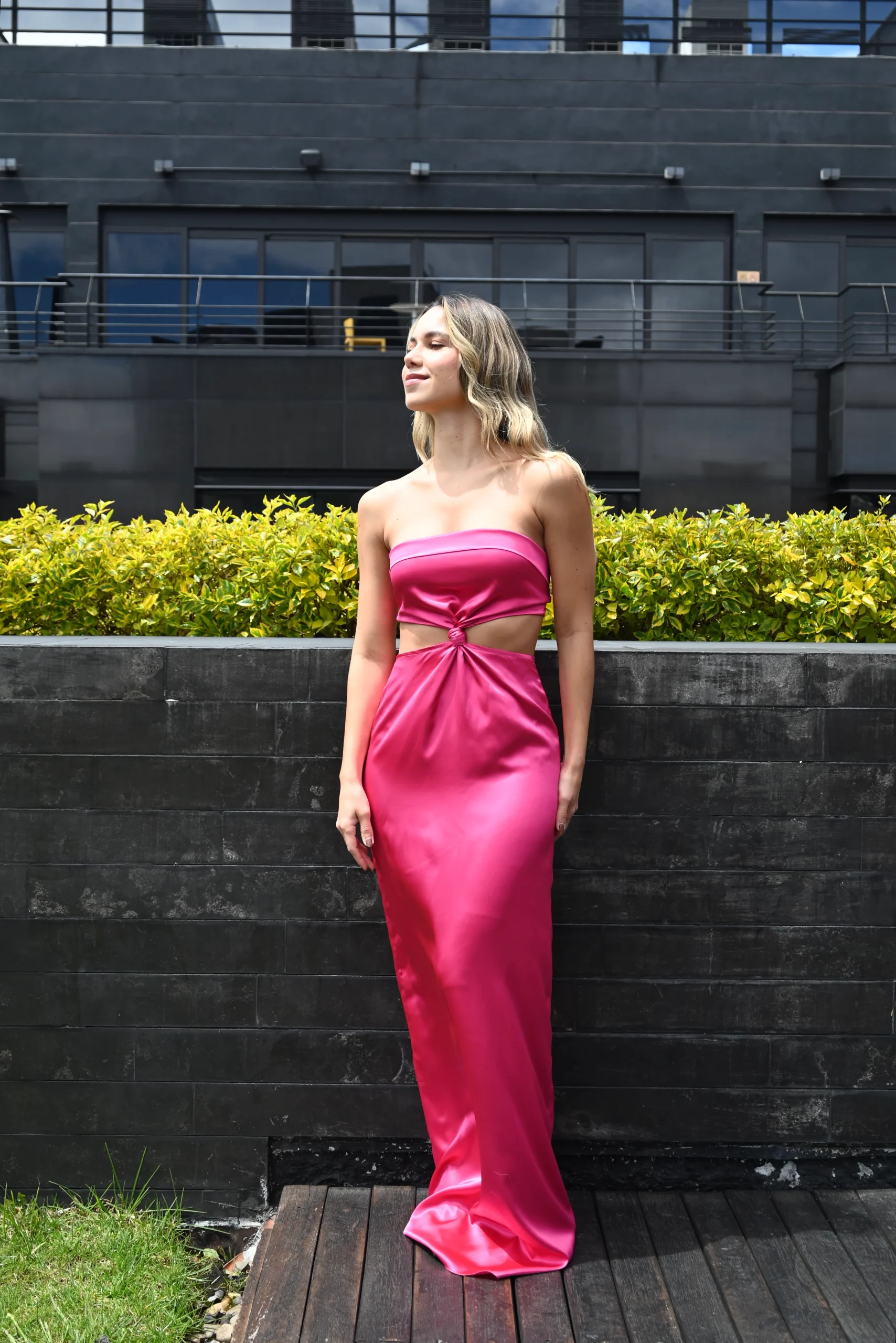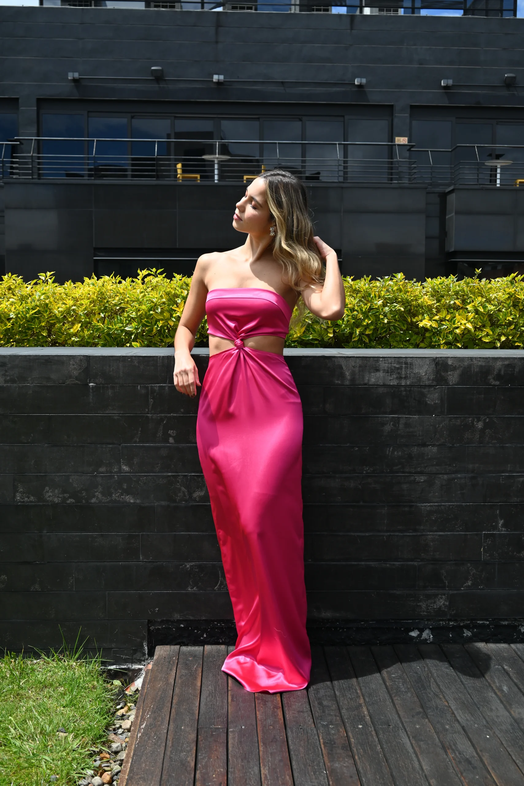 Vestido largo elegante fucsia para matrimonios elaborado en tela seda/polyester.