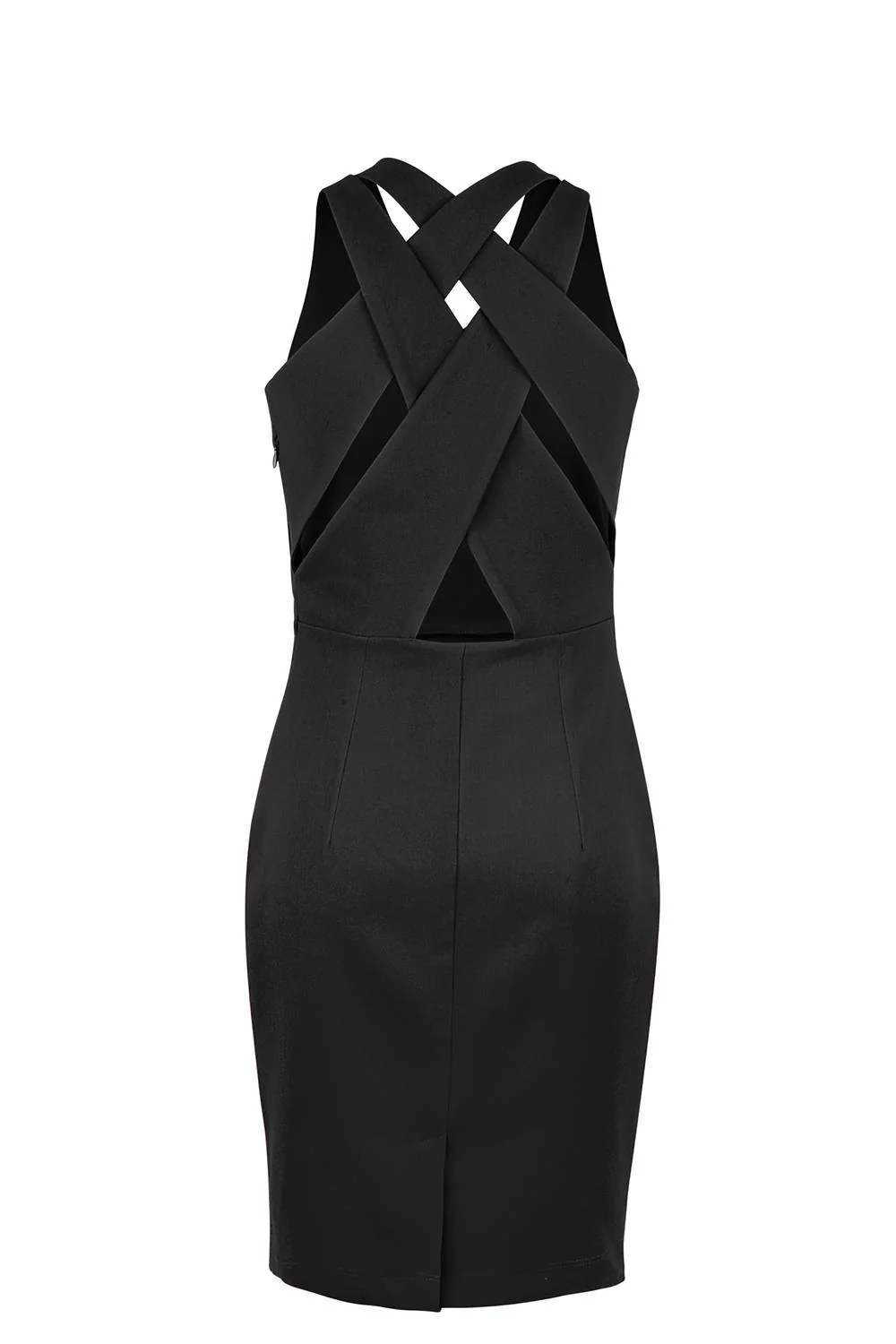 - Vestido ajustado con escote «V» frontal, detalle de tiras cruzadas en espalda y cierre invisible al costado.