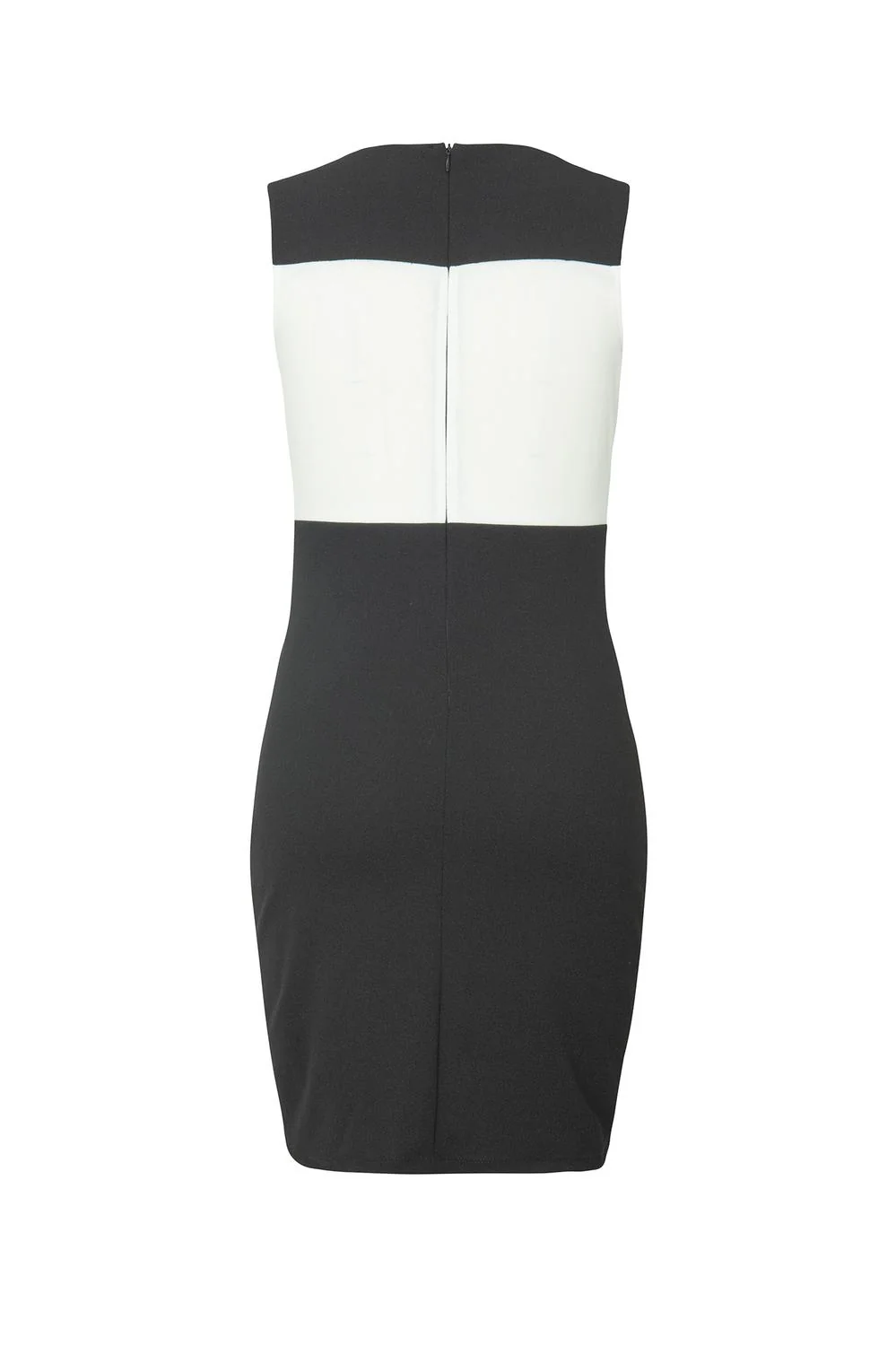 - Vestido con bloques de color, escote redondo, sin mangas y cierre en espalda.