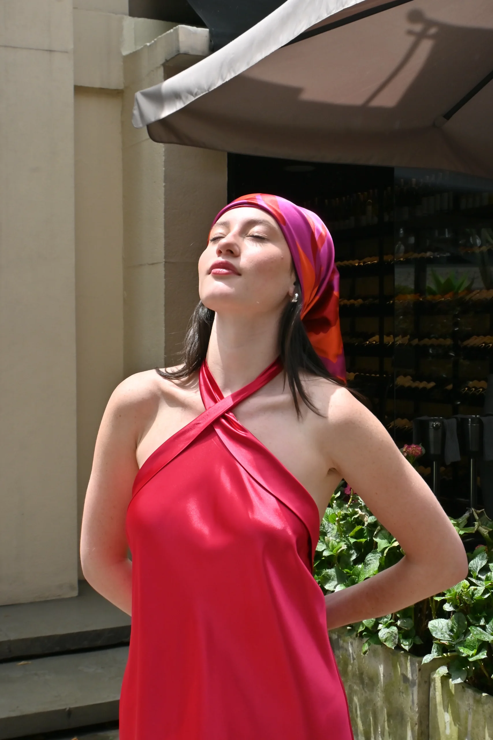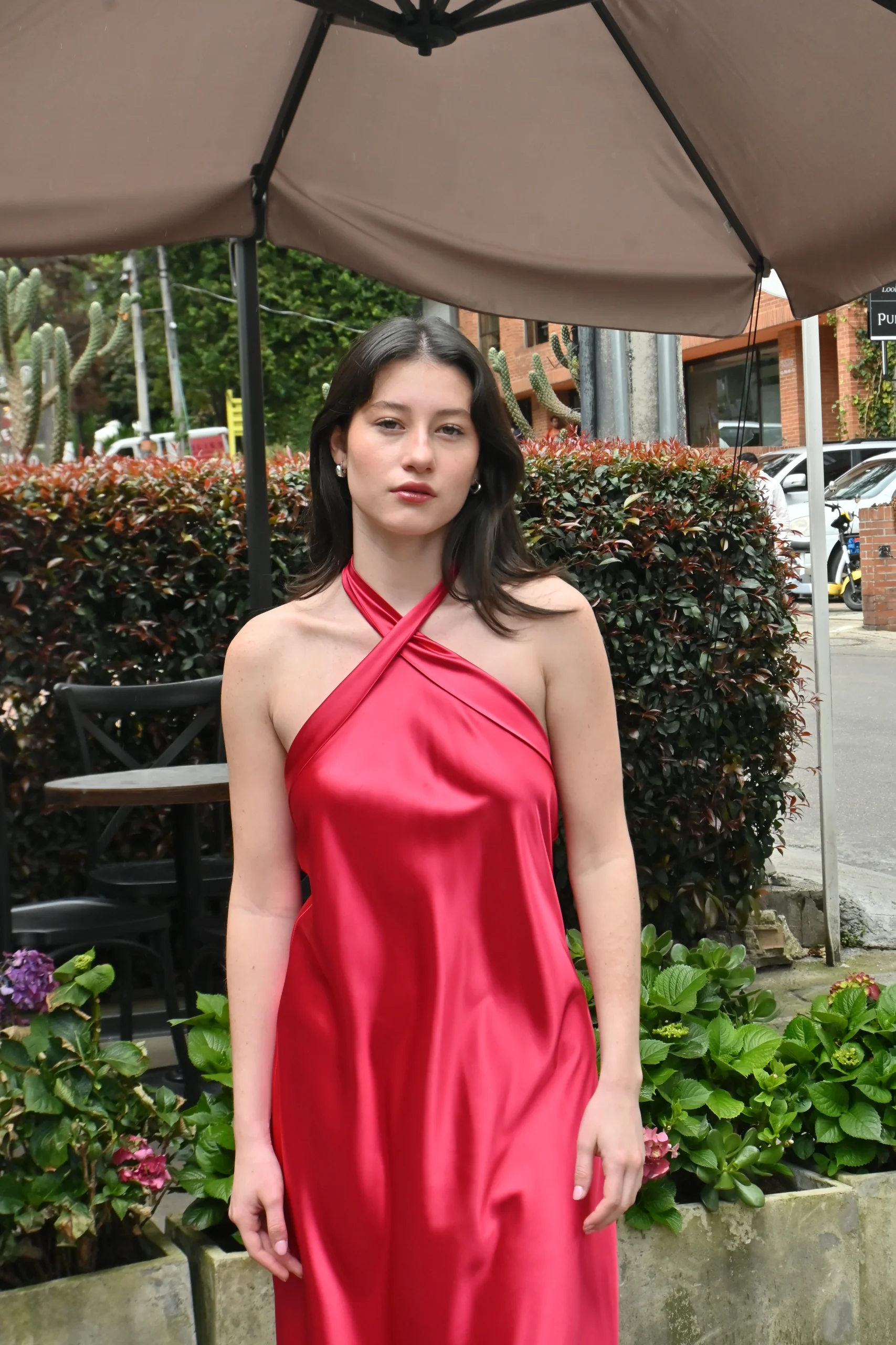 Vestido largo color rubí para matrimonio elegante en seda con espalda descubierta y tiras gruesas.
