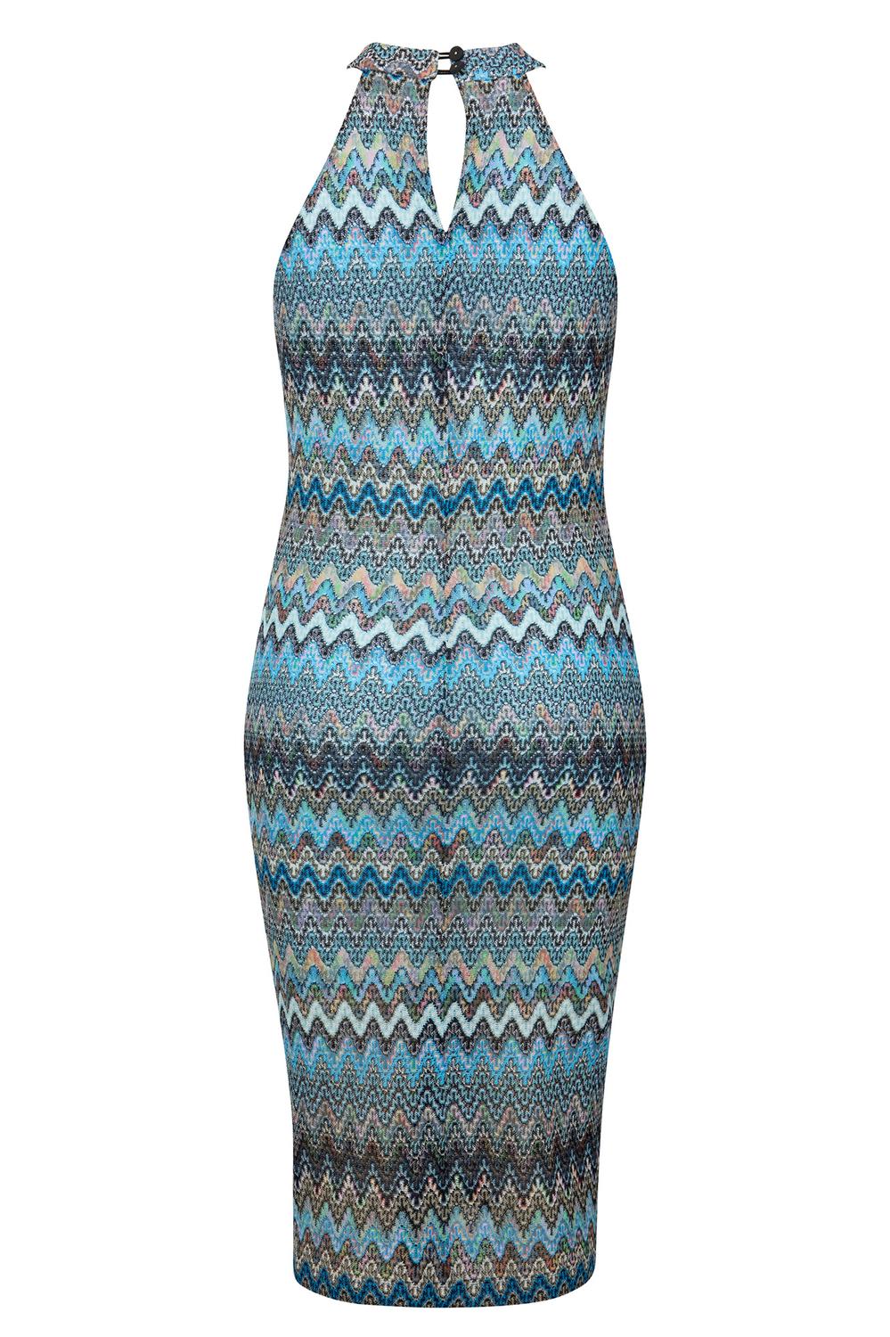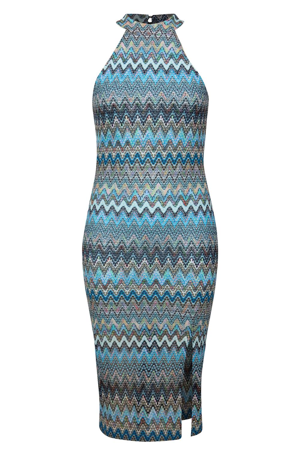 Vestido tejido en combinación de colores con escote tipo halter y abertura frontal.
