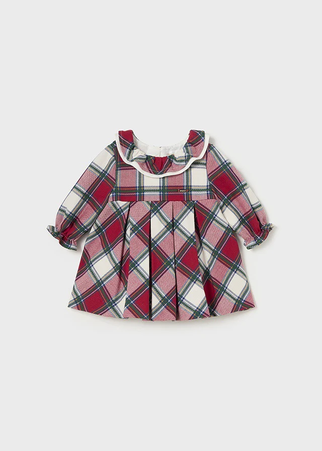 ¡Hermoso vestido de estampado de cuadros! De cuello redondo con olan, manga larga con elastico en puños, corte en la cintura y falda con tablones y cierre de zíper por atrás para una puesta fácil y rápida.