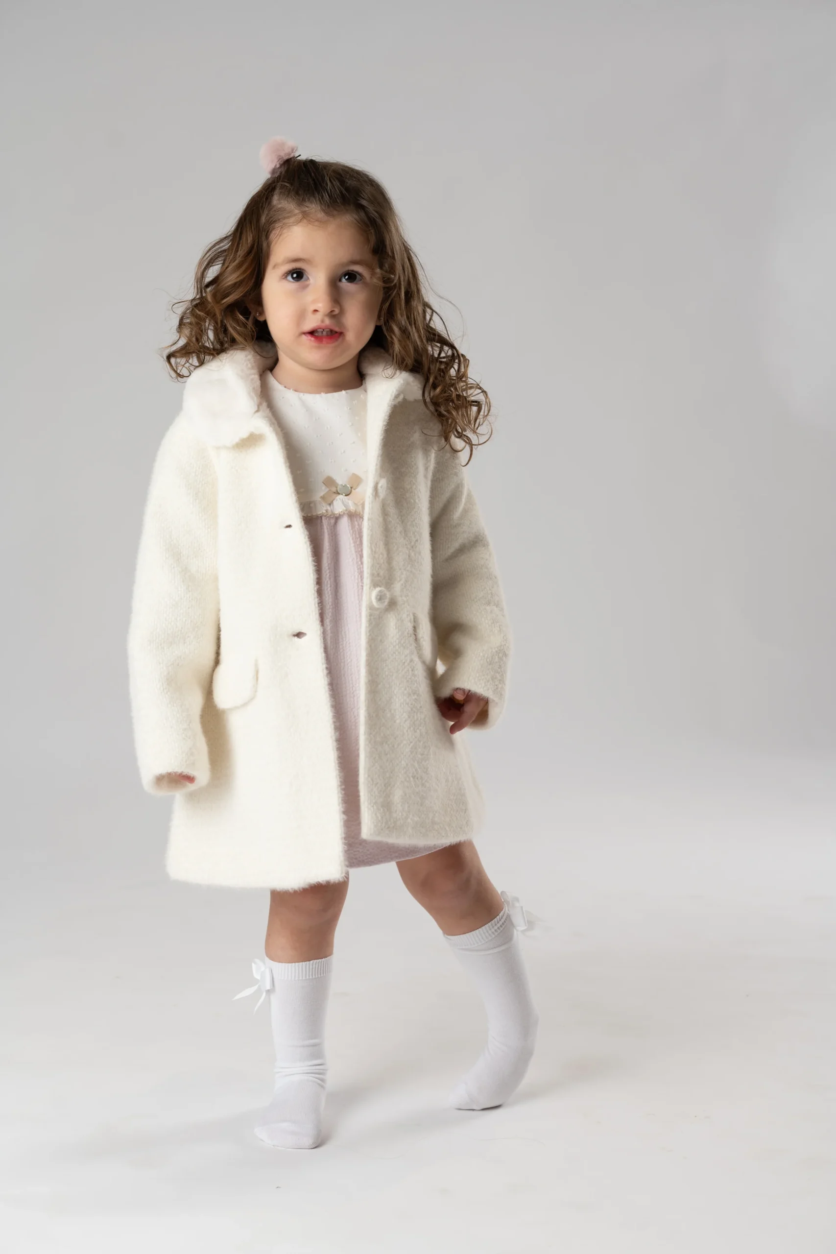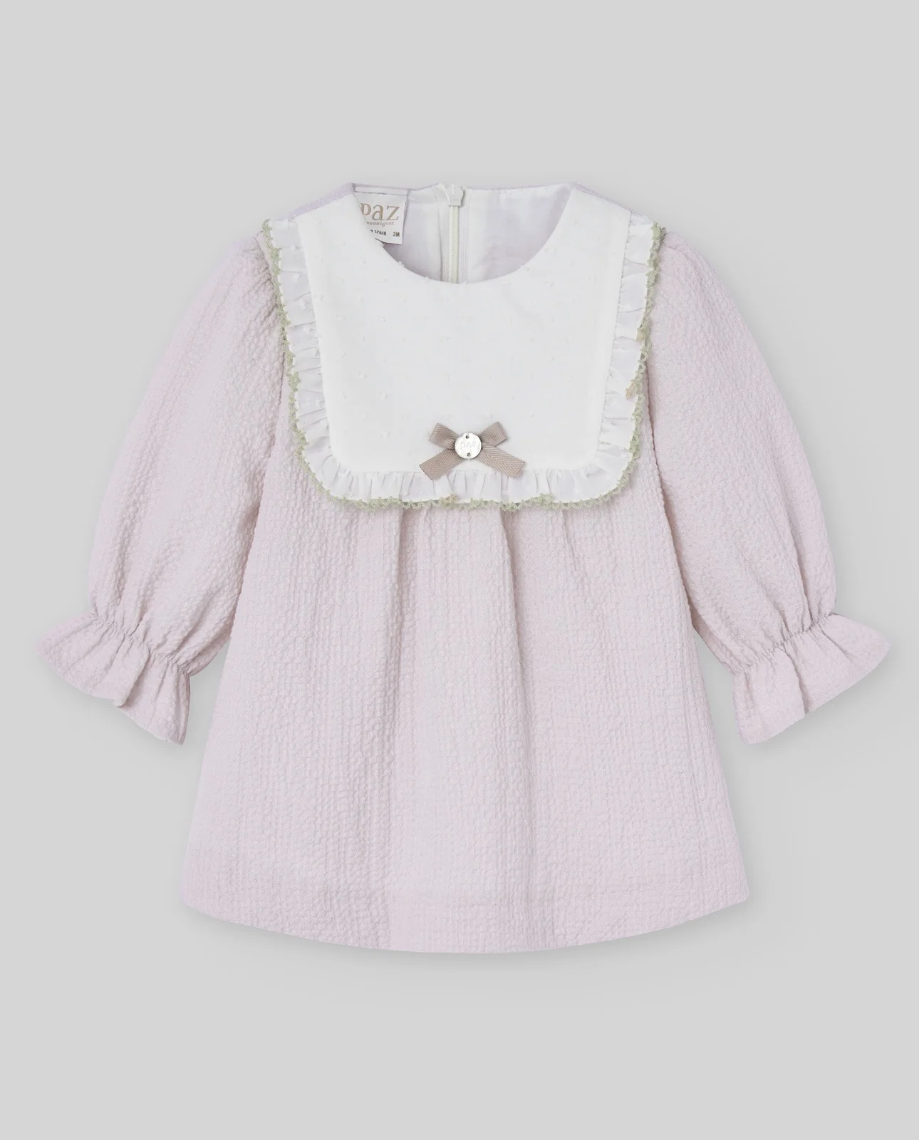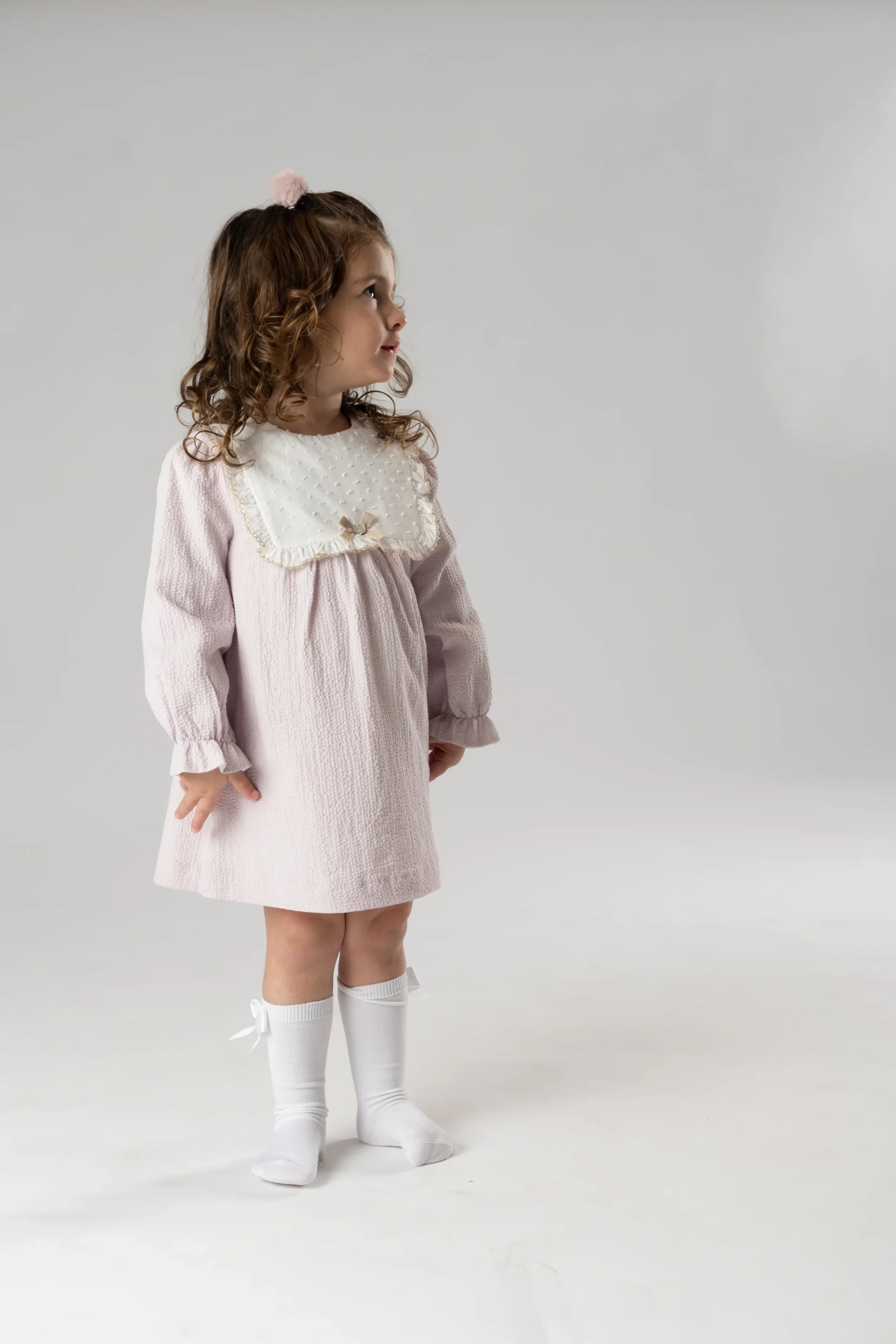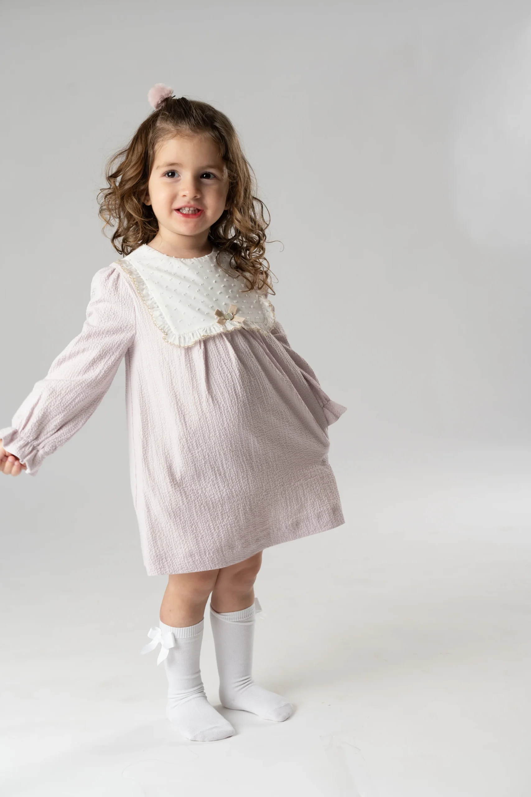¡Divino y delicado vestido de color liso con detalle de plumety con encaje!¡Pensado para tus eventos/ceremonias mas importantes! De cuello redondo, manga larga, cuadrado con orilla de encaje y lazo, color marfil, falda con vuelo, cierre de botones por la parte de atras. Detalle de orillas con encaje.