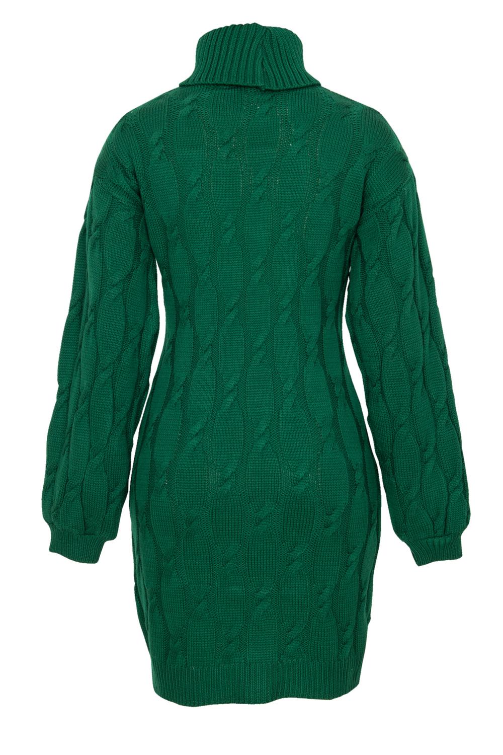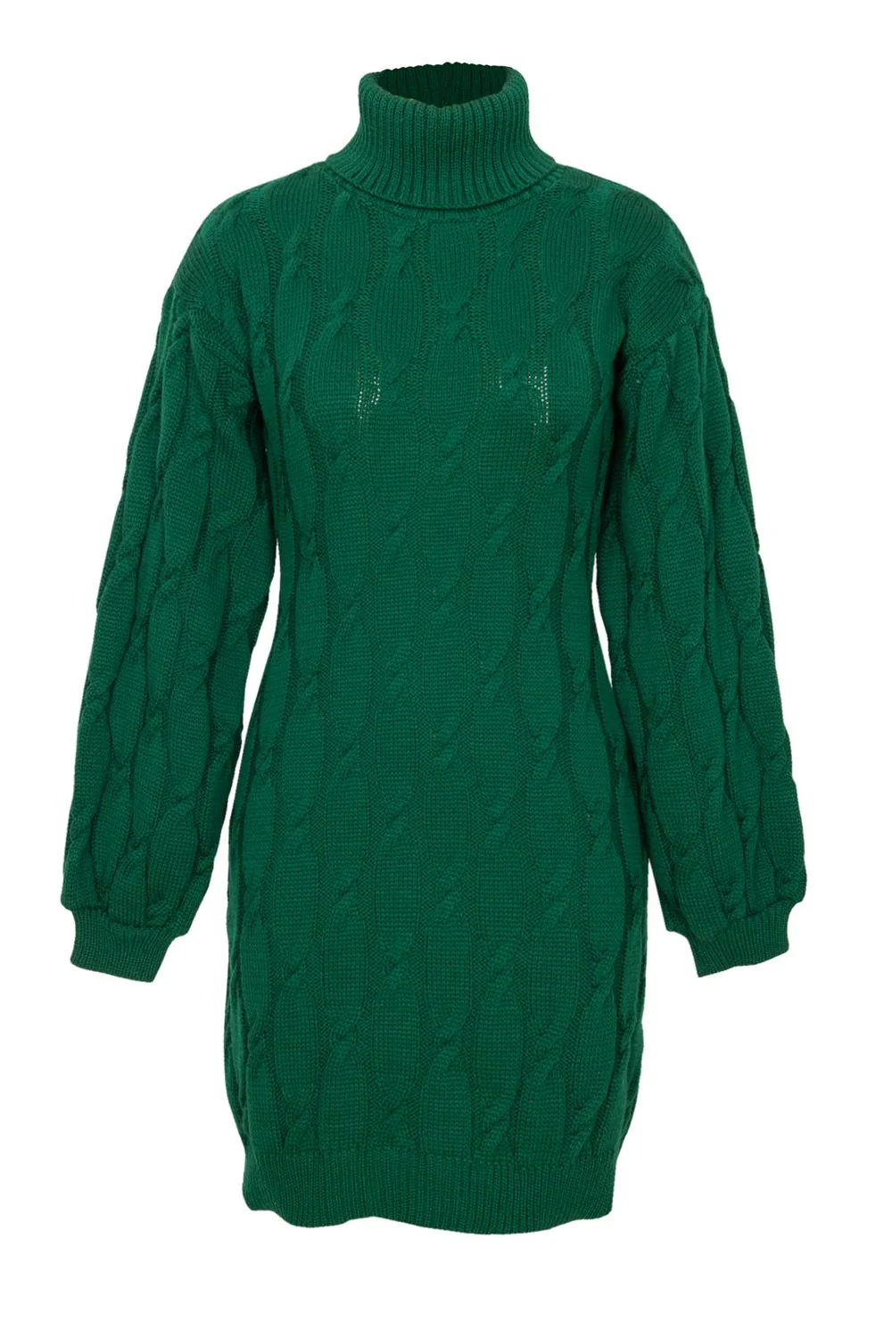 - Vestido corto con cuello tortuga, diseño tejido en relieve y mangas largas abombadas.