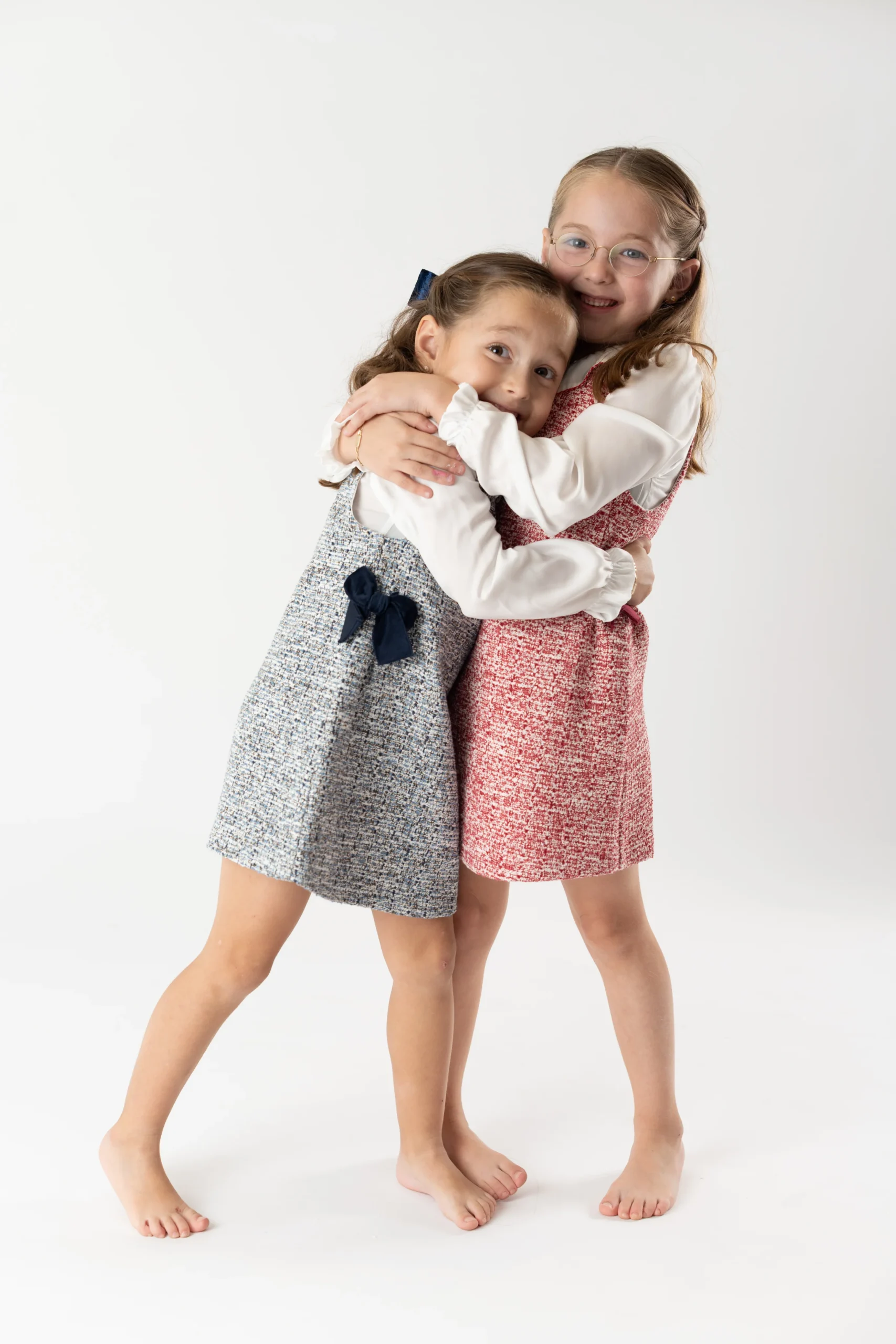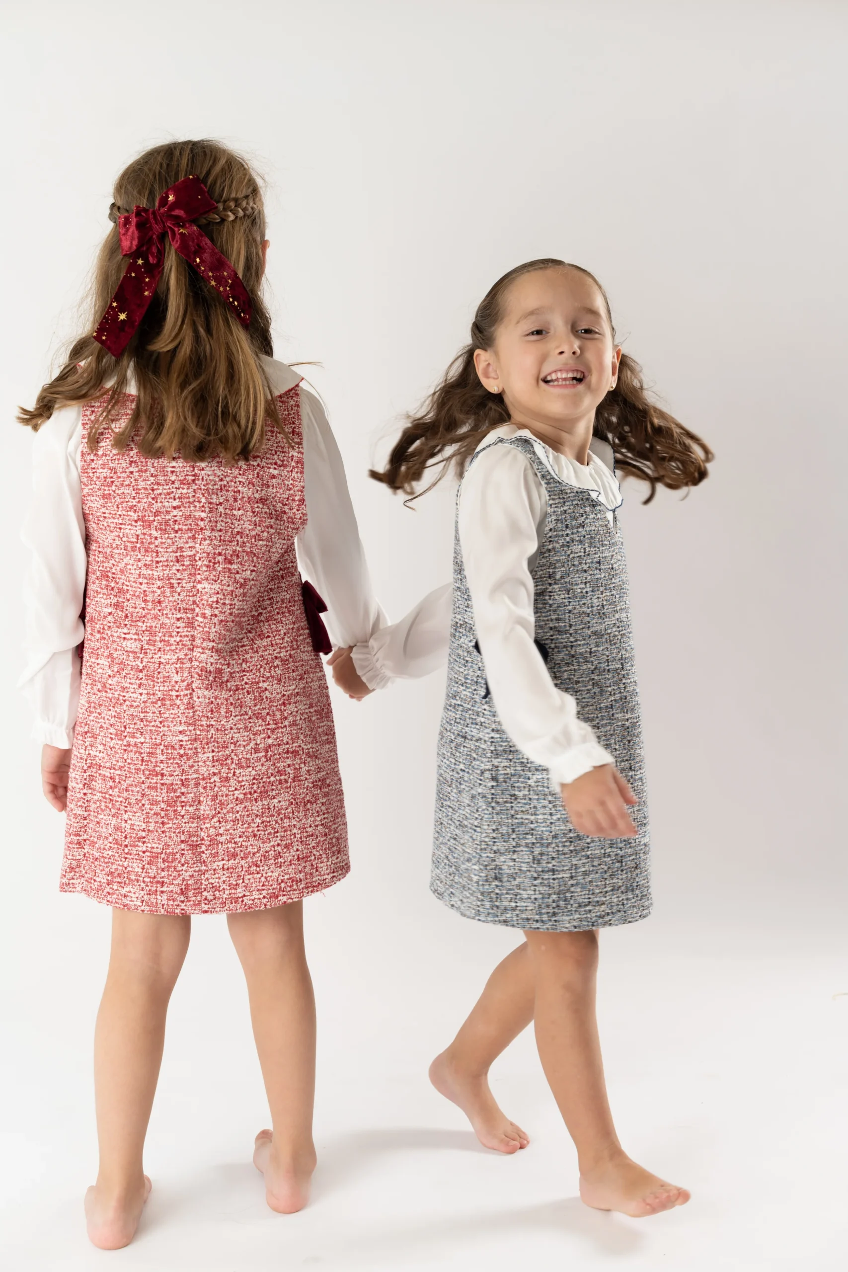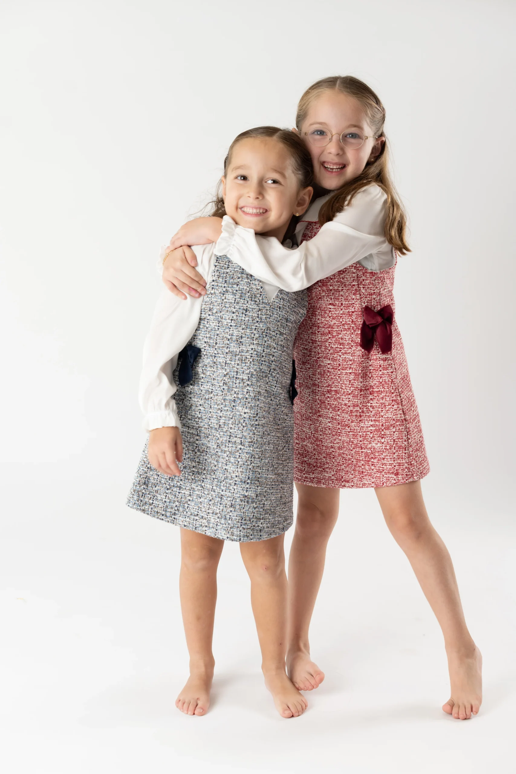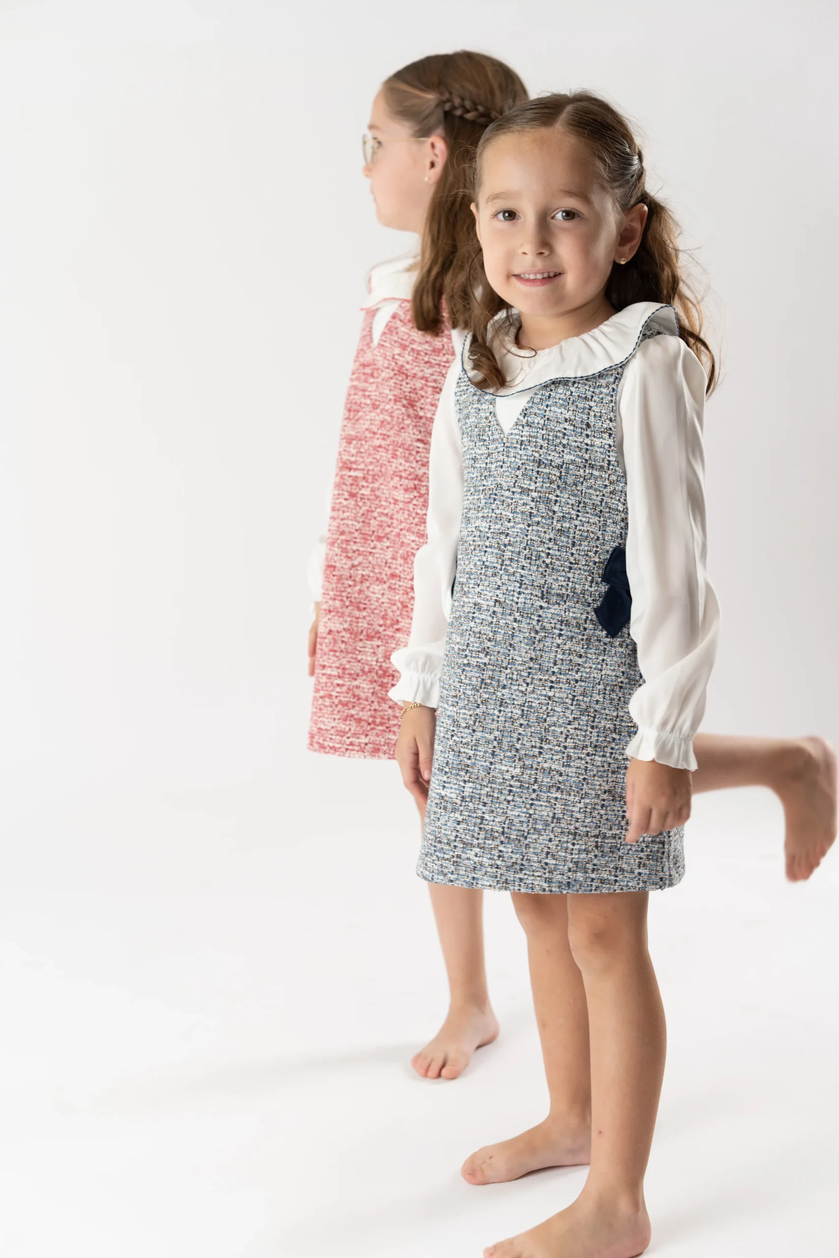 ¡Divino vestido de confección combinada en distintos tejidos para conseguir un diseño único y especial! De manga larga con puños elásticos en el interior, cuello redondo con olan, cierre con ziper en la parte trasera para una puesta ágil y rápida.