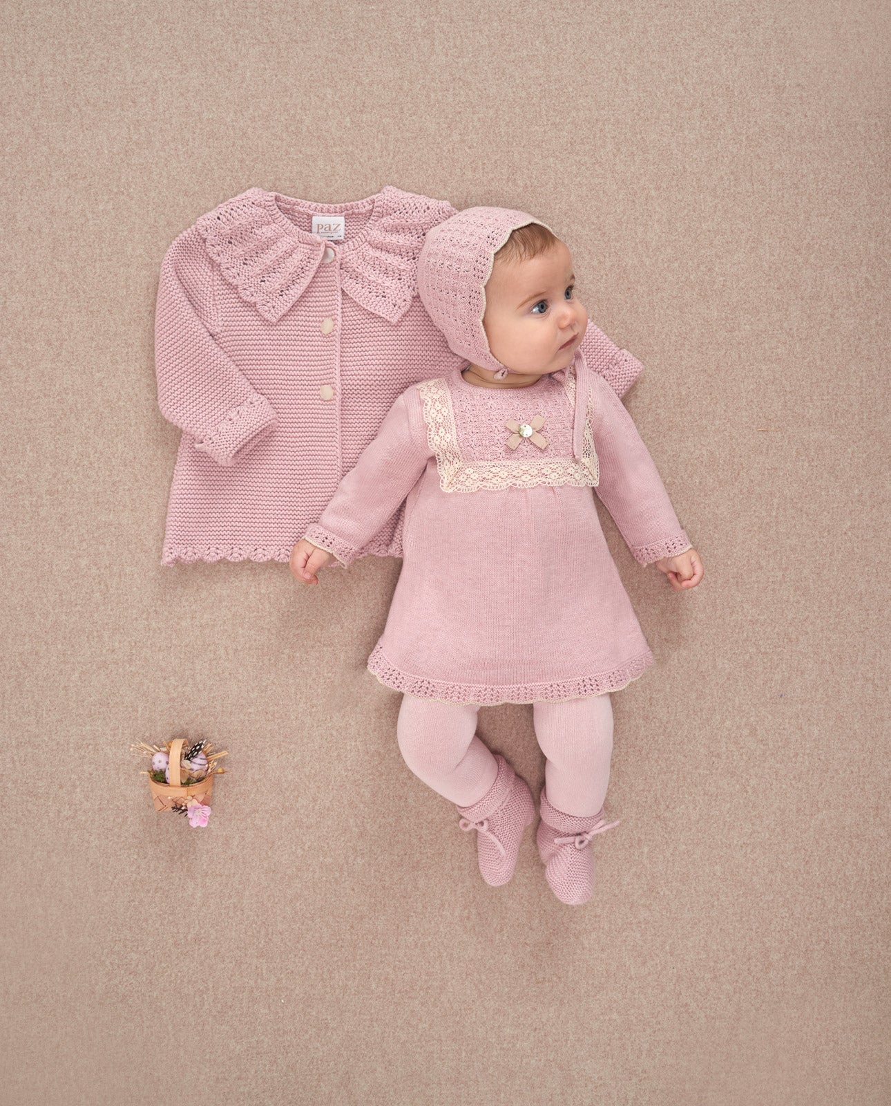 ¡Divino y delicado vestido tipo tejido con detalles unicos! De cuello redondo, manga larga, cuadrado con orilla de encaje y lazo en el pecho, cierre de botones por la parte de atras. Detalle de orillas en ondas.